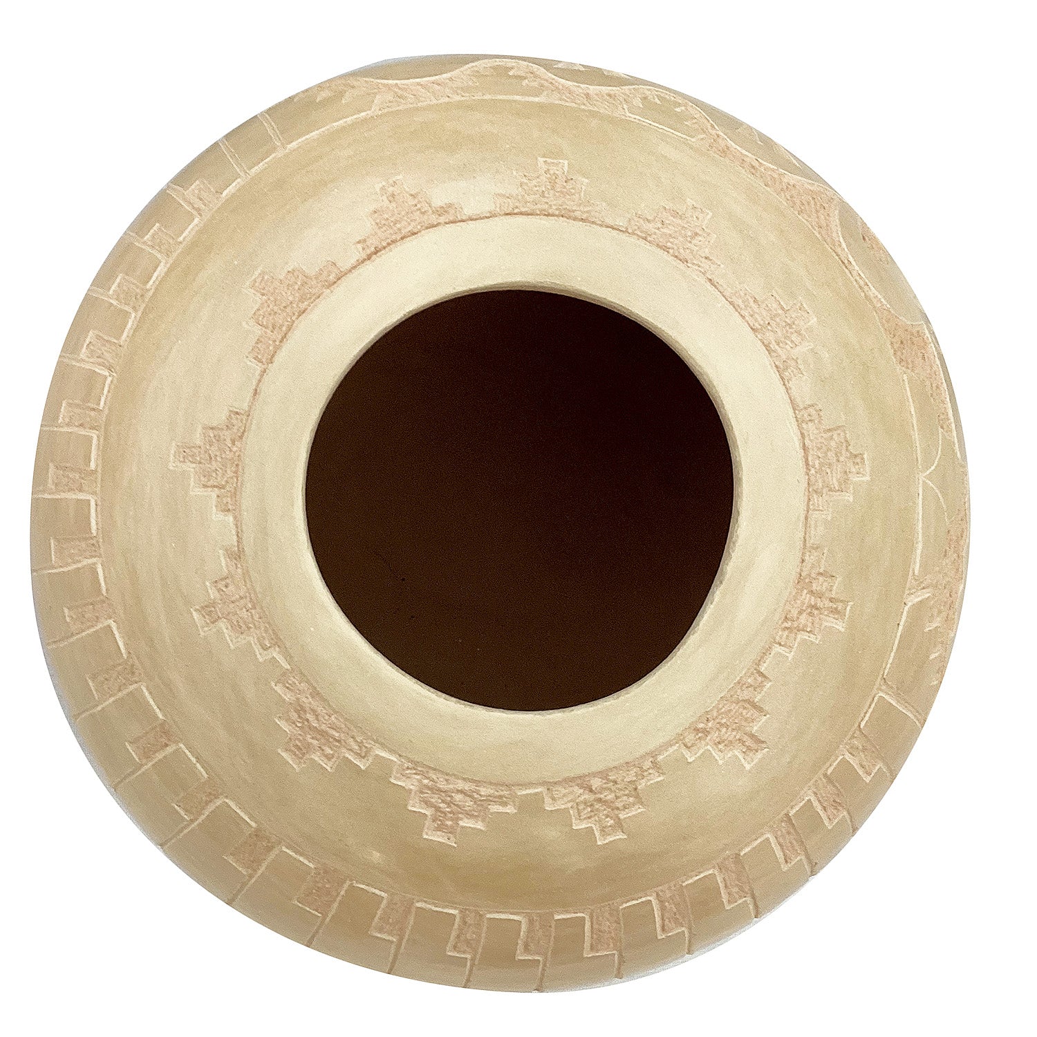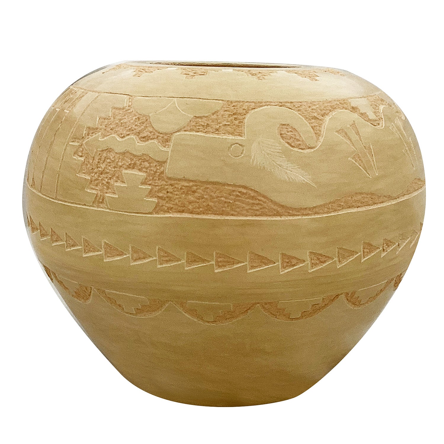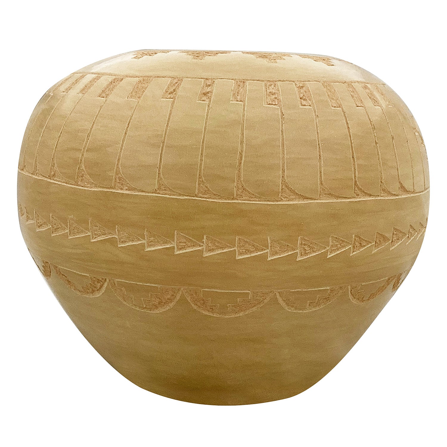 Pueblo artist Lawrence Yepa is another talented potter from Jemez. His style is a combination of smooth polished surfaces with unique carved designs. As technology and expansion grew pottery went through a very rough transition. It was once the essential pieces to carry water, store food and had a utilitarian function. However, that technology and expansion began to bring many travelers through the Southwest and pottery now has become collectible art.