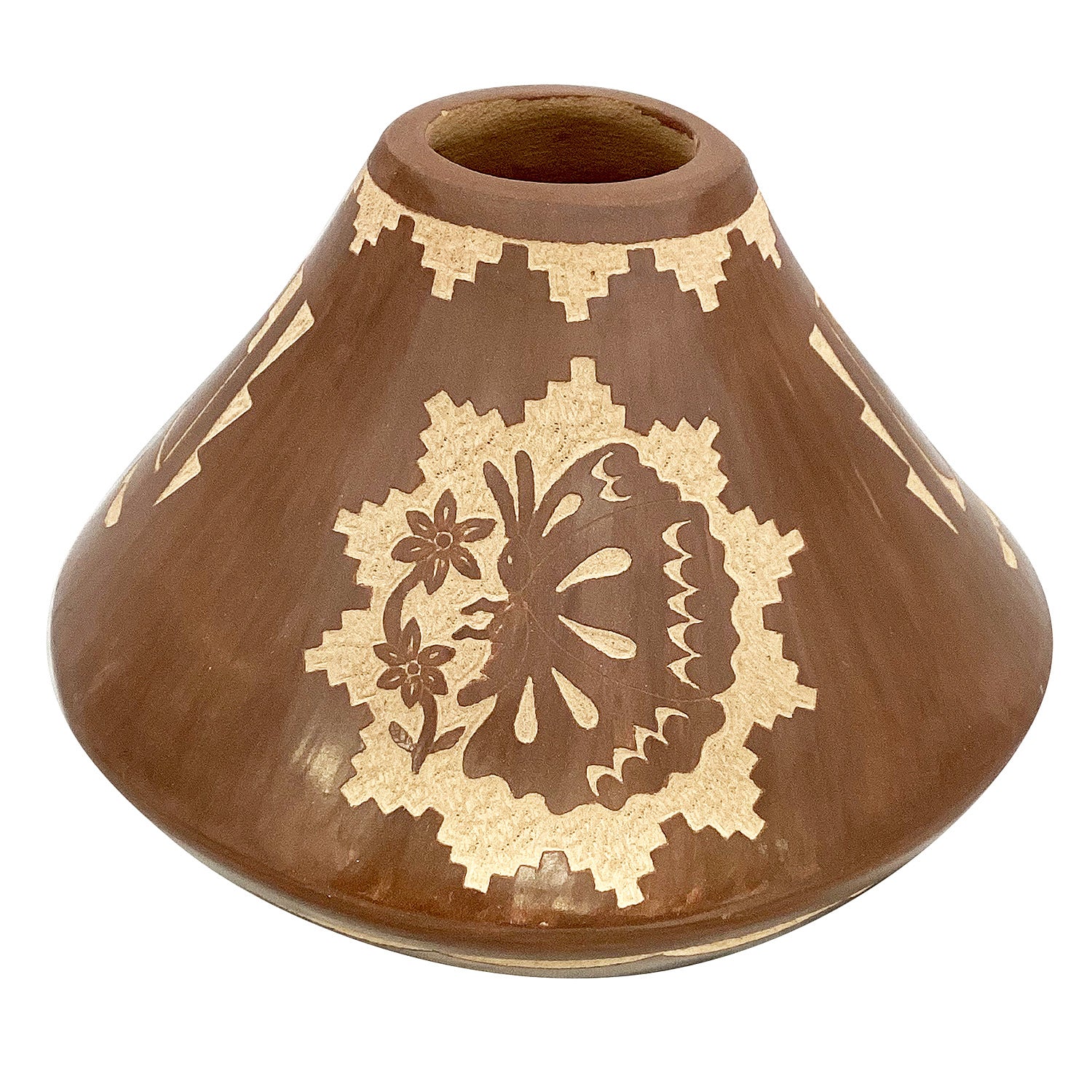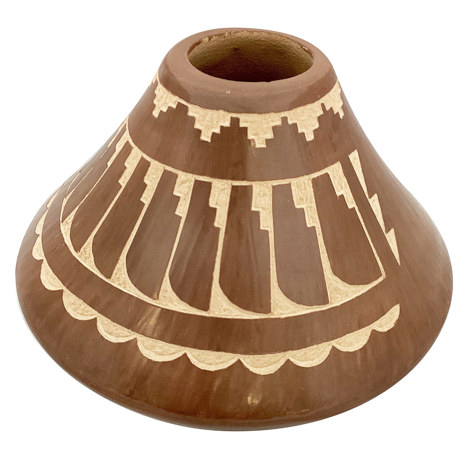 Pueblo artist Lawrence Yepa is another talented potter from Jemez. His style is a combination of smooth polished surfaces with unique carved designs. As technology and expansion grew pottery went through a very rough transition. It was once the essential pieces to carry water, store food and had a utilitarian function. However, that technology and expansion began to bring many travelers through the Southwest and pottery now has become collectible art.