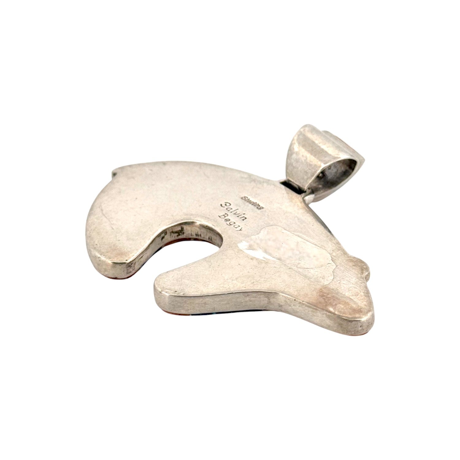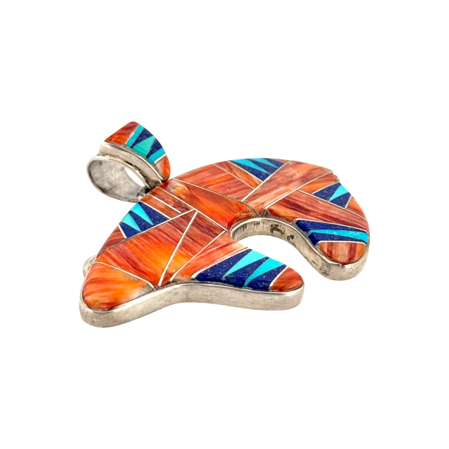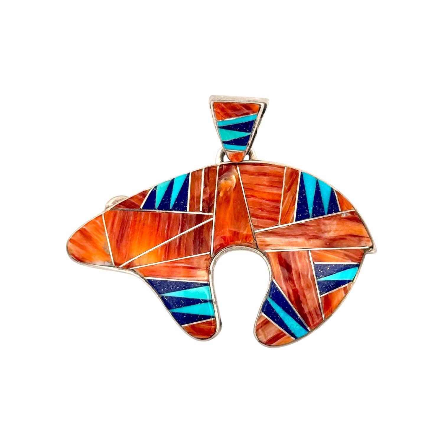 This striking Calvin Begay pendant is a true example of Navajo artistry, blending traditional symbolism with contemporary inlay design. Handcrafted in sterling silver, the pendant takes the form of a bear, a powerful Native symbol of strength, healing, and protection. It features a vibrant mosaic of Spiny Oyster Shell, Sleeping Beauty Turquoise, and deep Lapis Lazuli, each stone meticulously cut and inlaid to create bold geometric patterns. The warm orange tones of the Spiny Oyster contrast beautifully with the sky-blue turquoise and the midnight hues of lapis, resulting in a piece that is both eye-catching and meaningful. Known for his precision and innovative inlay work, Calvin Begay captures the spirit of the Southwest landscape in every detail. This pendant not only celebrates natural materials but also honors Navajo tradition and storytelling through design.