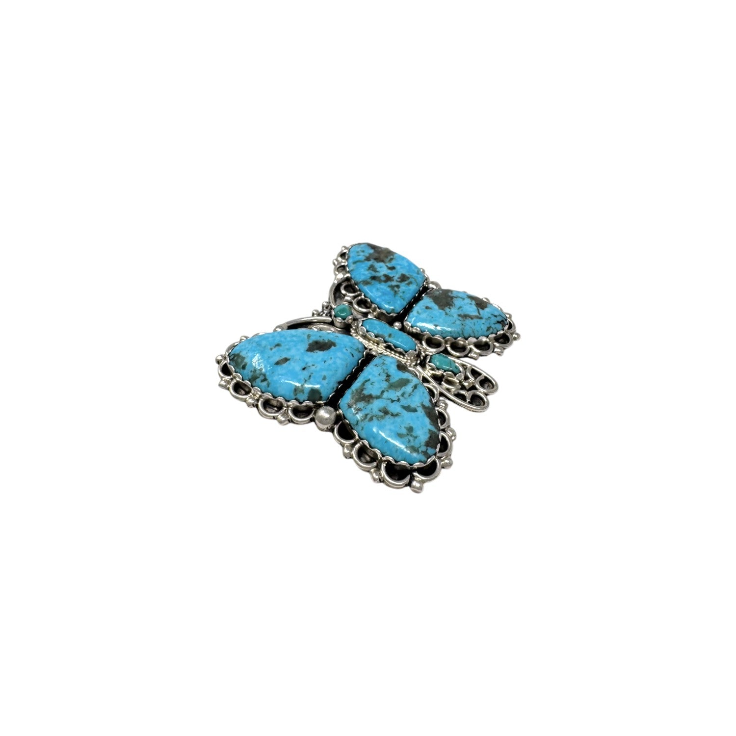 This stunning butterfly pin and pendant by Navajo artist Zeita Begay radiates both charm and cultural elegance. Crafted in sterling silver, it showcases hand-cut Kingman turquoise stones arranged symmetrically to form vibrant wings, each rich with natural matrix and variation. The silverwork is adorned with intricate detailing and delicate bead accents that frame the stones and add dimensional beauty. Symbolizing transformation and renewal, the butterfly motif is a powerful expression of Navajo storytelling and spiritual tradition. Designed to be worn as either a pendant or a pin, this versatile piece transitions seamlessly from statement accessory to cherished heirloom.
