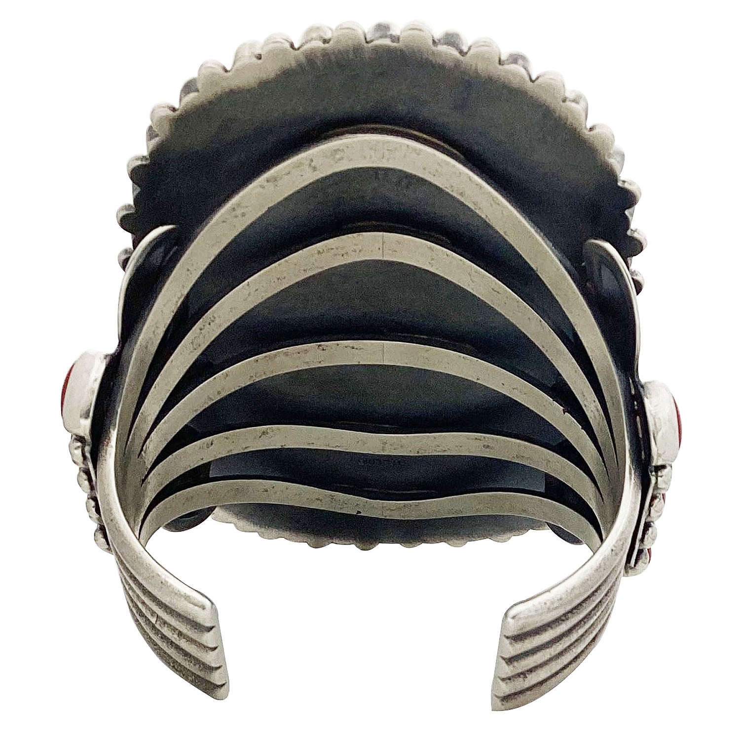 Navajo artist Ernest Roy Begay made this turquoise and coral cluster cuff. He has combined the two favorite stones of the Southwest, and they always make a great piece of jewelry. The stone is a gorgeous piece of Kingman Turquoise that has a unique bluish green color with a dose of brown matrix. Ernest sets the stone with a simple bezel and twisted wire, a great way to highlight the magnificent rock. He has used the long cut of the stone to showoff two rows of deep red Mediterranean Coral, each a perfect oxblood match. Ernest also uses stamped cutouts, silver drops, and a rustic brushed finish to enhance the beauty of the piece. The bracelet has been made with a comfortable five half-round wire bracelet shank and the whole piece radiates with extraordinary color. Imagine yourself wearing this Navajo treasure.