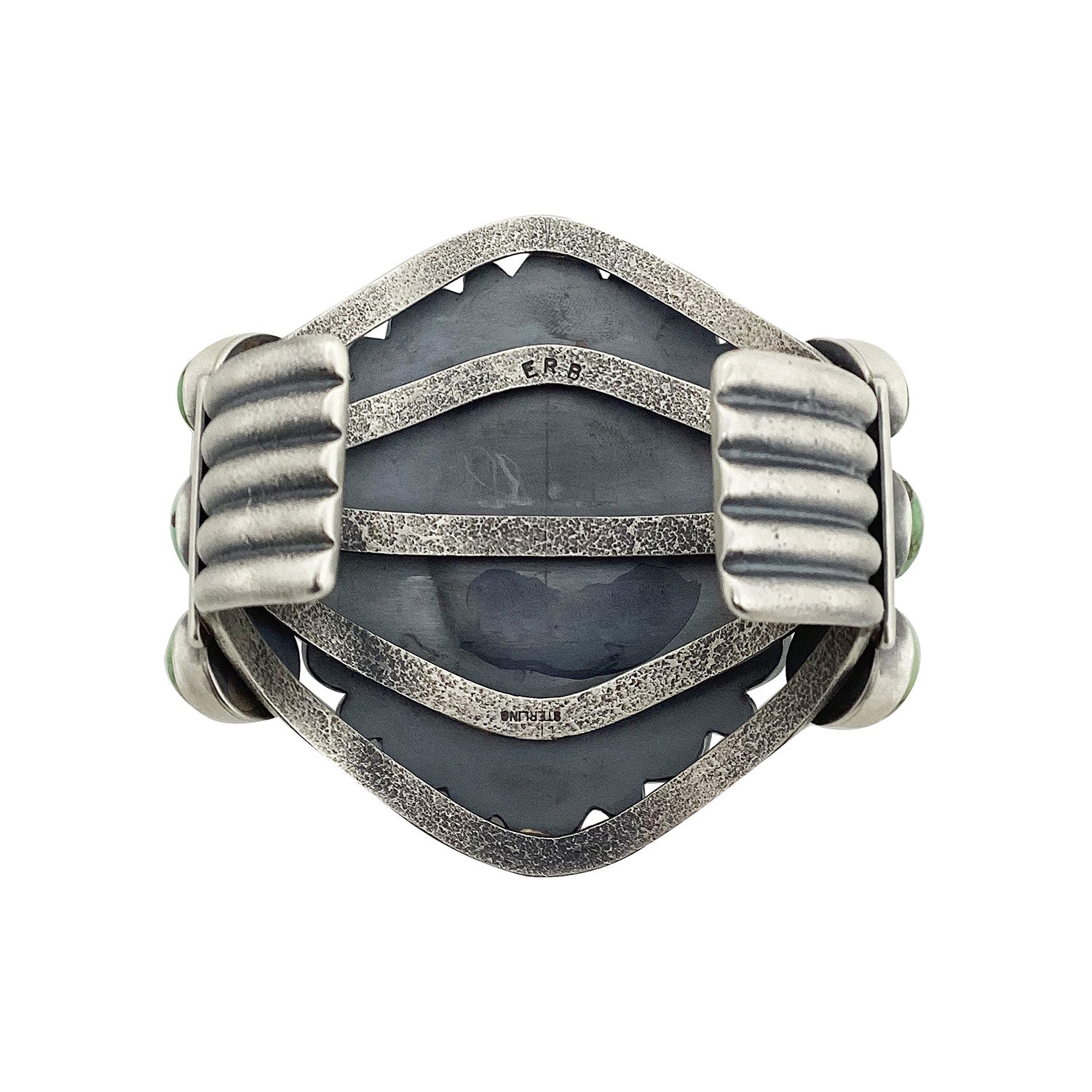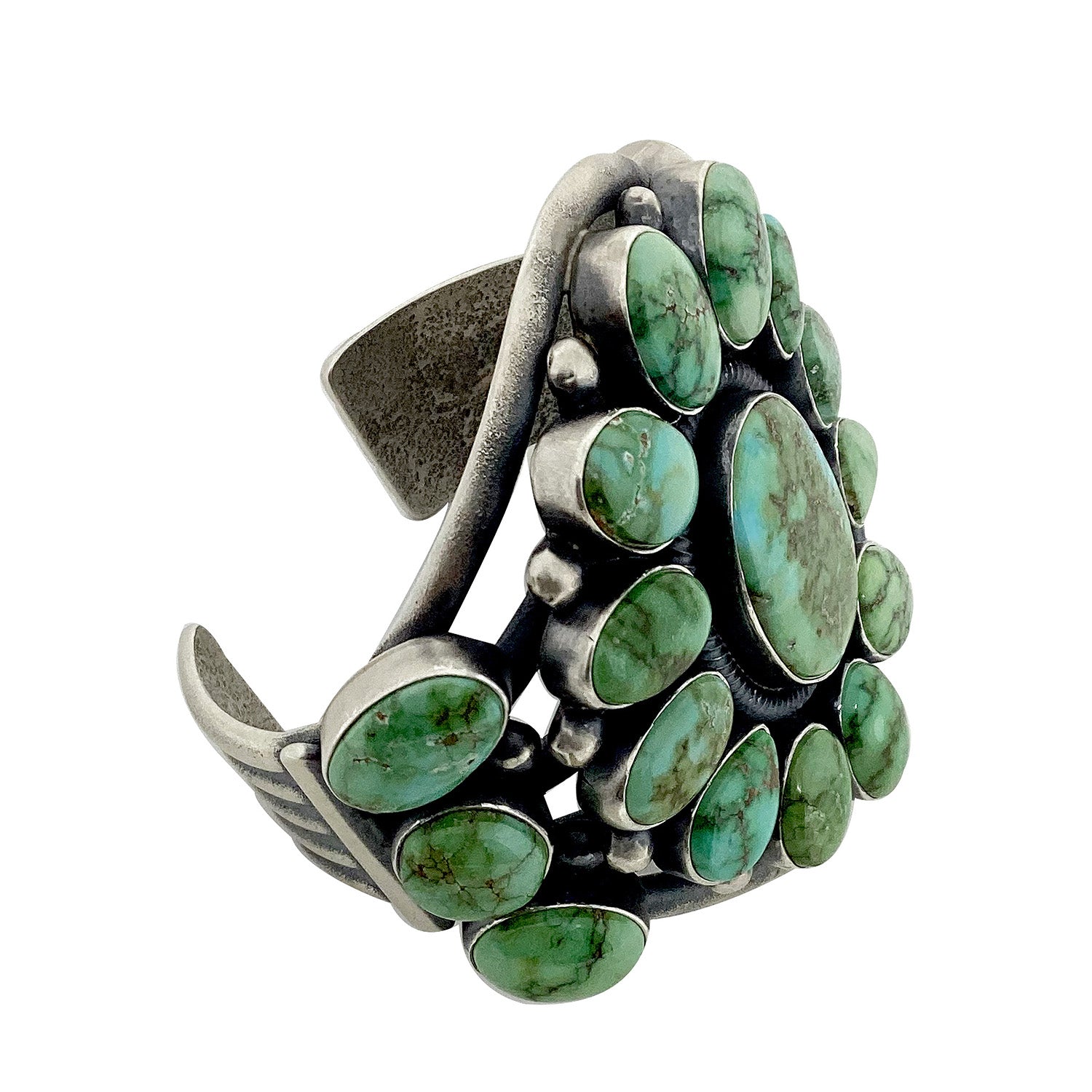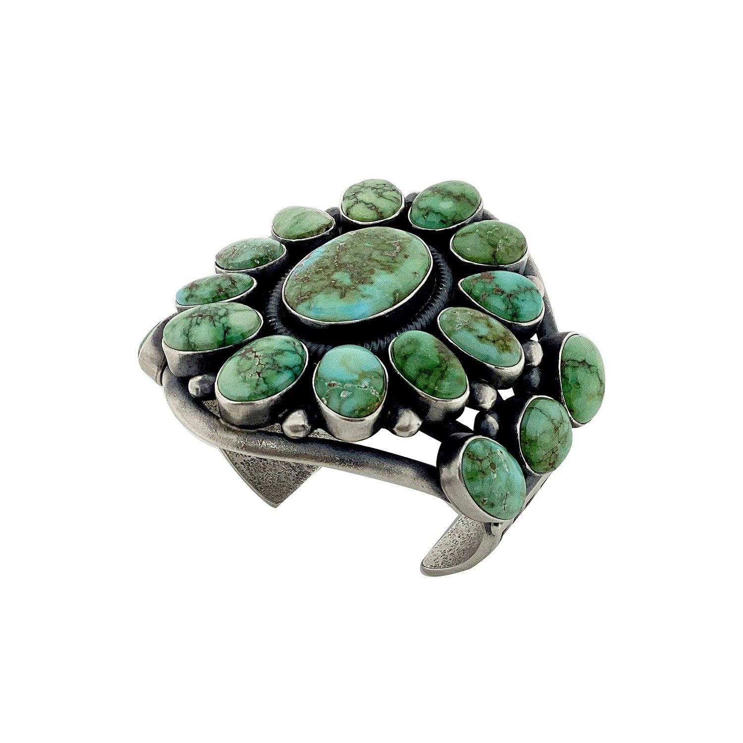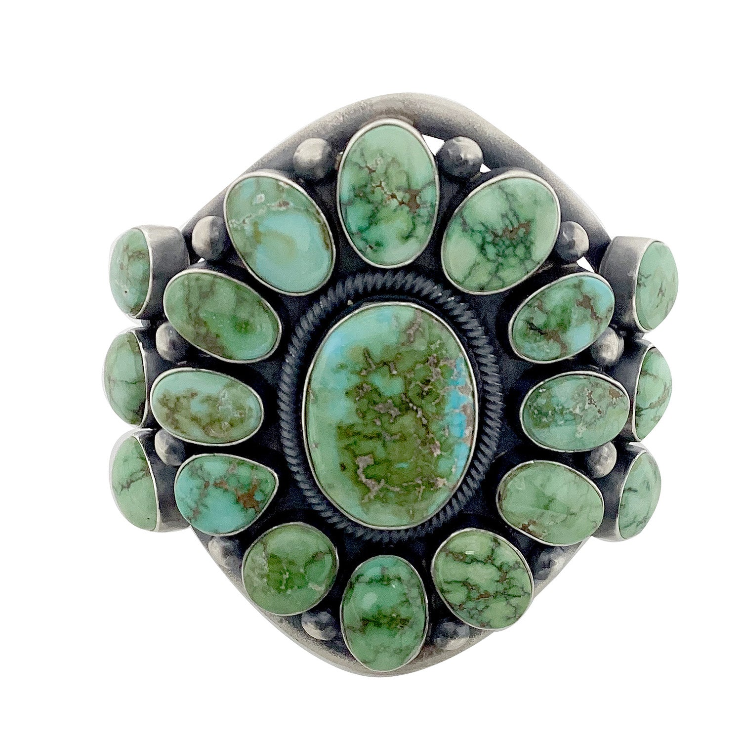 This is a cluster stone masterpiece made by award-winning silversmith Ernest Roy Begay. You don't see a bunch of cuffs with incredible green turquoise stones, so when you do you immediately know it is something special. Ernest has used perfectly matched pieces of collectible Sonoran Gold Turquoise stones. Each has a memorizing green that is filled with an eye-catching green colored matrix. Ernest surrounds the stones with stunning silver work that includes drops, twisted wire and round wire. All of the work sits on an easy to wear five round wire cuffs, and all of the silver is finished with a spectacular rustic finish. This is a great piece; one you will love showing off on your wrist.