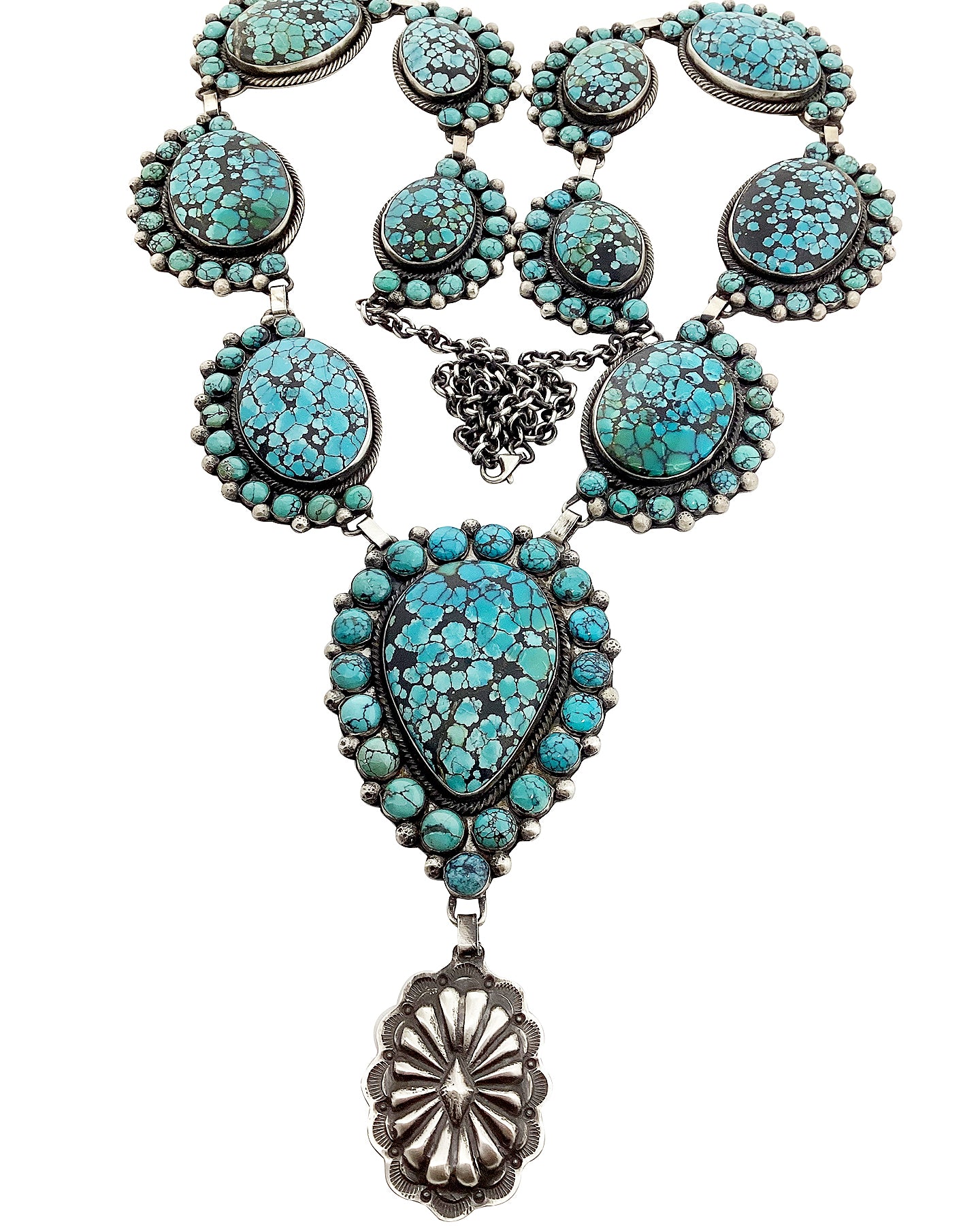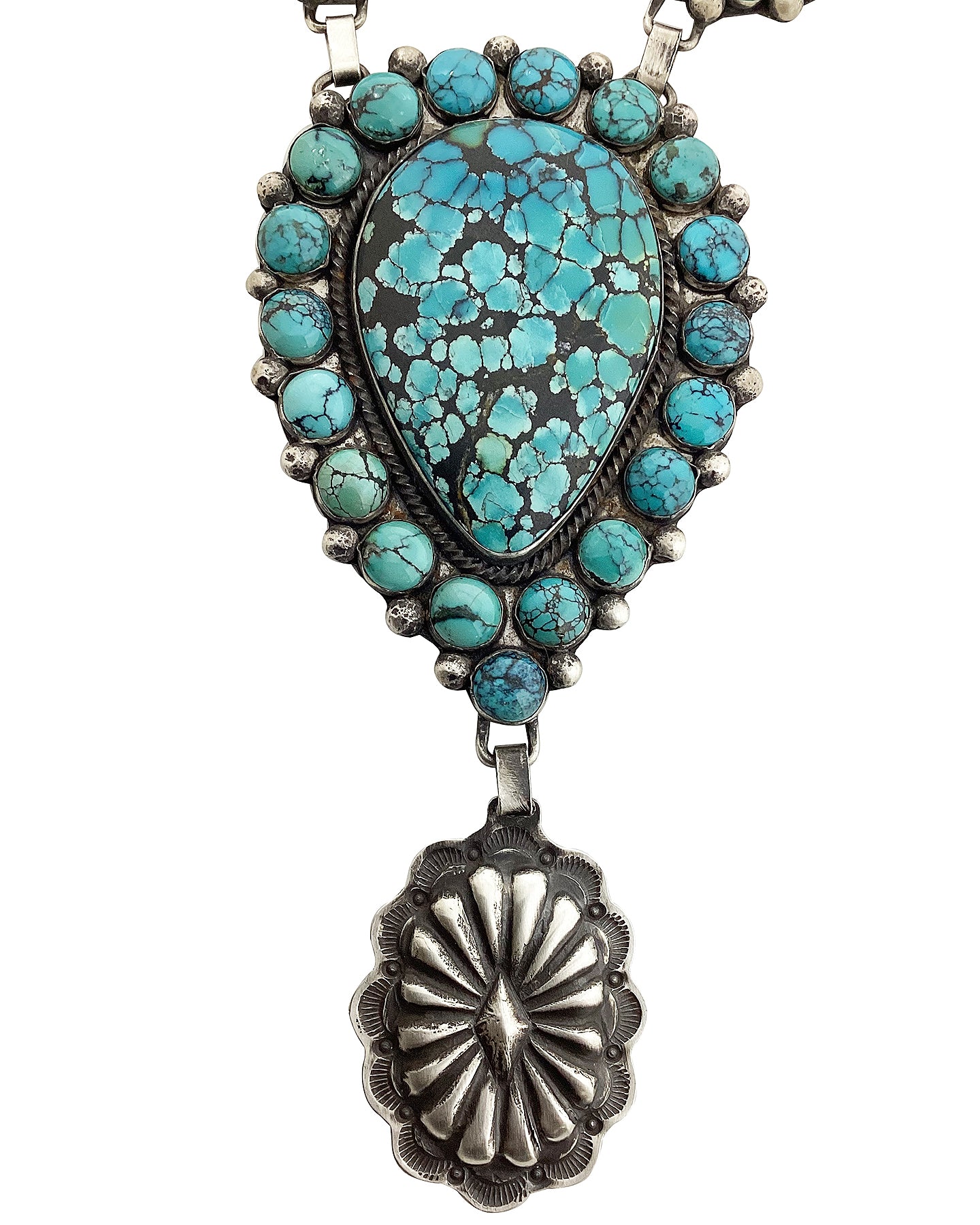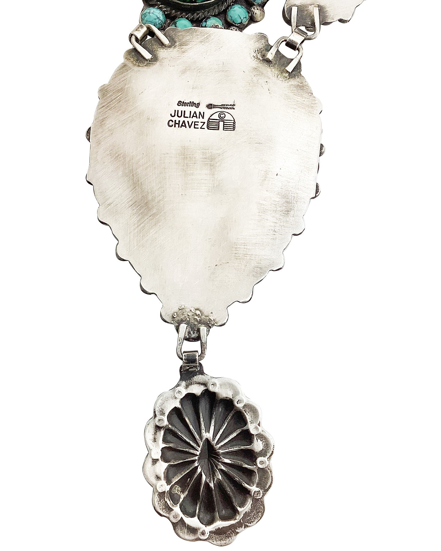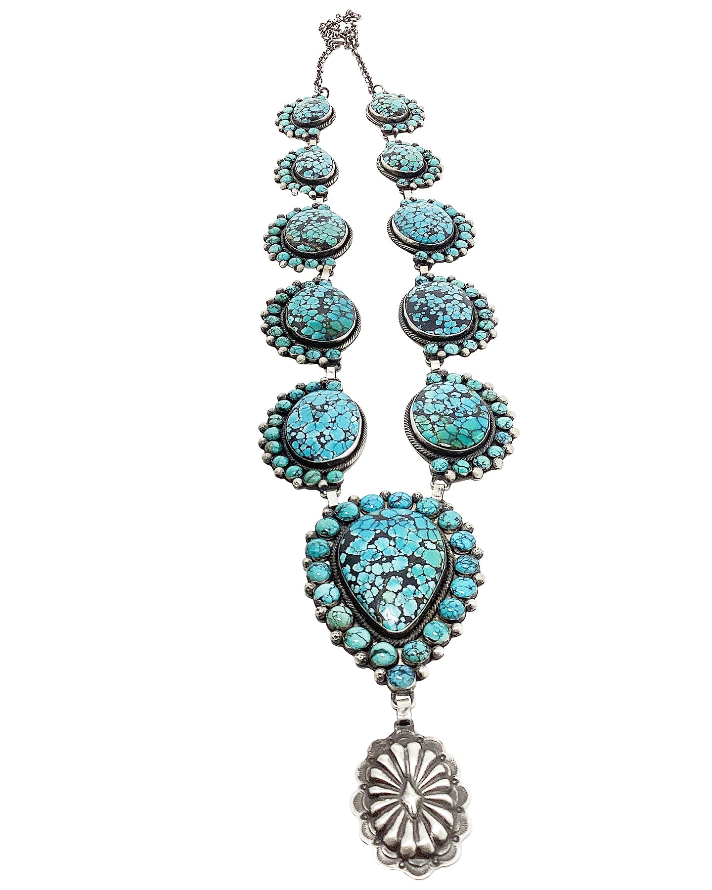 Navajo silversmith Julian Chavez made this magnificent necklace. A cluster of beautiful blue with rich veins of black webbed matrix stones fill the rustic brushed sterling silver. Julian has used a total of one-hundred thirty one colorful rocks on this stunning handmade piece. All the turquoise needed was a little twisted wire, silver drops, and plain bezel surrounding it, everything else is about the radiant beauty of the stone. Julian has hung the clusters on a heavy handmade chain, a perfect style that shows boldly but doesn't distract from the incredible stones. Now all you need is some earrings and a cuff to dress this one up, Southwest style. Ask, we have lots of Julian Chavez creations in stock and would be happy to send you pictures.