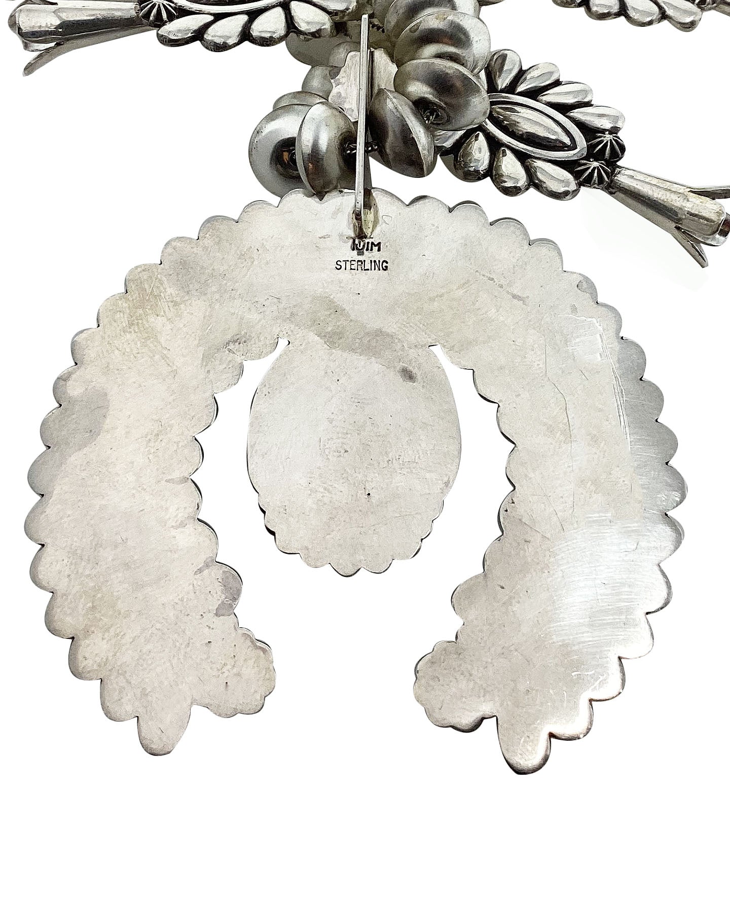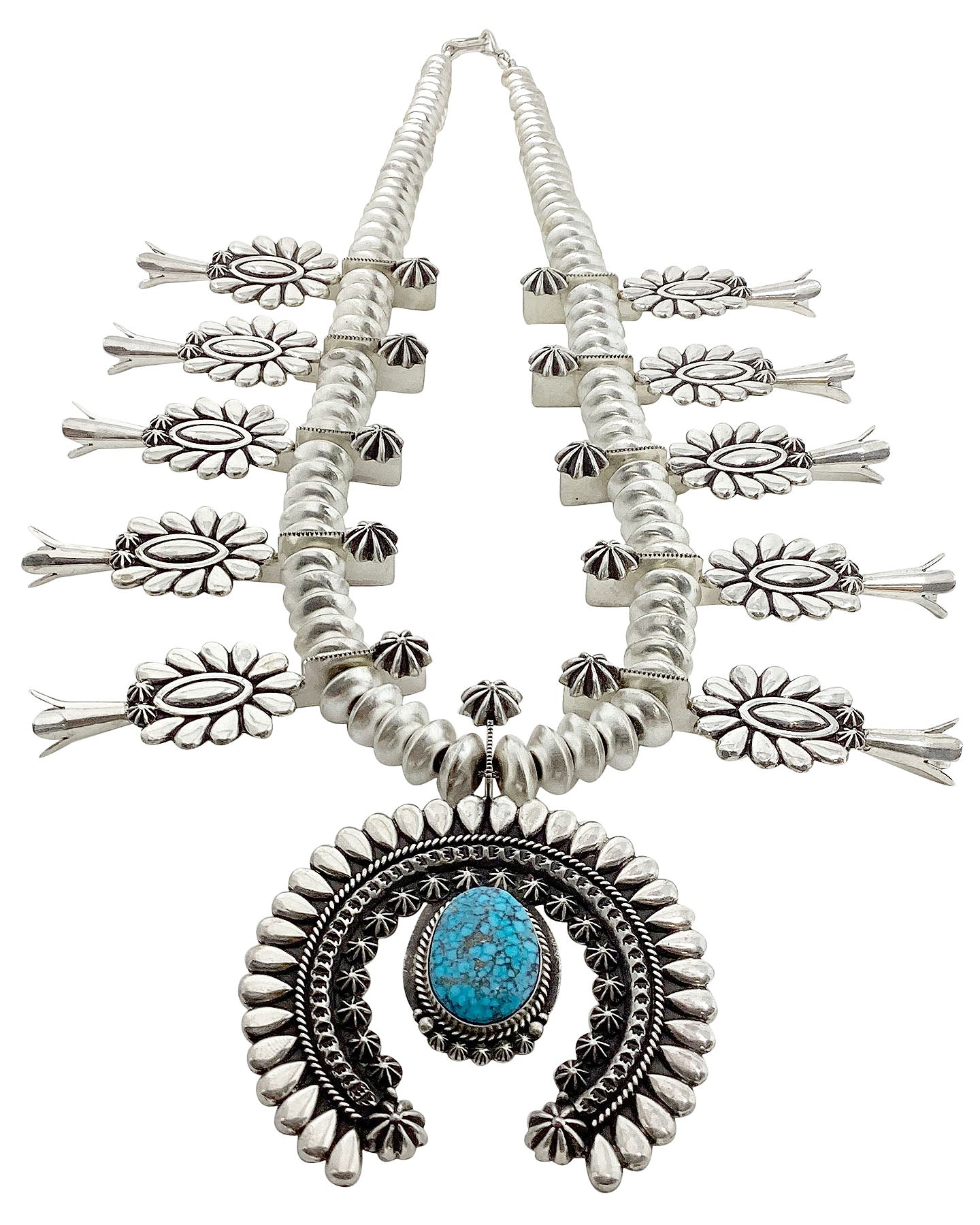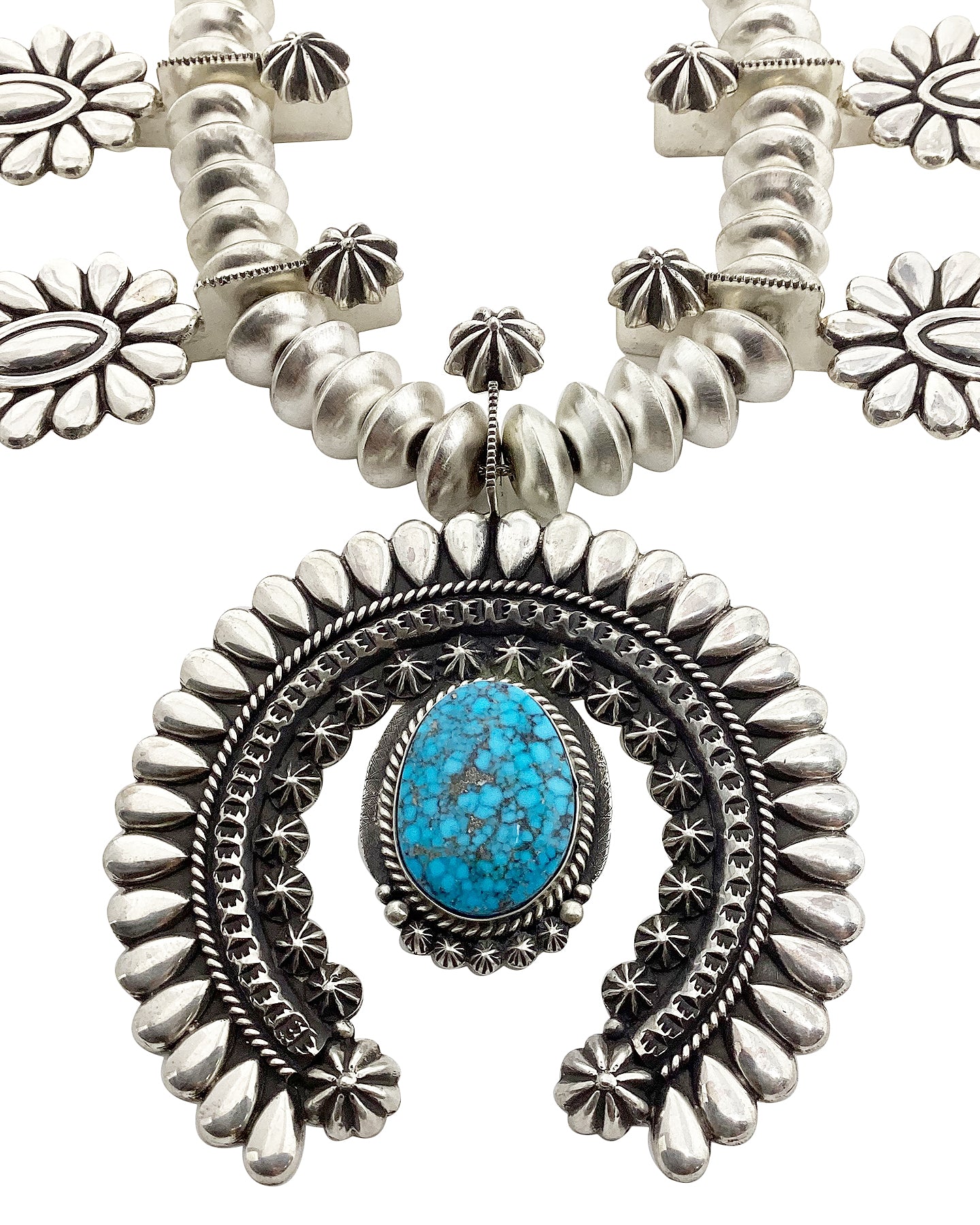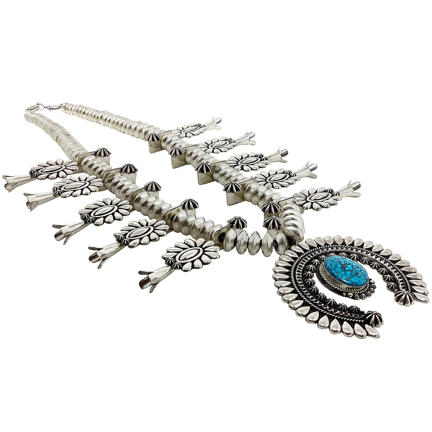 Navajo silversmith Thomas Jim has mastered his craft. This silversmith from the Winslow, Arizona area has collectors from around the world seek him out, and they all come for his unique silver cluster design. This necklace is signature Thomas Jim style. Beautiful and precise sterling silver pear shaped cutouts decorate the squash blossom necklace. Thomas uses a mirror shine against an oxidized background to bring out the great style of the necklace. Plus, he has handmade all of those wonderful Navajo pearls. Finished with a single piece of spider web Kingman Turquoise right in the center of the naja. We have other pieces by Thomas Jim in the online Trading Post.