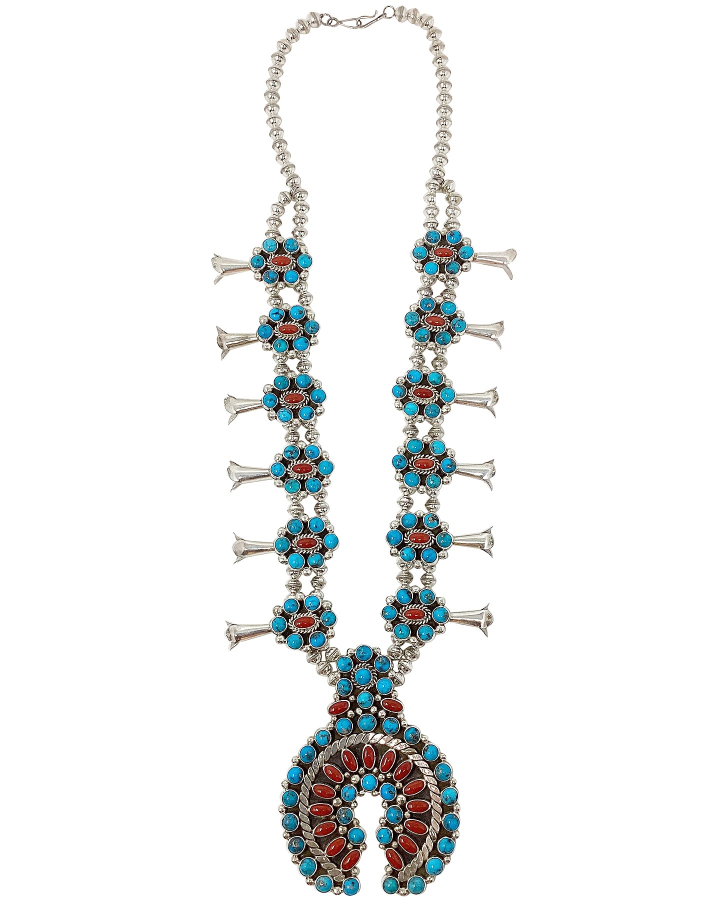 Melvin, Tiffany Jones, Squash Blossom Necklace, Cluster, Turquoise, Coral, 30"