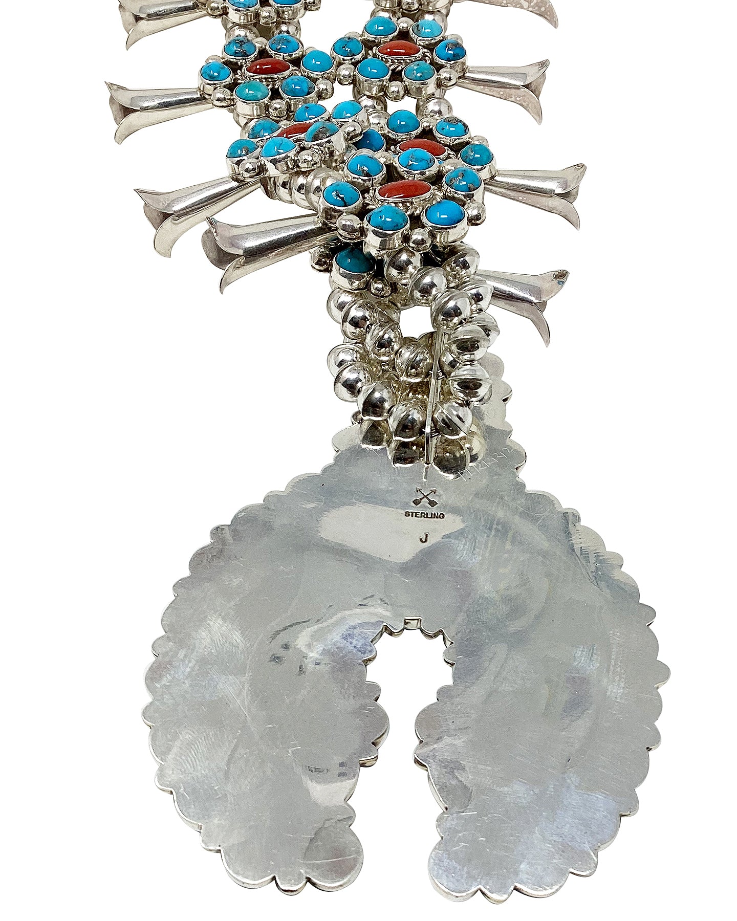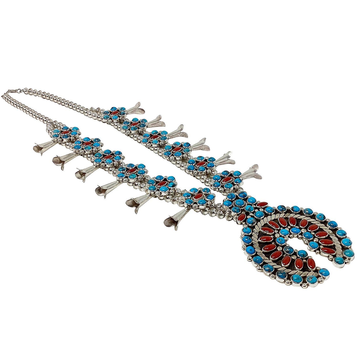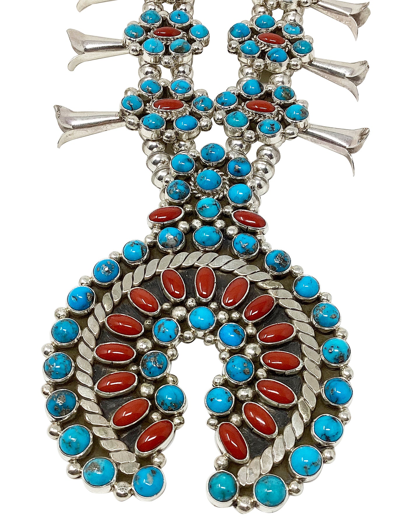 Navajo artists Melvin & Tiffany Jones made this magnificent squash blossom necklace. It is amazing how many stones this cluster squash blossom is filled with. The combination of sky blue Kingman Turquoise and dark red Mediterranean Coral have been used together in Navajo silver for a very long time, a classic combination. They have set the stones in 12 blossom that lead to magnificent cluster naja finish. One hundred and twenty-seven vibrant stones make up the stunning design, and the mirror shined sterling silver really brings out the colors. You will find the stones and naja strung on gorgeous sterling silver beads. Everything about this necklace works, perfect silver and stone, made by a talented husband and wife team. Look over the online Trading Post for the perfect pair of earrings to wear with your new necklace.