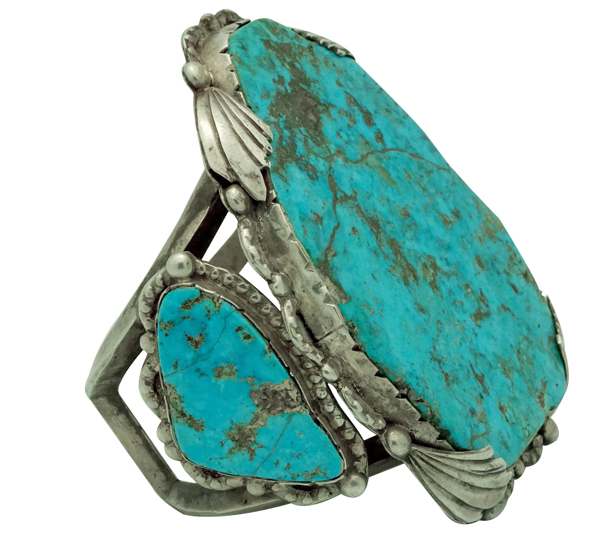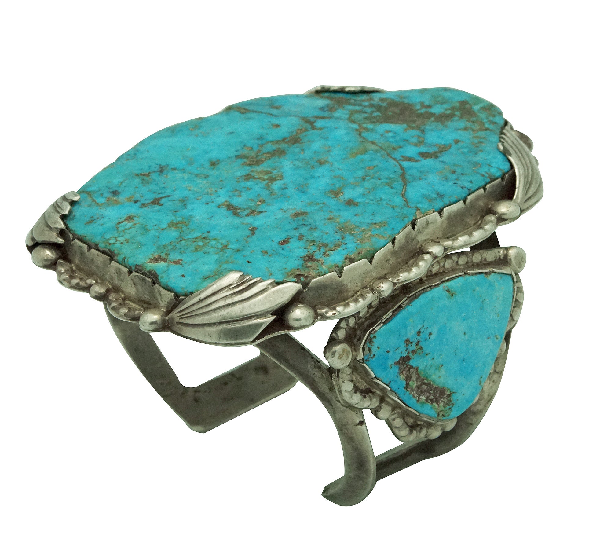 One of the best things about these incredible old pieces of handmade Native American jewelry is the stones. You can almost always count on them having some impressive pieces of American rocks. This circa 1960s Navajo cuff has three pieces of Arizona's legendary Morenci Turquoise. The center piece is a huge rock that measures over 3" long. Each collectible stone has that legendary rich blue color with matrix, the center stone and one side stone have cracks, but it appears to not be an issue. You will be blown away by the size of this cuff. The stones are surrounded by fancy wire work and tamping. A large shank finishes the piece and has that popular aged patina. This bracelet is a big piece and has that all-Navajo look, a perfect piece to show off your Southwest style and appreciation of authentic Native American wearable art.