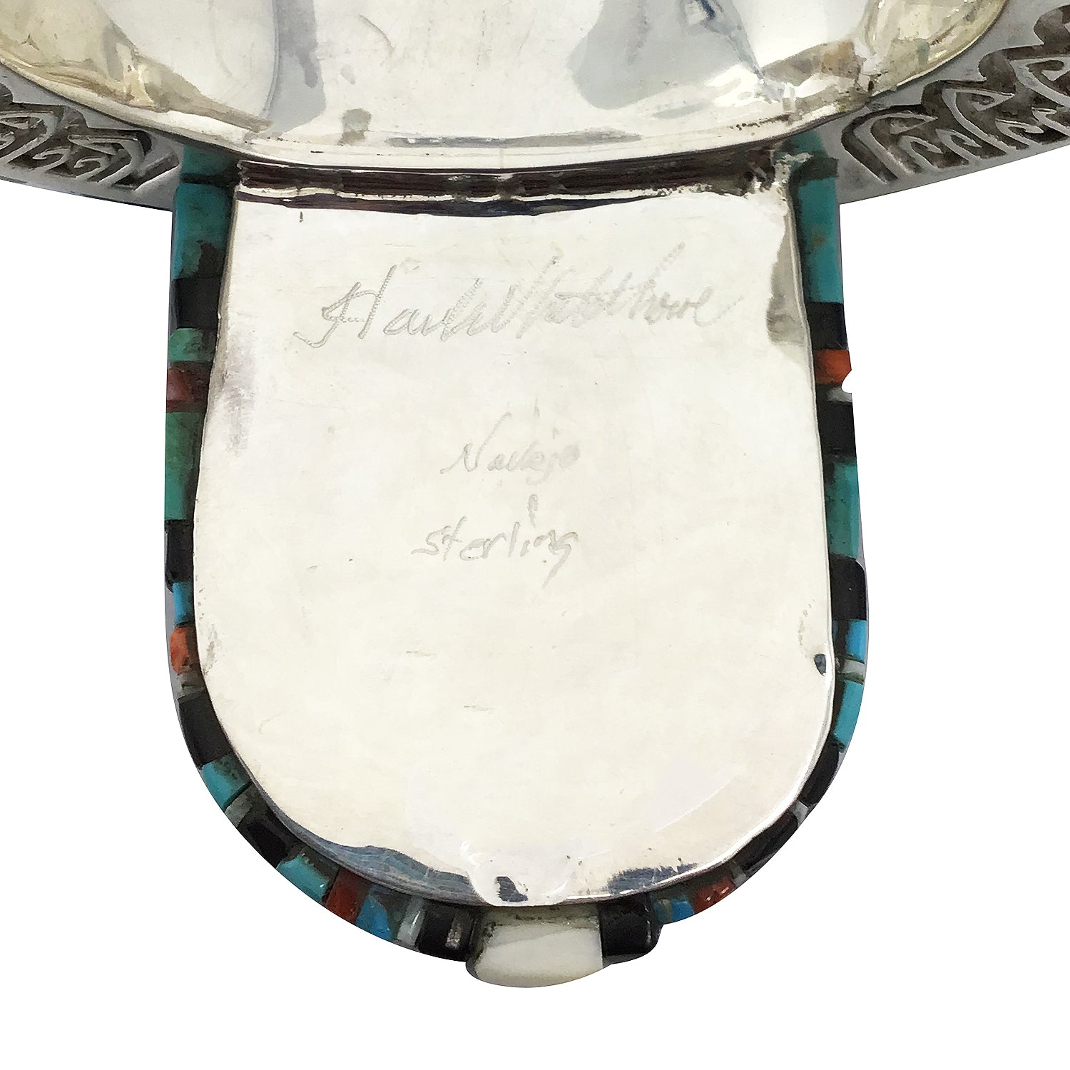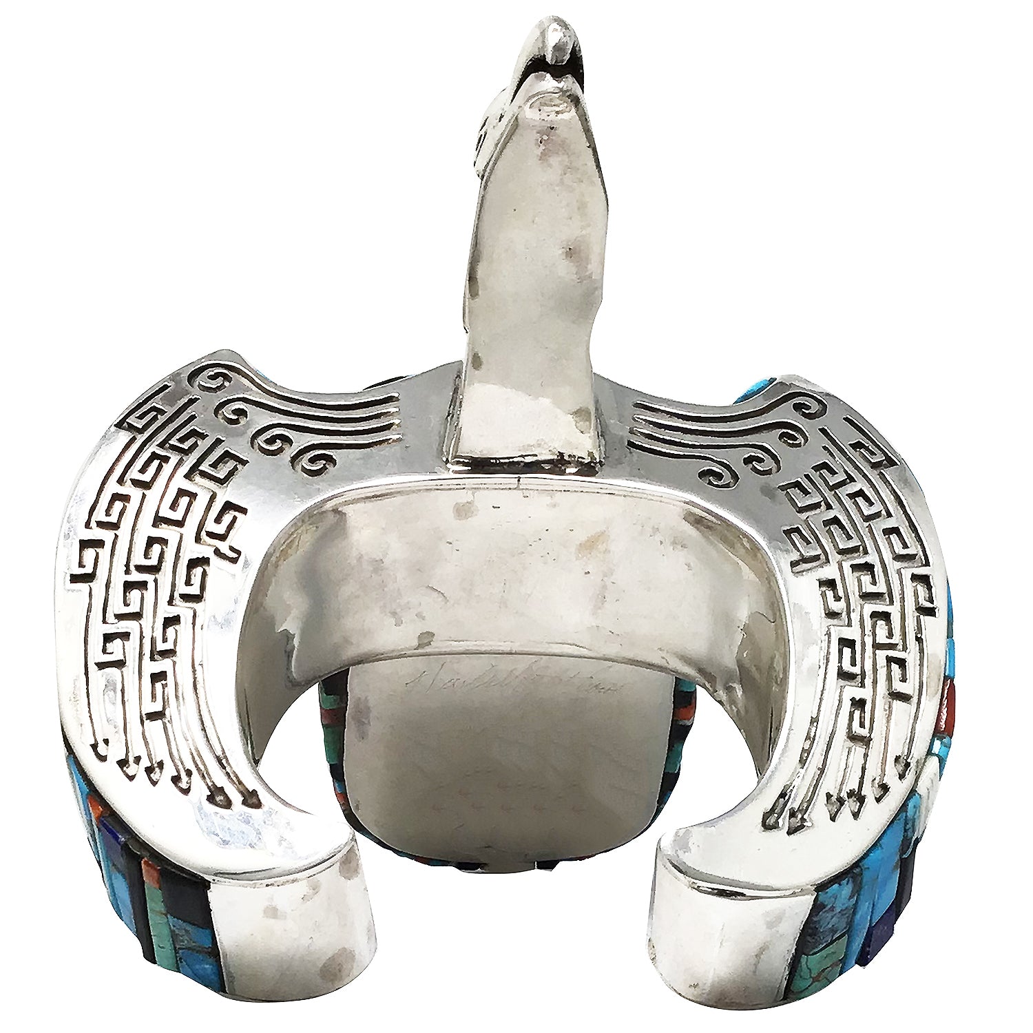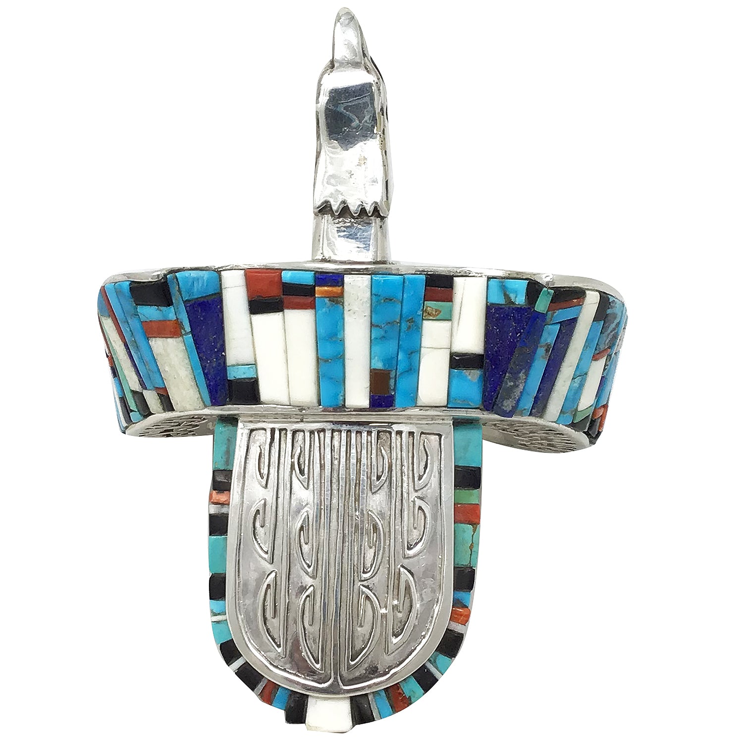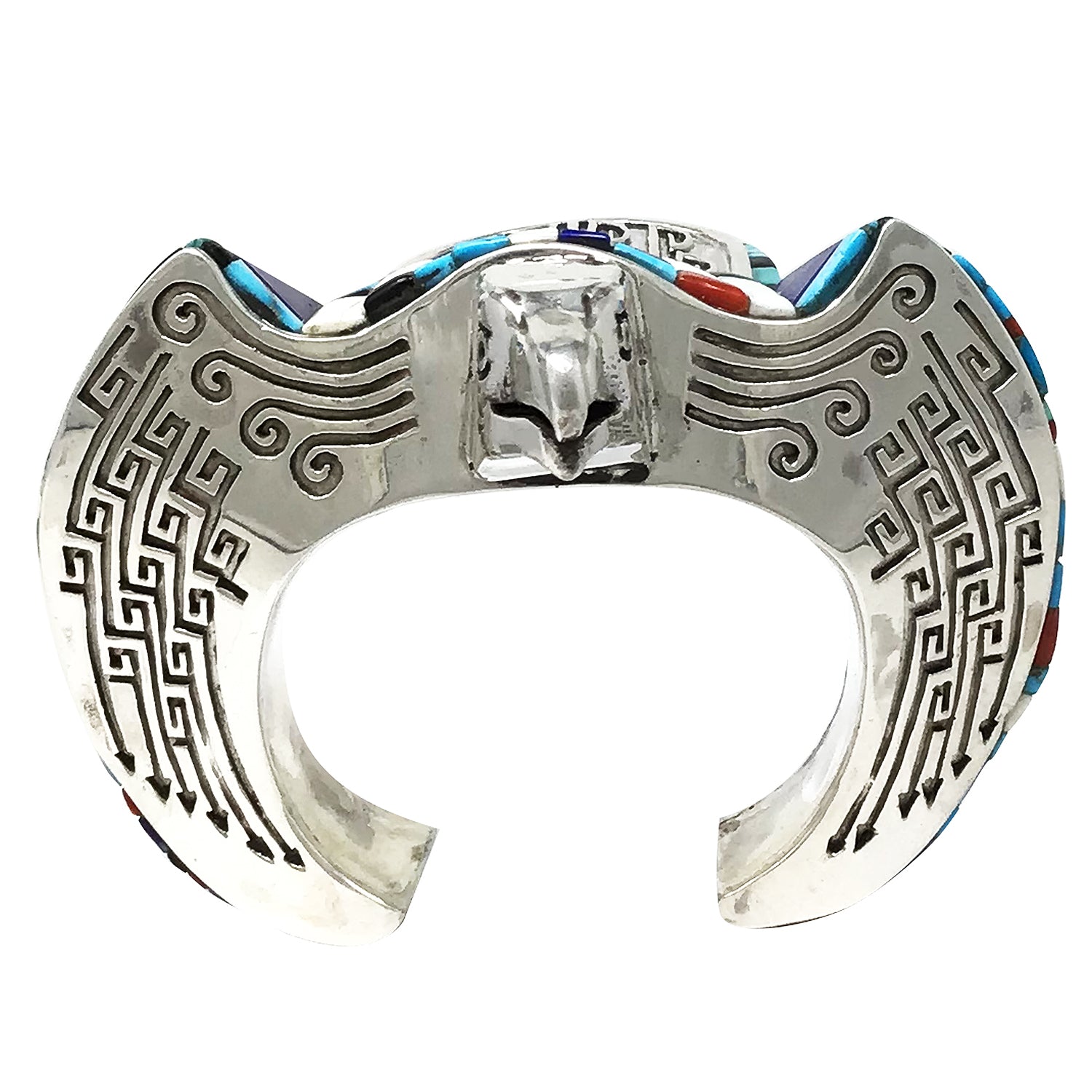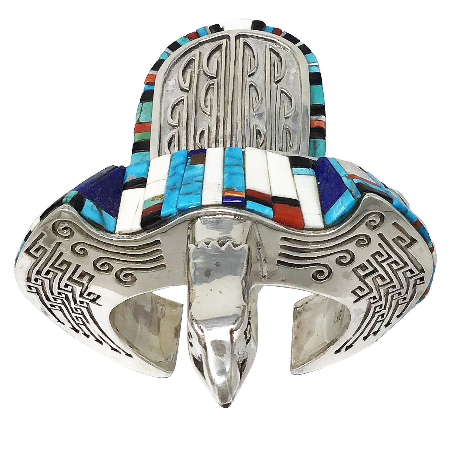 Navajo artist Hank Whitethorne lives in a very remote part of the Navajo Reservation. A place that holds onto the traditions of the Navajo People. It is only fitting that Hank's work is so different from anything else you see being made, a style not influenced by another's work, original art. This cuff is an incredible piece of art that looks like it came out of a Fantasy world, one that is filled with magical powers. Hank has fashioned the silver to resemble the powerful Eagle and filled the stunning overlay silver with lapidary art. You will find a mix of stones that include lapis, jet, coral, spiny oyster shell and turquoise stones. I can't imagine anything else like this in the world, a piece that will be the highlight of any authentic handmade Navajo wearable art collection.