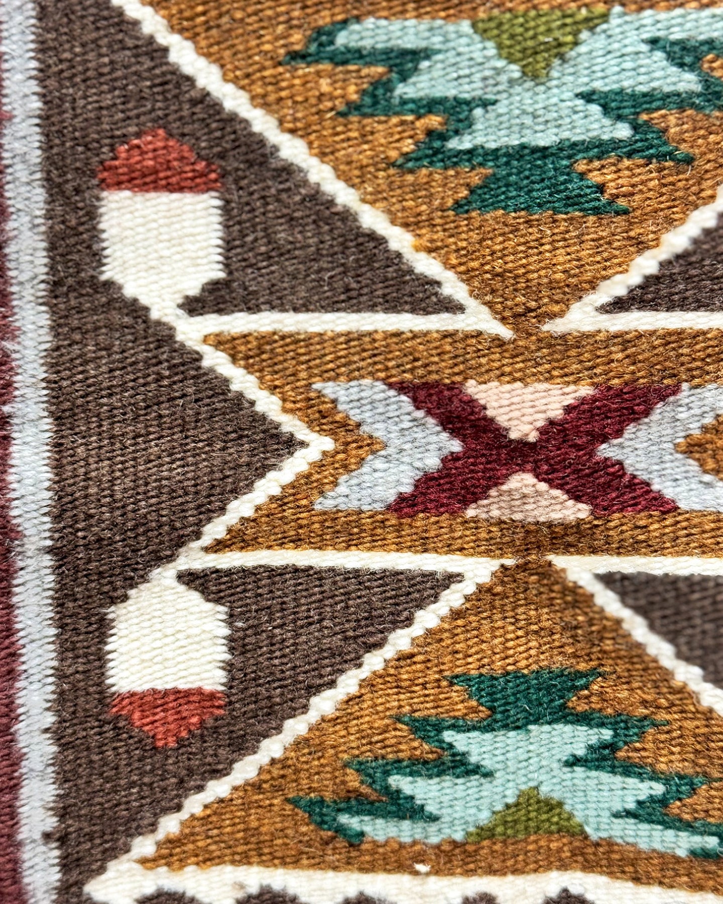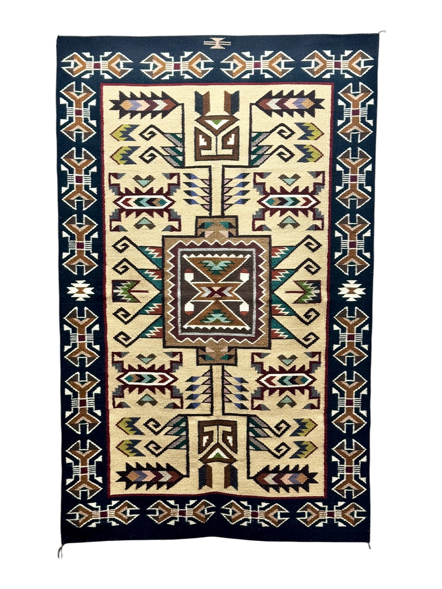 Navajo weaver Darlene Bahe is from an area rich in weaving tradition. She is known for her Teec Nos Pos style rugs and has taught her young daughters the traditional art. You will be blown away by the intricate design that captures so many Four Corner elements. The rug is classic Teec Nos Pos with a heavy border and Oriental feel. Darlene weaves this rug with a tightness that will last for generations of getting used daily. If this one is a little big, we have a few other shorter runners here at the Trading Post, just ask us for some pictures.