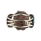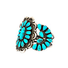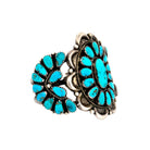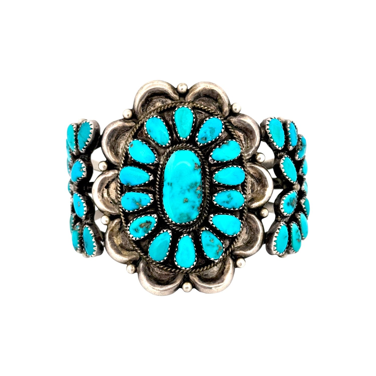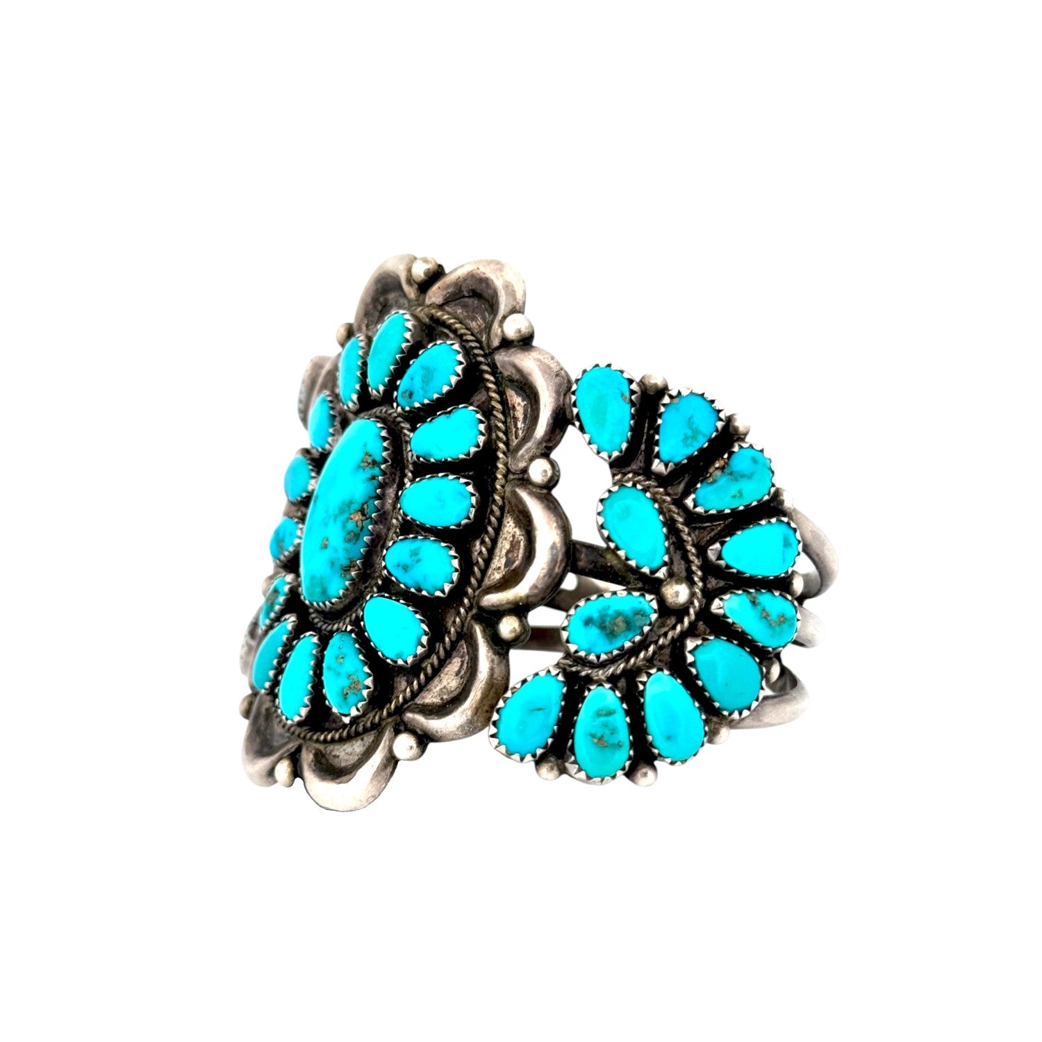 This vintage Navajo bracelet, circa 1980s, signed with the Wilson Hallmark, is an extraordinary piece showcasing Kingman Turquoise in sterling silver. The centerpiece features a large oval turquoise cabochon, framed by a radiant cluster of teardrop-shaped stones arranged in a classic floral pattern. The bold scalloped silverwork around the cluster adds dimension, while the sides of the cuff continue the design with smaller turquoise clusters for a balanced, harmonious look. Each stone displays the vibrant blue tones and natural matrix for which Kingman Turquoise is celebrated. Rope detailing, silver drops, and oxidized accents further enhance the depth and character of the piece. Wide and substantial, the cuff makes a commanding statement while remaining true to traditional Navajo artistry.