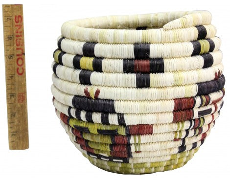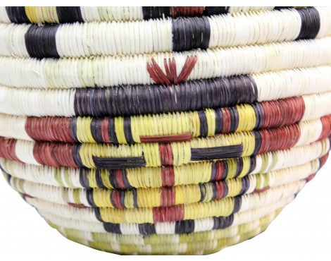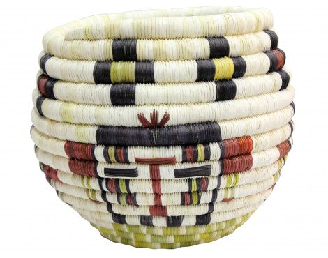 Hopi coil basket weaving isn't something you learn overnight. All of the weavers we have baskets from grew up in a house that wove baskets, something that was introduced to them from an early age. You will find these basket weavers on the Second Mesa. We have an interview with Irene Lamayaktewa who talked a little bit about the colors you find and the materials in coil basket."We make the coil basket from straw and yucca that we pick from areas around Hopi. Many of the colors are from the yucca plant, yellow comes from yucca being harvested in winter, the white is summer, and the green can be picked aany time of the year. Also, we will use sunflower for the black and Hopi Tea (hohocy) for the red."Make sure you look through our online collection. We have both baskets and plaques.