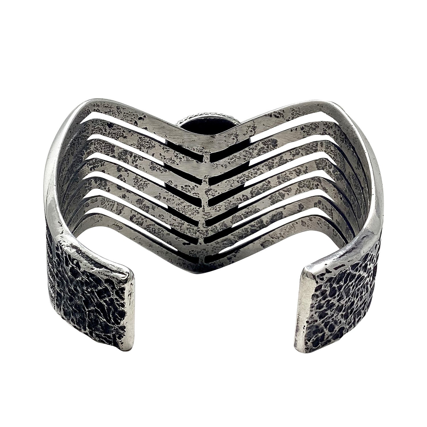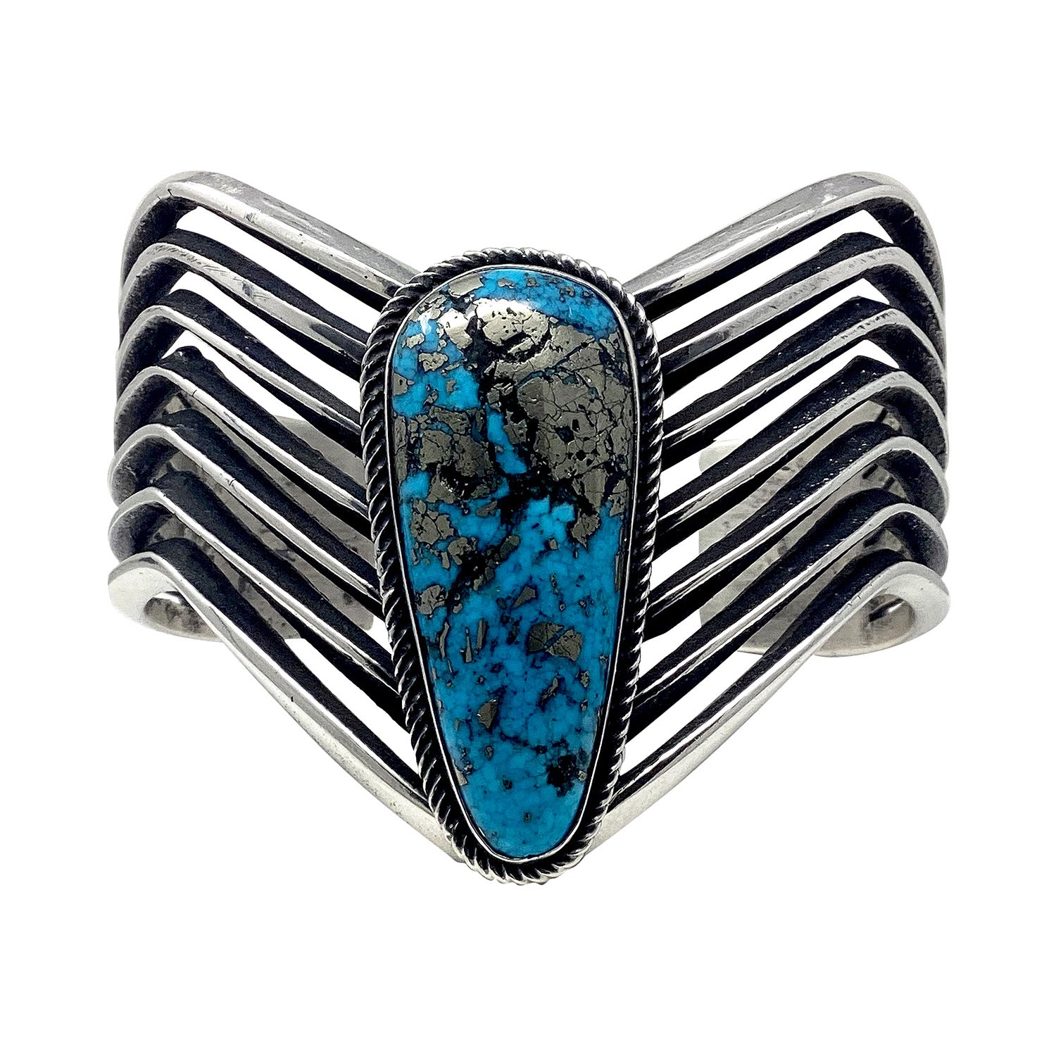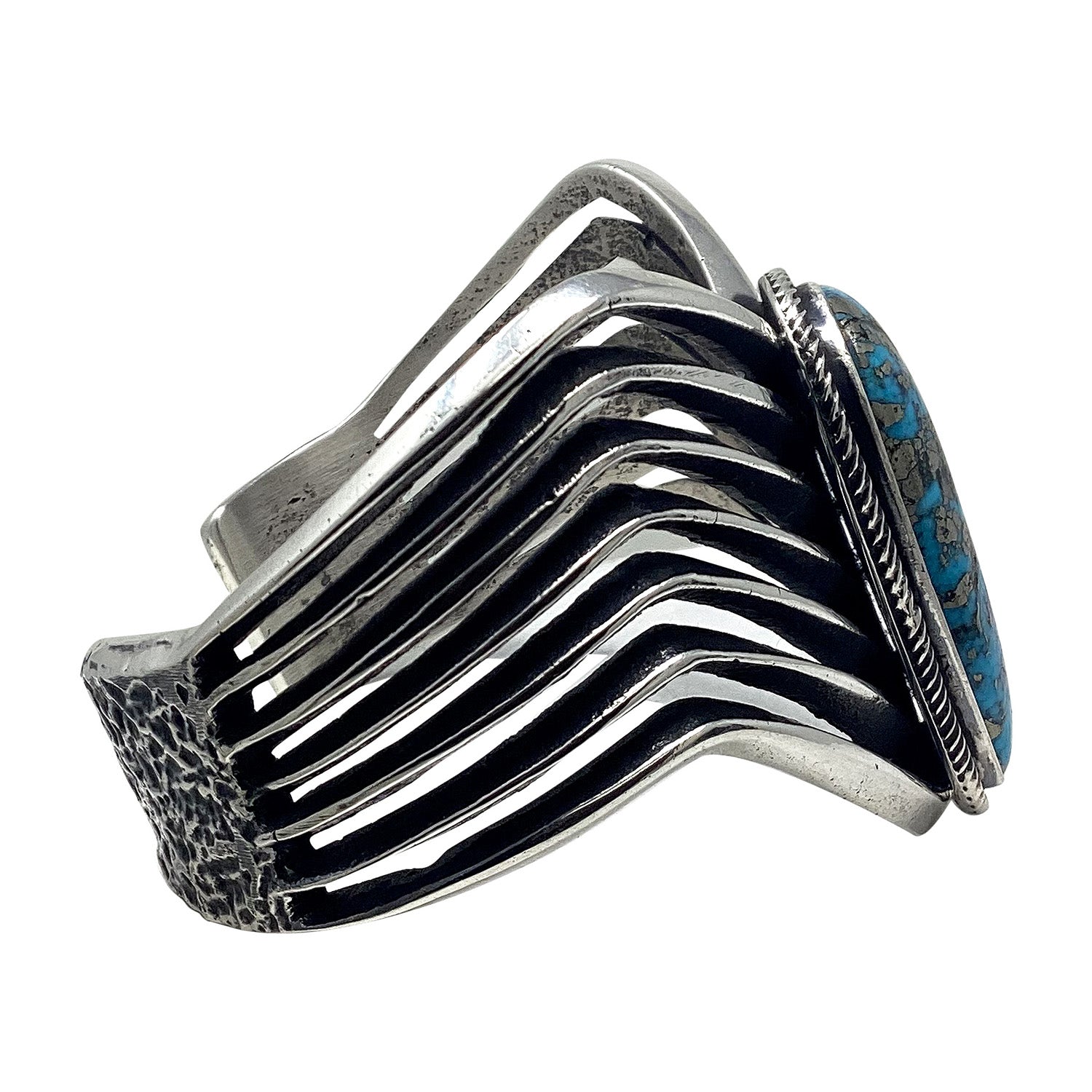 One of the earliest techniques of the Navajo silversmith was to carve sandstone to design their work. When you open up a book of antique Navajo art you are going to see images of old sandcast jewelry. This recreation of those old classics is magnificent. Thick carved edges and earth-textured silver really turn this into a rustic Southwest lifestyle piece. Navajo silversmith Aaron Anderson has become famous for making this style of jewelry. This magnificent bracelet has one solid piece of Persian Turquoise that creates a flowing design. The combination of turquoise and silver metal enhances the beauty of this bracelet. His variety of work is amazing and make sure you check out all of the Aaron Anderson pieces on our online Trading Post, true pieces of Navajo treasure.