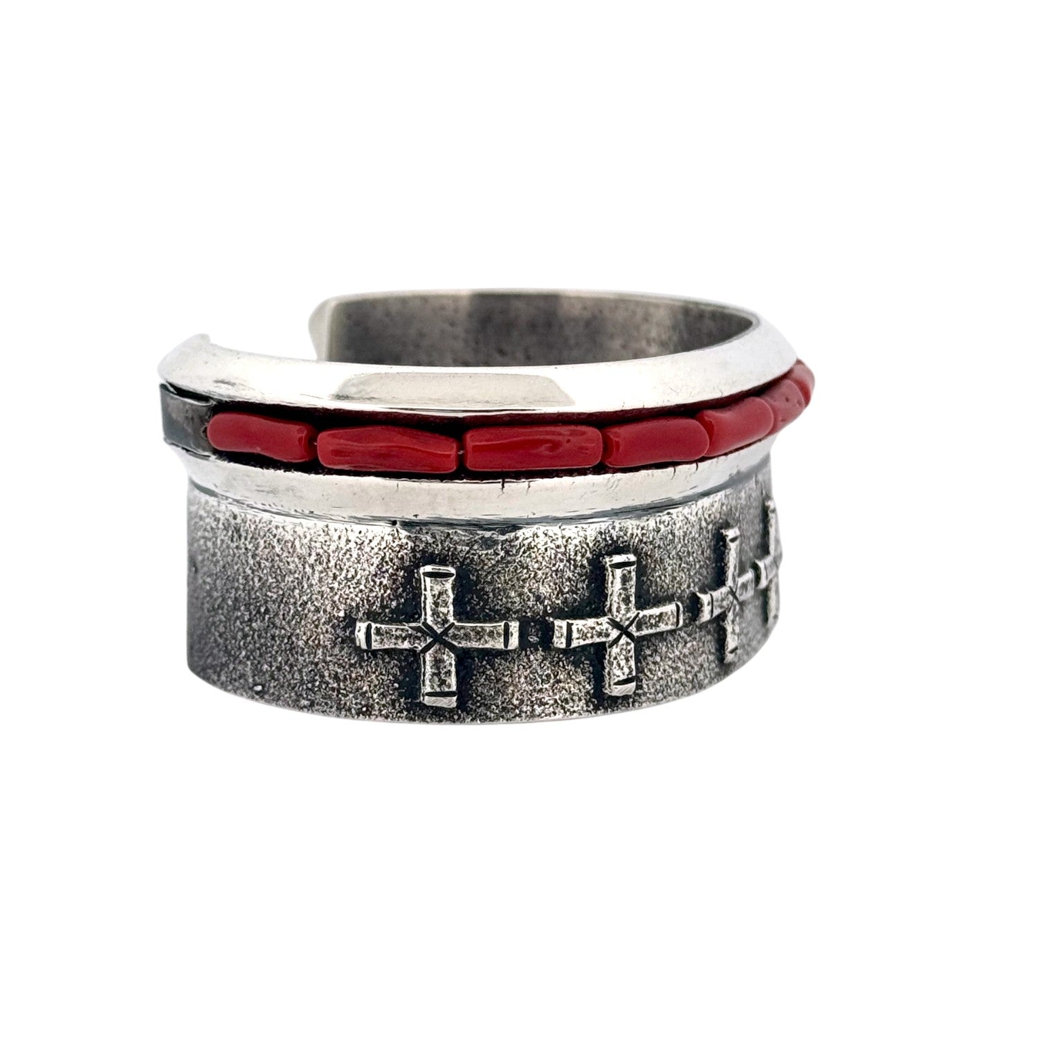 This powerful Navajo handmade bracelet by master silversmith Aaron Anderson features striking Coral inlay set in bold sterling silver. Crafted using the traditional tufa cast technique, the bracelet showcases Anderson’s renowned textural style with finely detailed cross motifs along the band. The deep red coral adds a vivid contrast to the matte silver surface, symbolizing strength, vitality, and life. Each element of this cuff reflects Anderson’s exceptional craftsmanship and contemporary Navajo artistry.