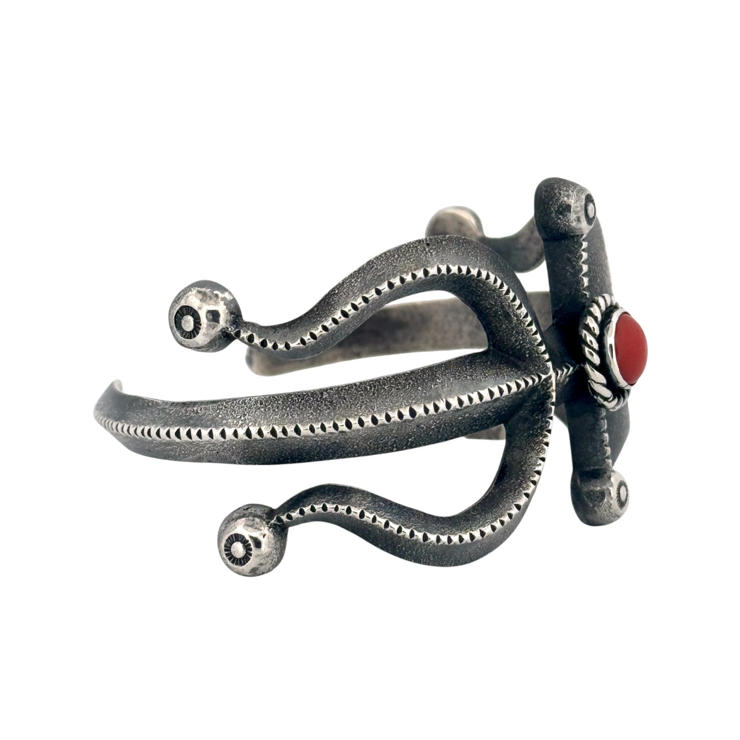 This remarkable Navajo handmade bracelet by renowned silversmith Aaron Anderson features a striking Coral cabochon set in richly textured sterling silver. Crafted using the traditional tufa cast technique, the bracelet showcases Anderson’s signature mastery of form and design. The bold openwork pattern creates balance between strength and elegance, while the deep red coral centerpiece symbolizes vitality and protection.