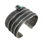 This bracelet shows off a different silver design. It begins by being separated down the center with three raised polished lines, creating a unique design. One side of the bracelet has an off centered Pilot Mountain Turquoise stone to complete this bracelet. On the other side the silver is smooth with no stone. Navajo tufa cast artist Aaron Anderson makes his amazing art from carving stone. You will find a mix of contemporary and traditional Navajo design in his wearable art. With a studio in the downtown Gallup, he has reached lots of collectors with his style of silver. We have a large selection of his award-winning jewelry, something for everyone. Make sure you take the time and check out our online Trading Post collection, some incredible works.