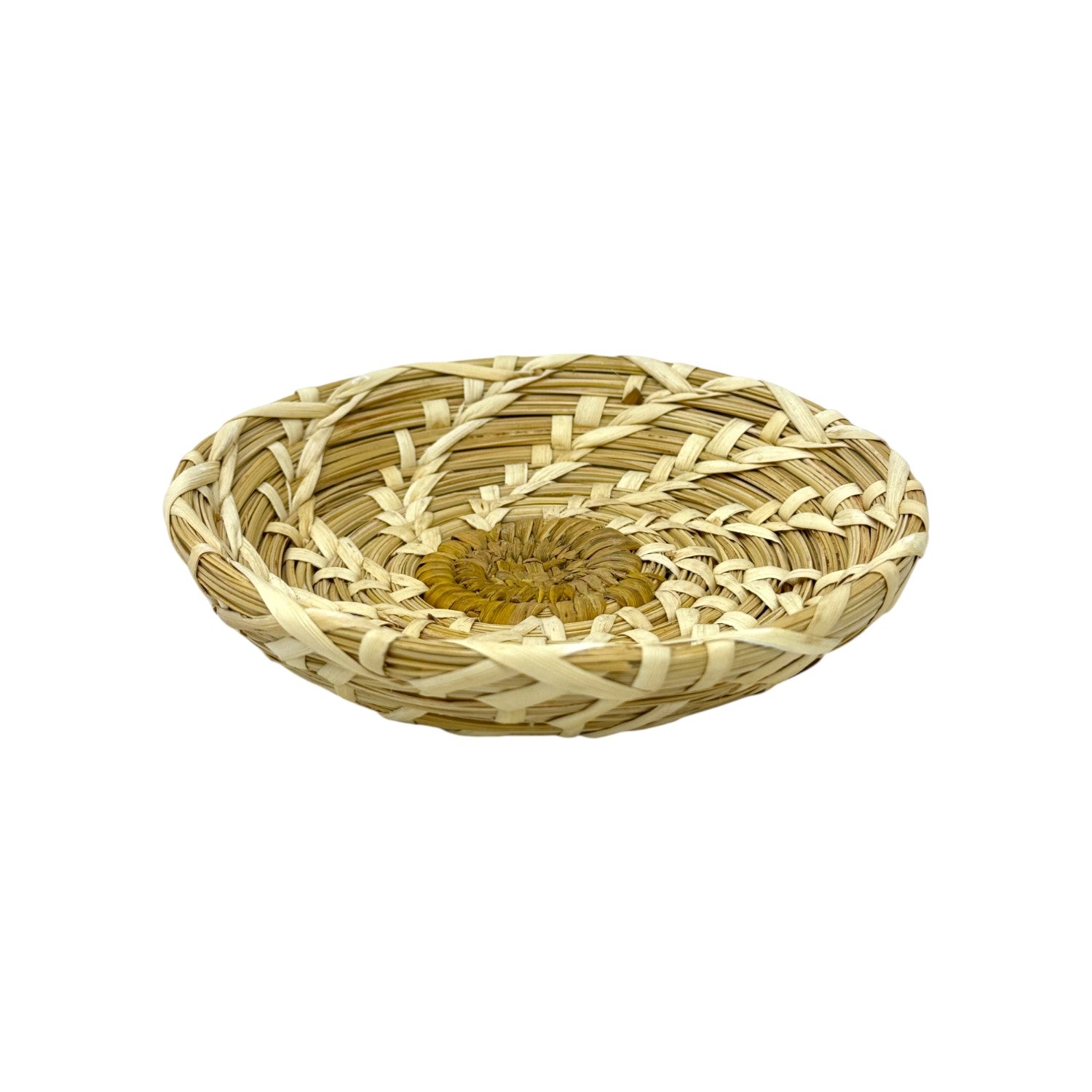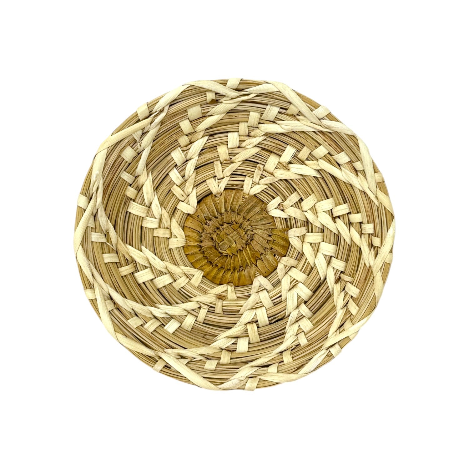This vintage Papago handwoven basket plate is a timeless example of traditional artistry passed down through generations. Woven from natural desert plant fibers, the design radiates from the center in warm earth tones of golden wheat and soft cream, forming a subtle sunburst pattern. The coiled technique used by Tohono O’odham (formerly Papago) weavers ensures both beauty and durability, making it as functional as it is decorative. Each stitch reflects the maker’s intimate knowledge of the land and commitment to ancestral craft. Whether displayed on a wall or placed as a tabletop centerpiece, this basket plate carries a sense of place and history. Its understated elegance speaks to the quiet strength and enduring spirit of Papago weaving tradition.