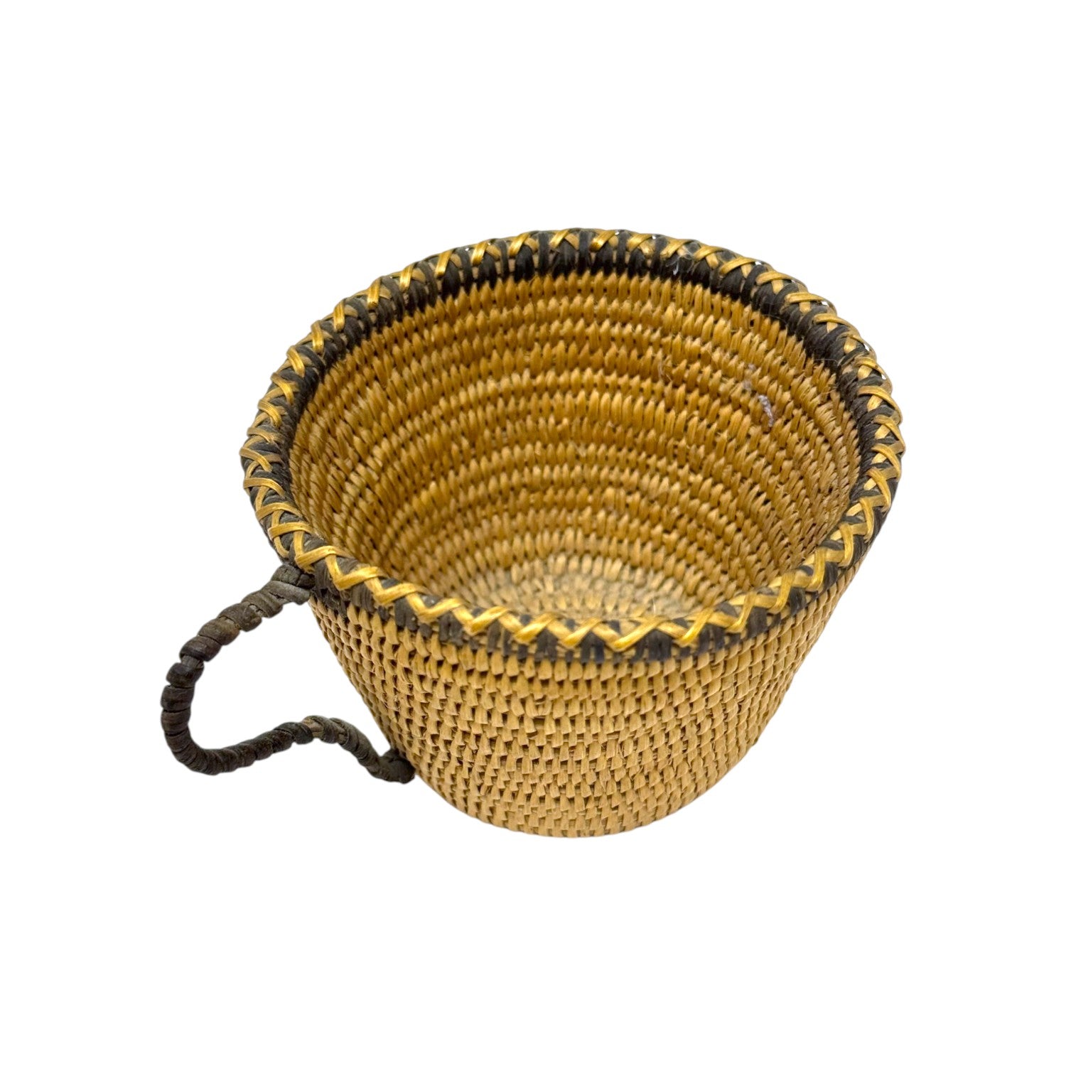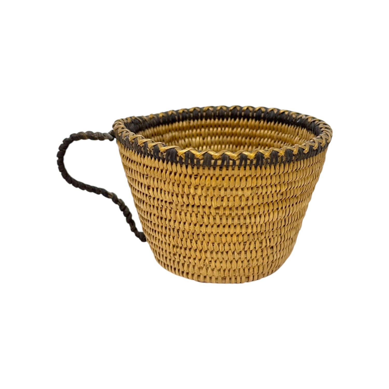 This handwoven vintage basket, crafted in the form of a cup, dates back to the 1960s and showcases the artistry of traditional basketry. Made from natural plant fibers, it features a warm golden tone with rich brown accents along the rim and handle. The finely coiled construction and tight weave speak to the weaver’s skill and attention to detail. Its charming cup shape, complete with a looped handle, makes it a rare and whimsical example of utilitarian folk art. Whether used for display or light function, it brings a rustic elegance and nostalgic character to any collection. This piece is not only a functional vessel but also a beautiful preservation of mid-century Indigenous weaving traditions.