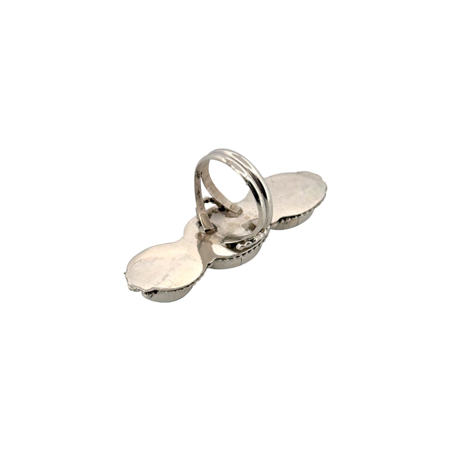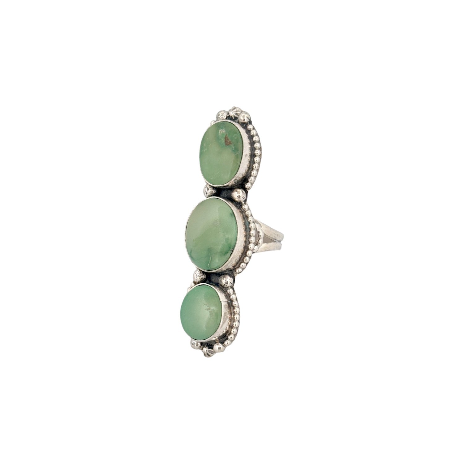 This Navajo handmade ring by Shiela Becenti features soft green Damele turquoise stones arranged in a graceful vertical design. Crafted in solid sterling silver, the smooth cabochons display natural color variations that give the piece a calm, earthy presence. Delicate silver bead accents frame each stone, adding texture without overpowering the design. The balanced layout reflects Becenti’s refined craftsmanship and attention to detail. Elegant and understated, this ring is perfect for collectors who appreciate subtle beauty in authentic Navajo jewelry.