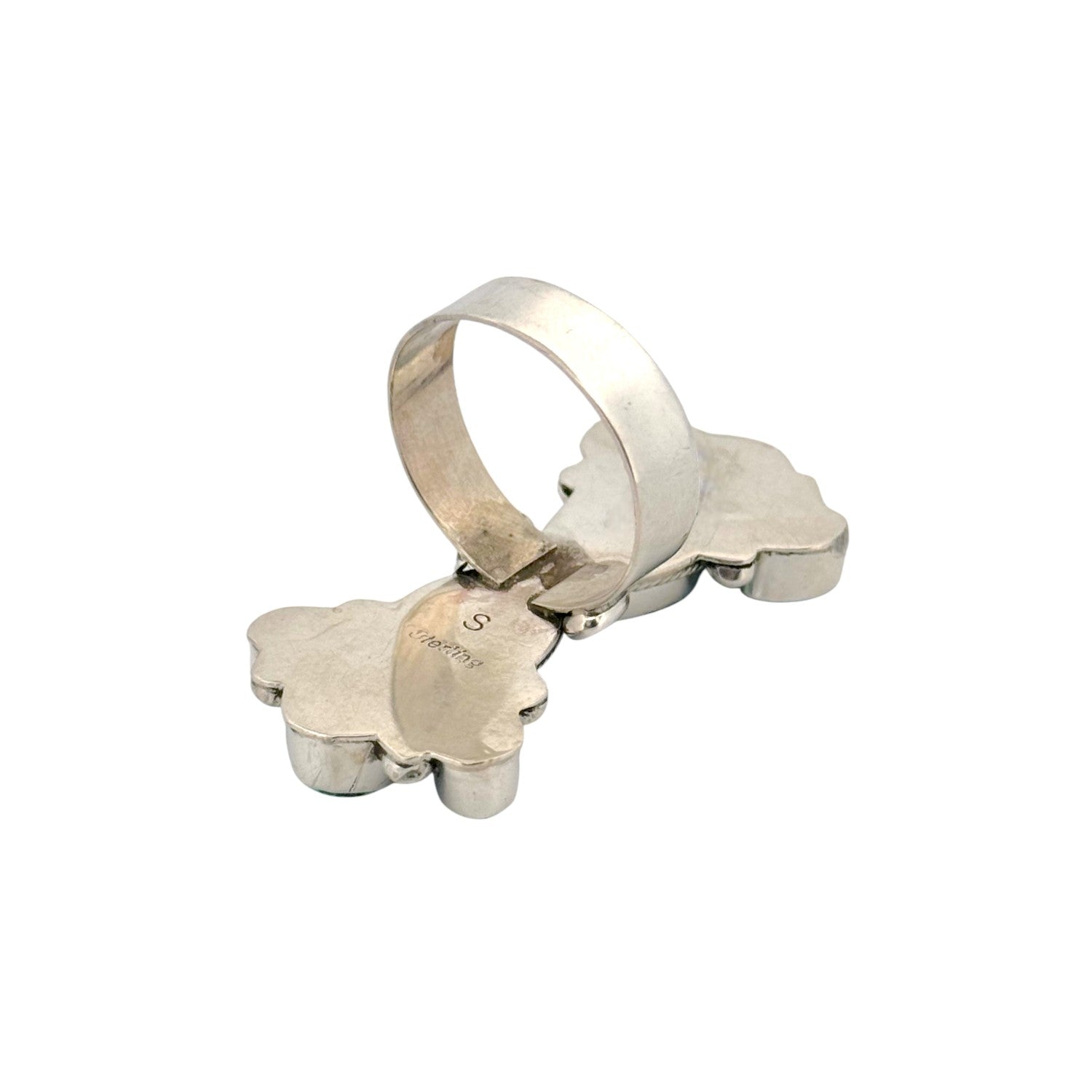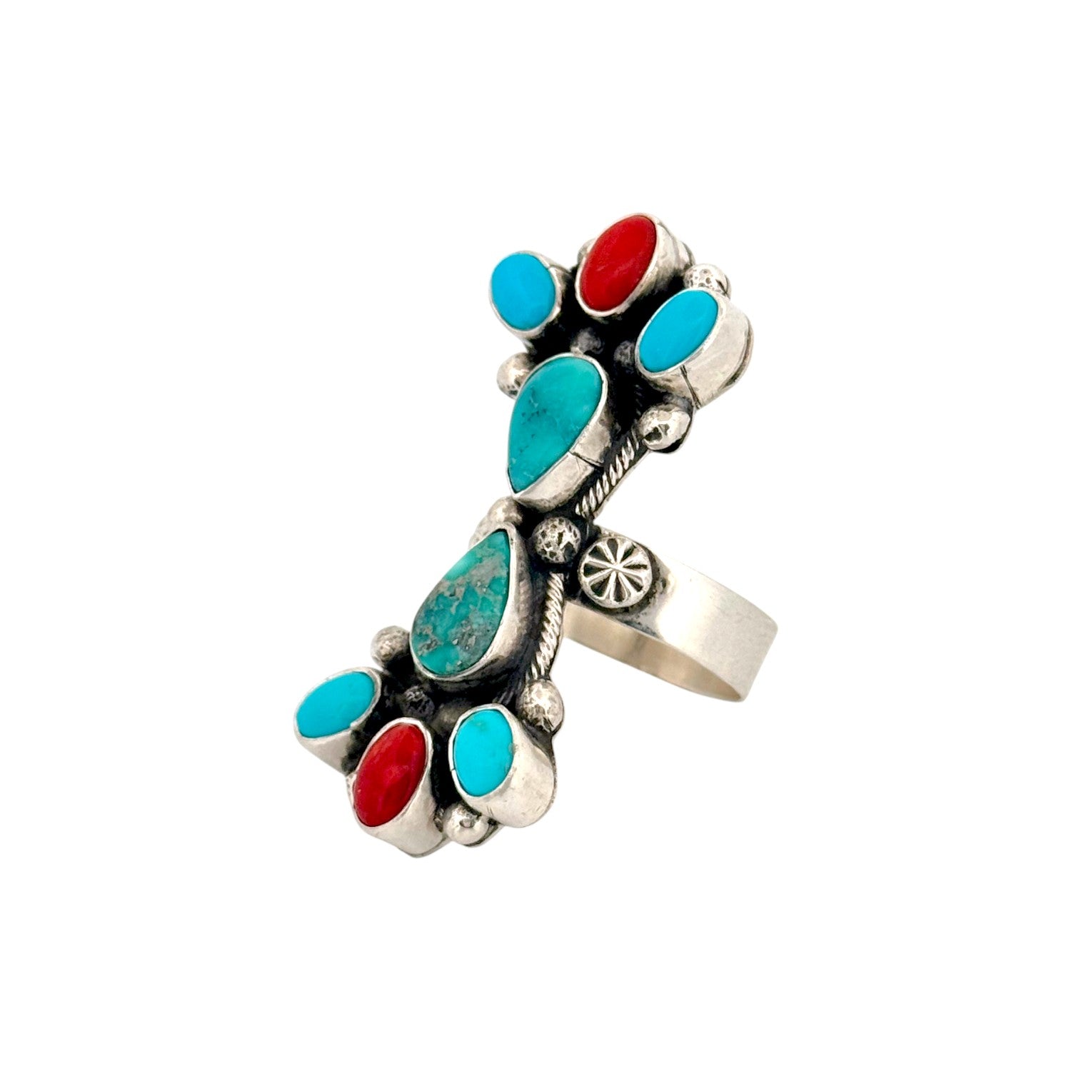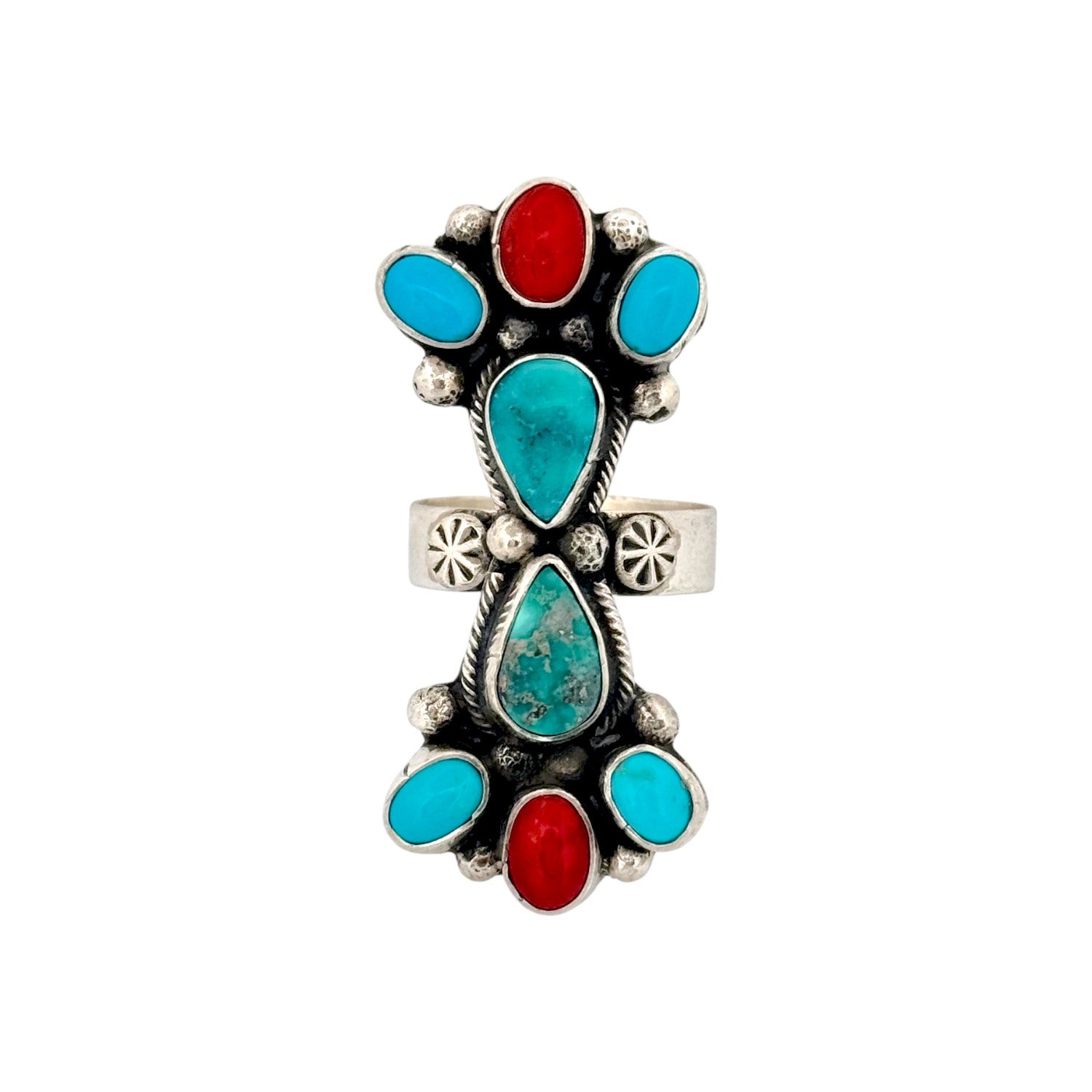 Handcrafted by skilled Navajo artist Sheila Becenti, this stunning multi-stone ring radiates the vibrant beauty of traditional Southwestern design. The piece features a dynamic combination of turquoise and red coral, symbolizing the harmony between earth and sky. Each stone is set in smooth sterling silver bezels and accented with polished silver drops and hand-stamped details, showcasing Sheila’s renowned artistry and attention to detail. The elongated design draws the eye and flatters the hand, making it both a bold statement and a timeless treasure. Its oxidized background enhances the vivid hues of the stones, creating striking contrast and depth.