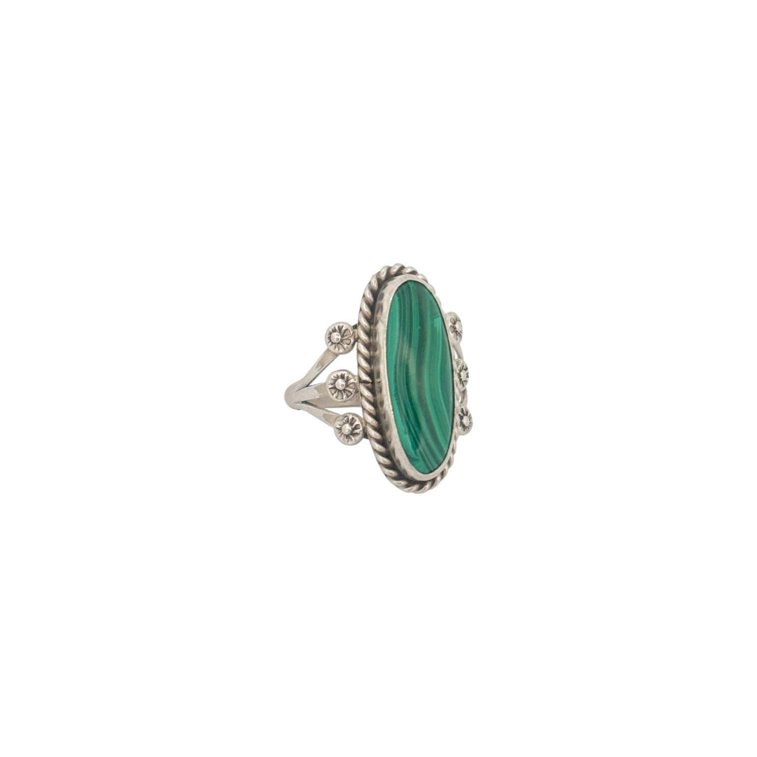 This Navajo handmade ring by Sheila Becenti features a striking oval malachite stone with rich green banding and natural depth. The stone is framed in a twisted sterling silver rope bezel, adding texture and traditional Navajo elegance. Silver starburst drops accent each side of the setting, creating symmetry and a refined decorative touch. The split shank design provides both comfort and stability while showcasing Becenti’s clean, precise silverwork. Bold, earthy, and beautifully crafted, this ring is a standout example of Sheila Becenti’s artistry.