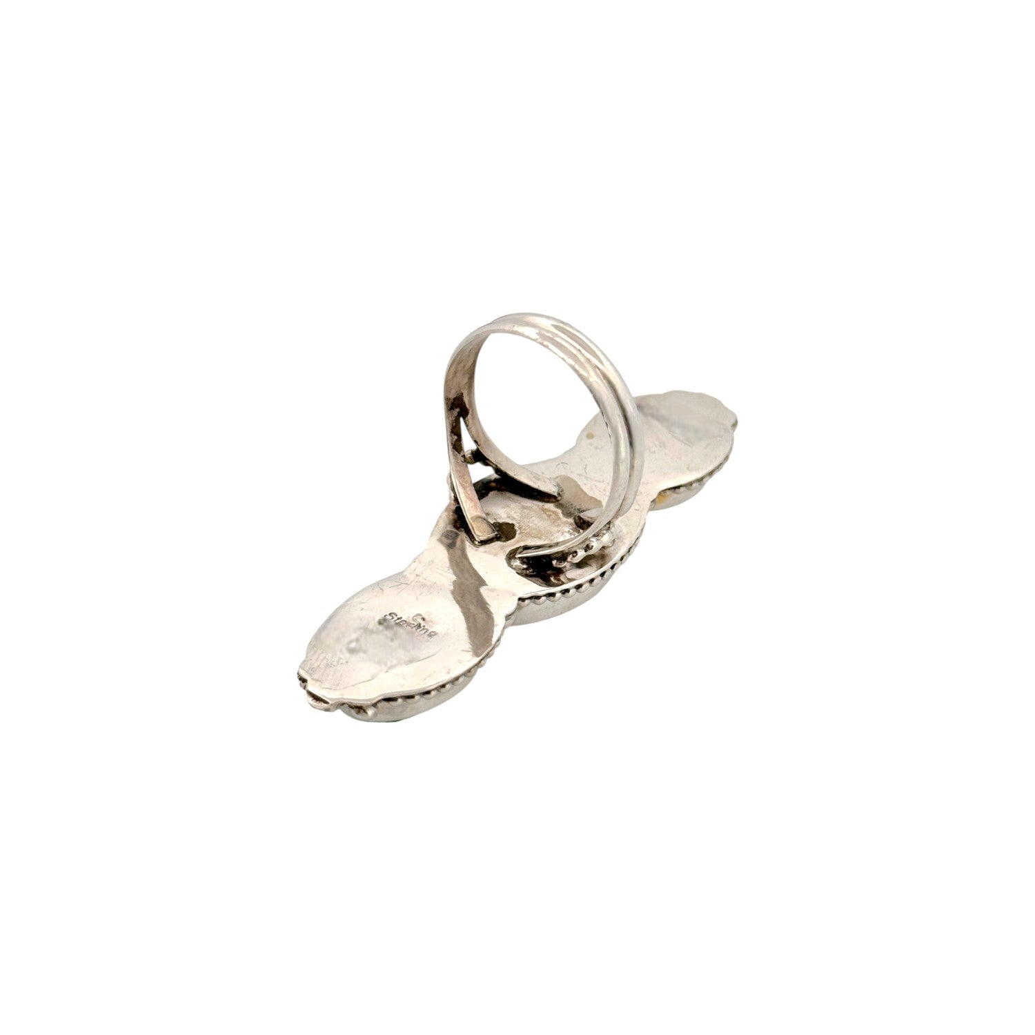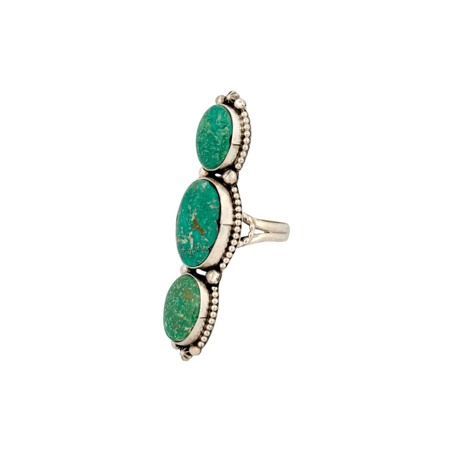 This handcrafted Navajo ring by Sheila Becenti features three vibrant Carico Lake turquoise stones, each showcasing natural green hues and unique matrix patterns. The stones are set in polished sterling silver with delicate beadwork accents that frame their organic beauty. Its elongated, vertical design creates a bold silhouette, making the ring a standout statement piece. Traditional Navajo elements, including subtle stampwork and raised silver detailing, add texture and depth to the overall composition. A beautiful example of Becenti’s refined craftsmanship, this ring celebrates the rich color and character of Carico Lake turquoise.