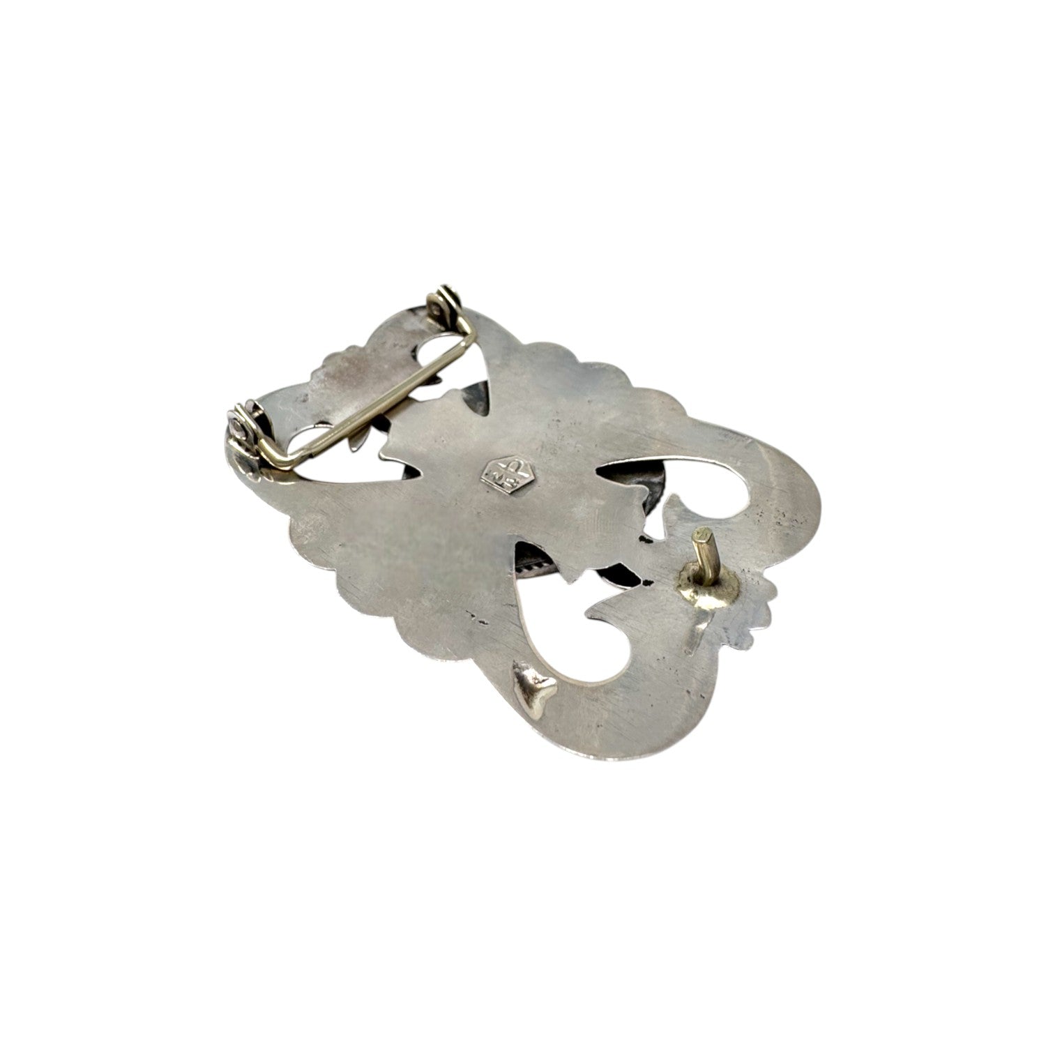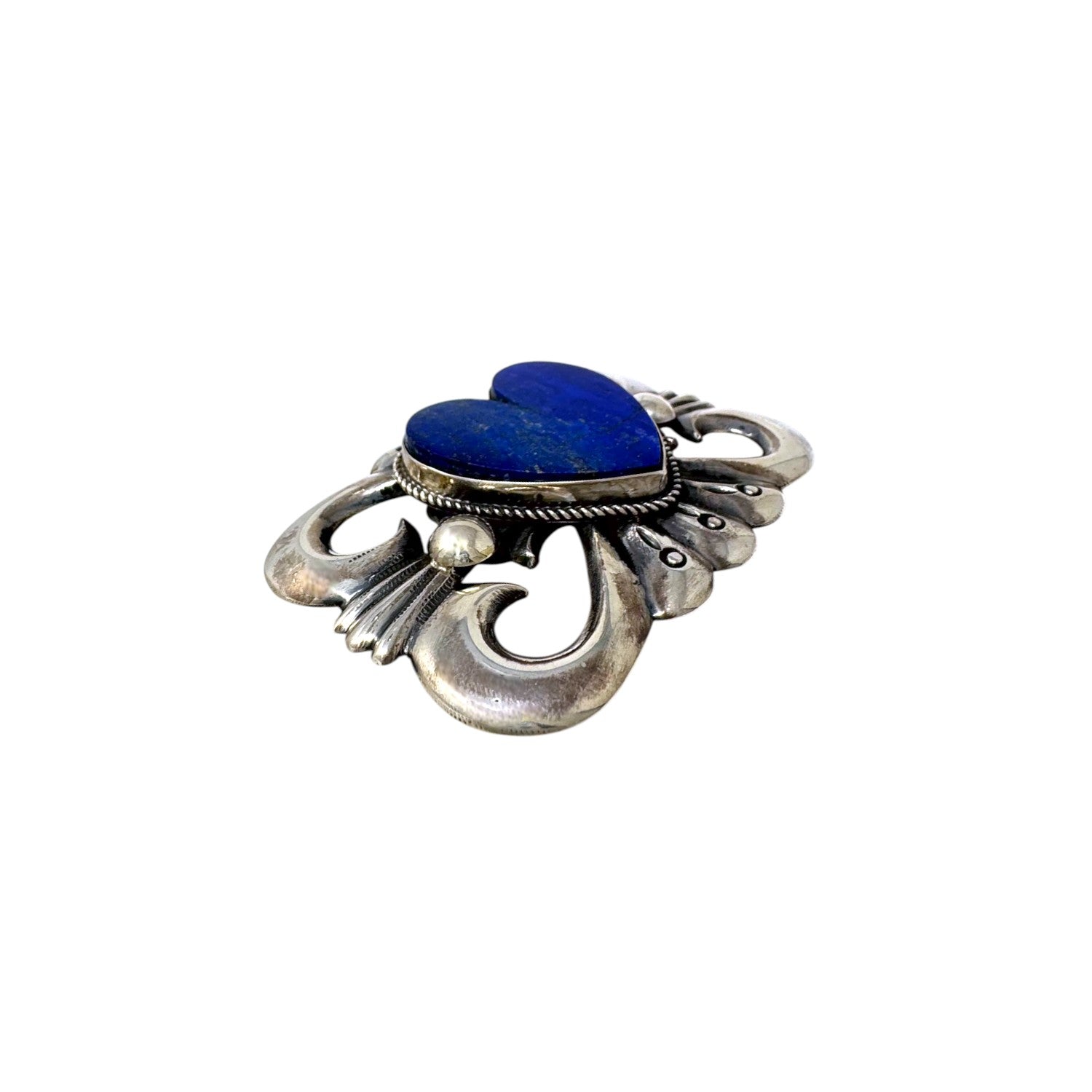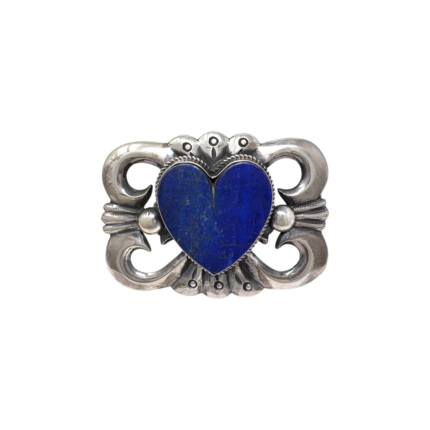 This captivating buckle by Navajo artisans Carole and Wilson Begay features a heart-shaped Lapis stone, symbolizing love, strength, and inner truth. The deep blue lapis, flecked with golden inclusions, is set in intricately hand-stamped sterling silver, creating a bold yet elegant presence. Graceful curves and balanced symmetry frame the centerpiece, blending traditional Navajo silverwork with a romantic twist. The polished silver enhances the rich hue of the lapis, allowing the stone to radiate with depth and intensity. Known for their collaborative craftsmanship, the Begay's bring a sense of harmony and intention to every detail.