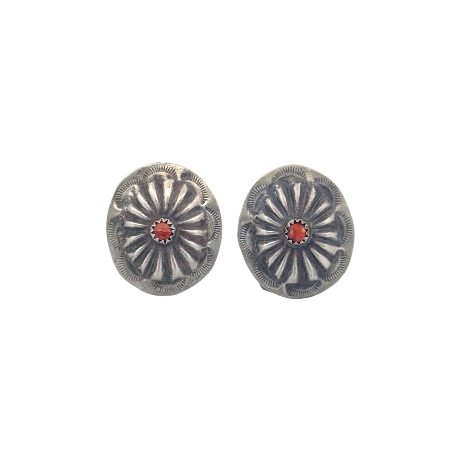 These beautiful earrings by Navajo artist Joan Begay embody the elegance of traditional Navajo silversmithing. Handcrafted in sterling silver, each earring features a bold concho-style design with deeply stamped radiating patterns that create a sense of movement and depth. At the center rests a vibrant spiny oyster shell cabochon, its warm orange-red tones adding a striking contrast to the oxidized silver background. The combination of silver and shell captures both strength and natural beauty, reflecting the harmony found in Navajo artistry. Compact yet eye-catching, these earrings are versatile enough for everyday wear while carrying the richness of cultural tradition. Joan Begay’s craftsmanship shines through in the intricate details, making this pair a timeless addition to any collection.