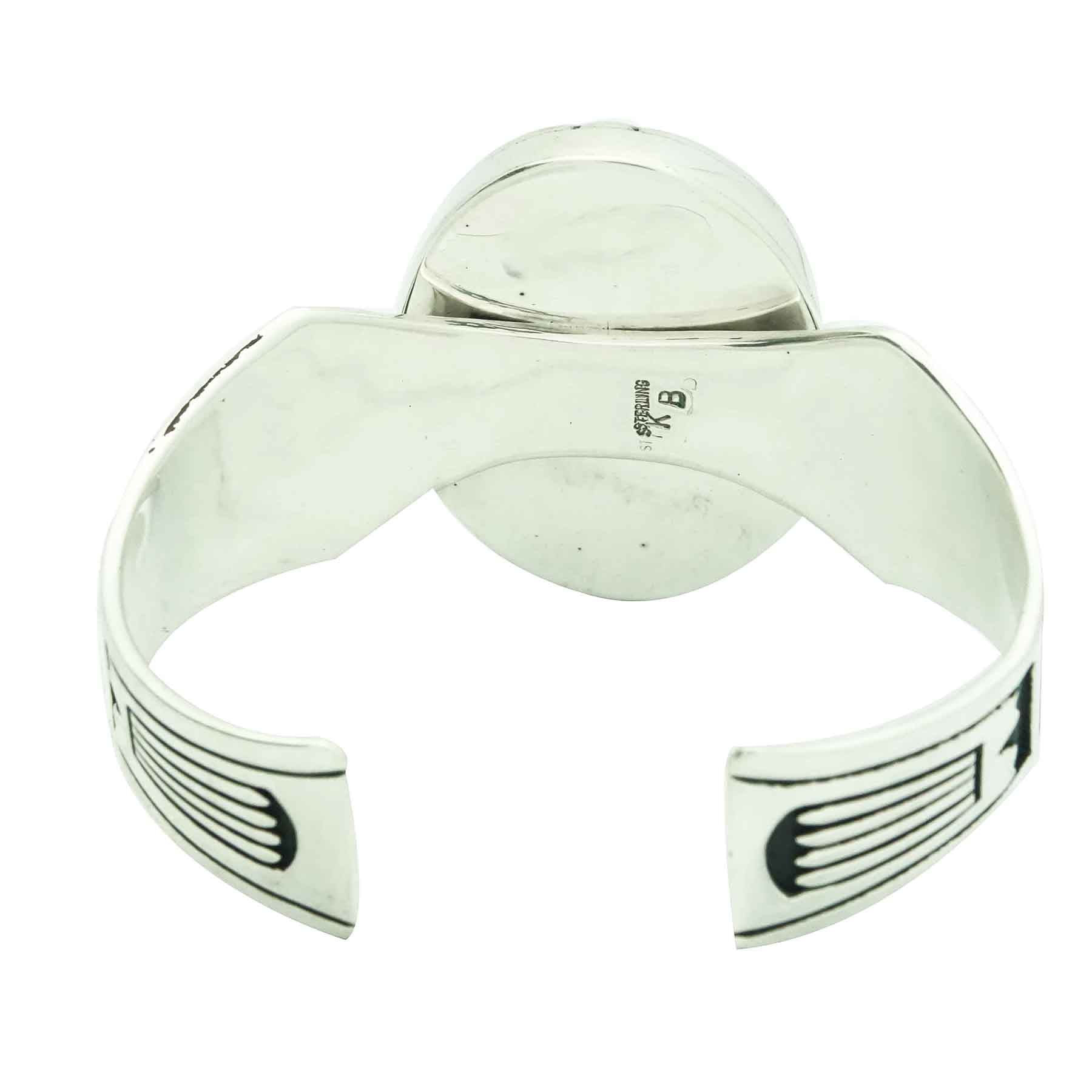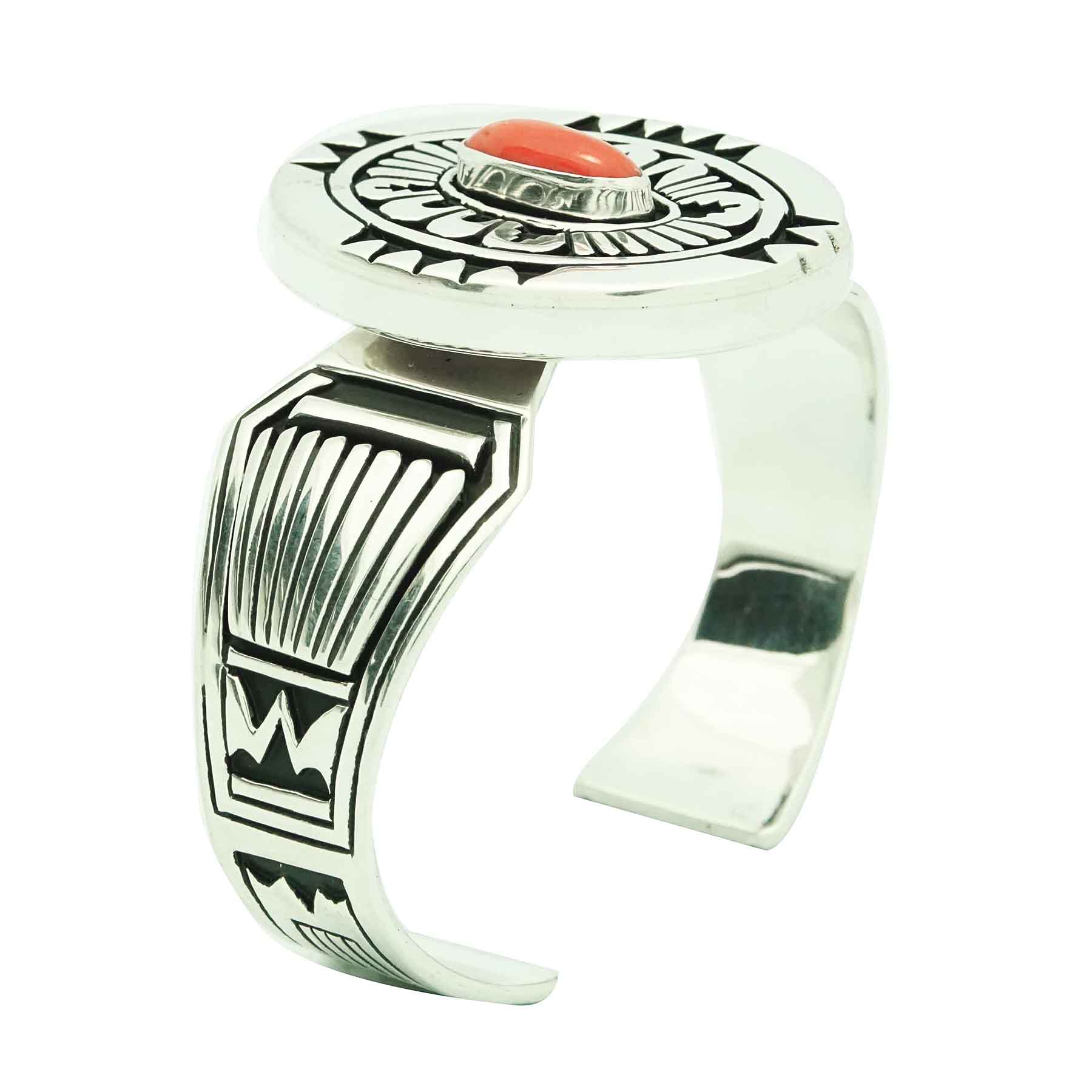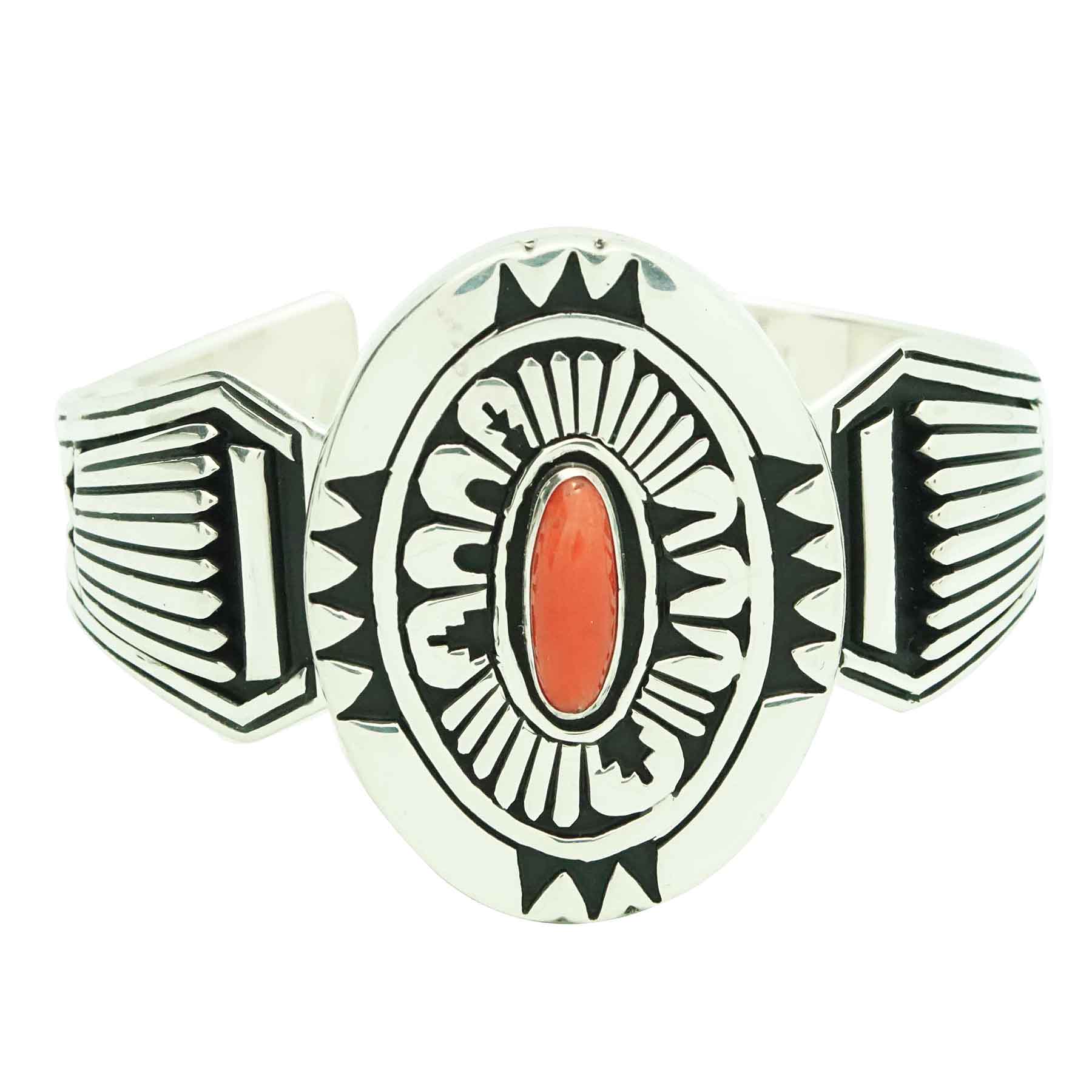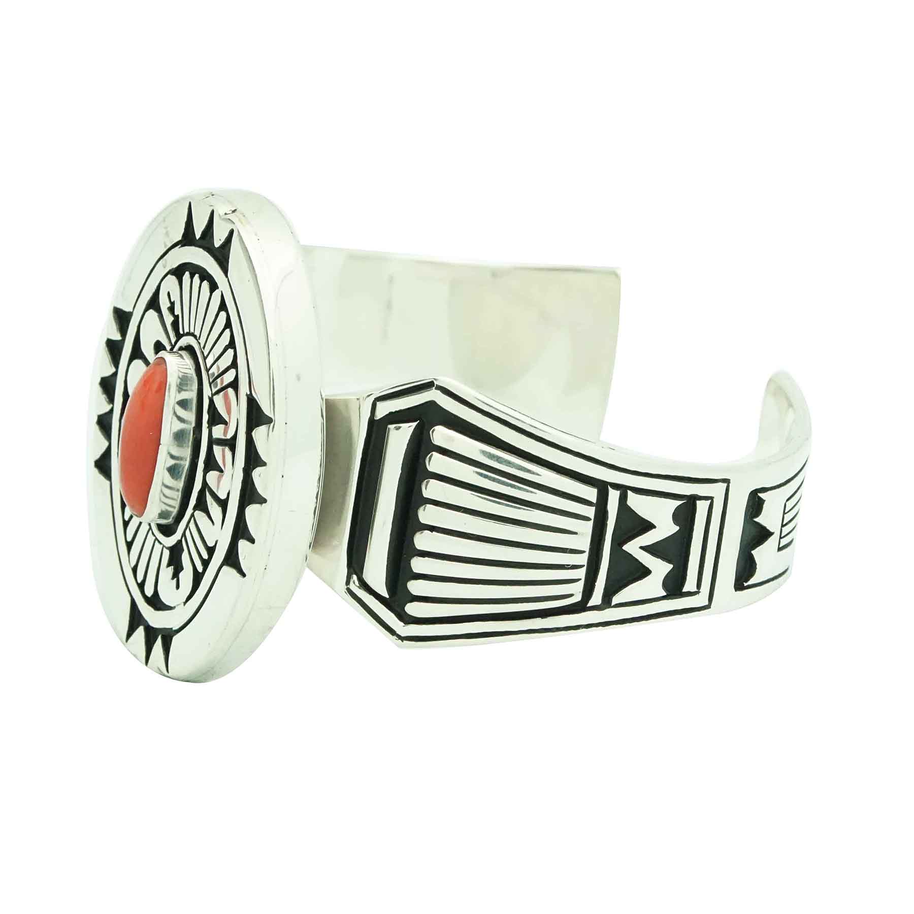 Navajo artist Kary Begay does an extraordinary job of decorating her silver with Navajo inspired overlay designs. You will find this cuff styled with several fans that play an important part in ceremonies. Plus, she uses cutouts that have been inspired by Navajo rugs. Everything is brought together on this amazing cuff that displays a stunning piece of deep red Mediterranean Coral. Kary sets the coral in the center of this hollow oval creation that sits above the comfortable wearing bracelet shank. With the combination of polished and black oxidized silver the piece really stands out.