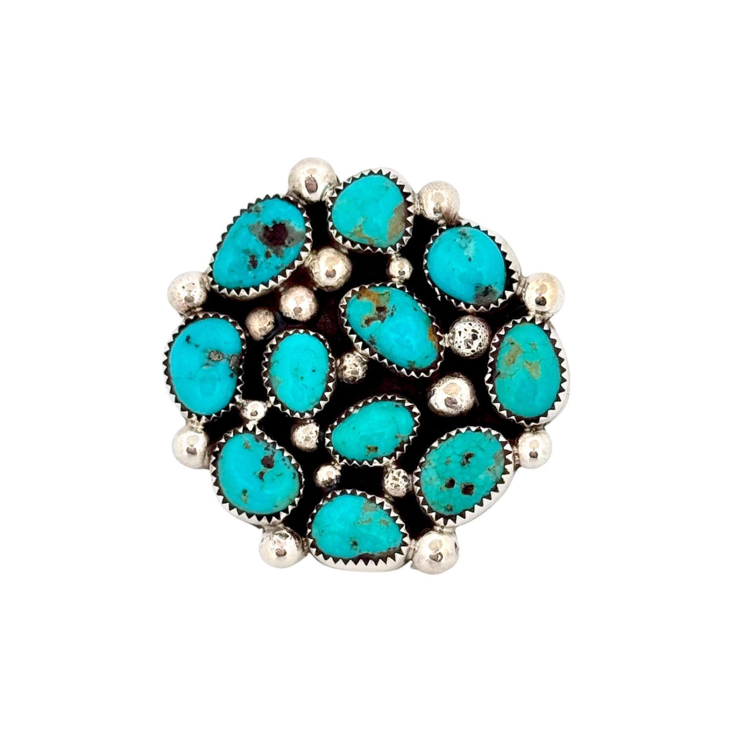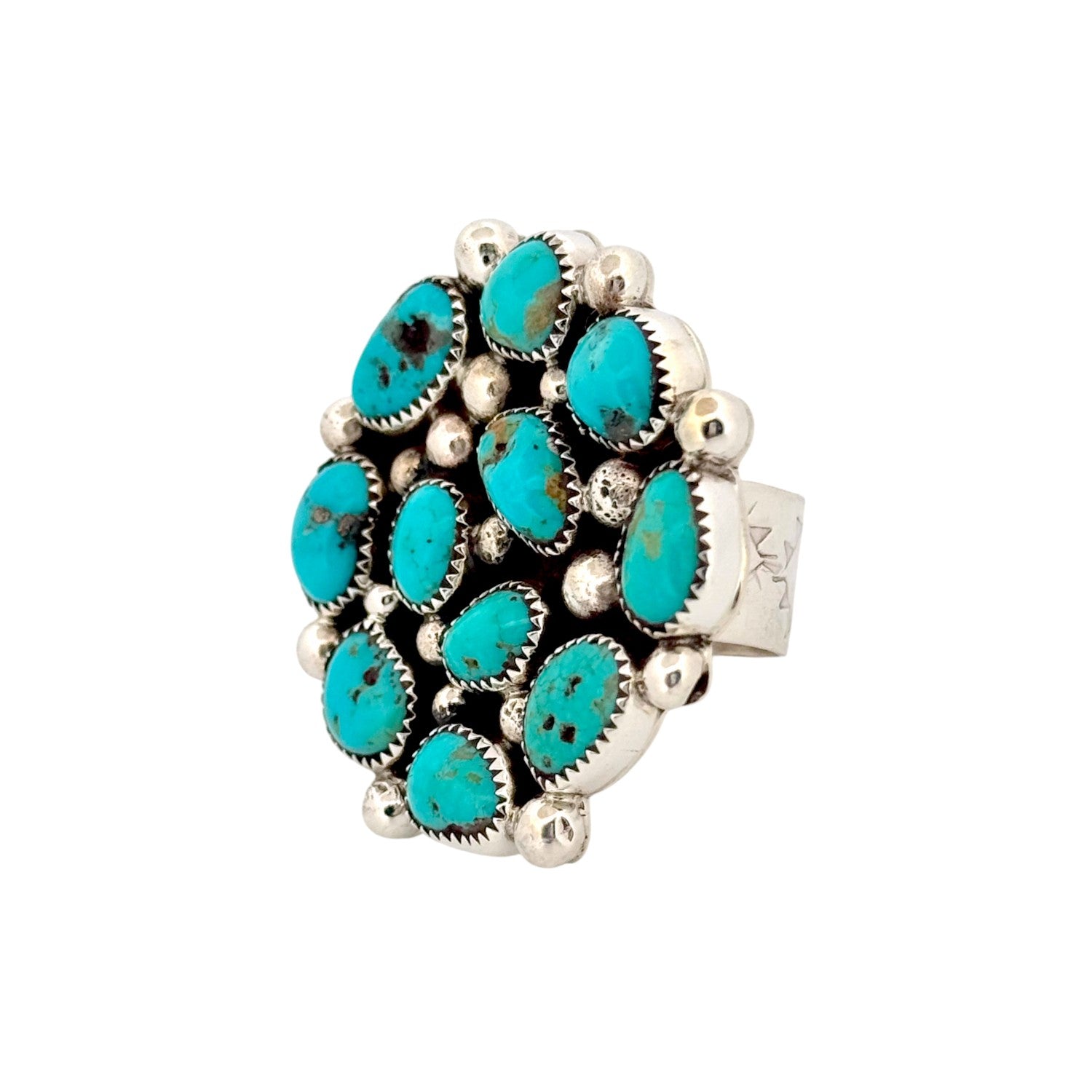 This striking ring by Navajo artist Darlene Begay features the bold beauty of Kingman Turquoise set in sterling silver. The round cluster design showcases multiple oval turquoise stones, each with unique matrix patterns, arranged in a balanced and eye-catching composition. The stones are set in serrated bezels, surrounded by polished silver drops that add texture and depth. The oxidized background enhances the vivid blue tones of the Turquoise, making the stones stand out brilliantly. Handcrafted with precision, the ring reflects the traditional Navajo cluster style while carrying Begay’s distinctive artistry. Its wide face and solid construction make it a statement piece, perfect for those who appreciate bold, authentic Southwestern jewelry.