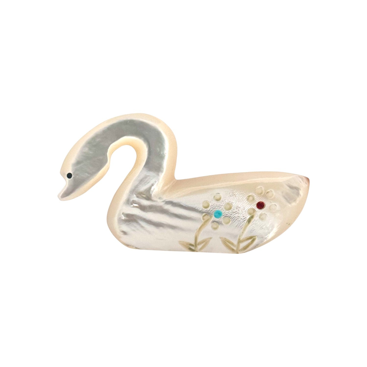This exquisite Zuni swan fetish by Cheryl Beyuka is hand-carved from a luminous mother of pearl, radiating an iridescent glow that shifts beautifully in the light. The graceful curvature of the neck and the smooth, streamlined body capture the swan’s elegance and serene presence. Delicate inlaid details adorn the carving, including a floral motif on its side crafted from turquoise, coral, and other stones, symbolizing beauty and renewal. In Zuni tradition, the swan is often associated with grace, transformation, and spiritual harmony. The natural shimmer of the mother of pearl enhances the piece’s refined aesthetic, making it both a visual and symbolic treasure.