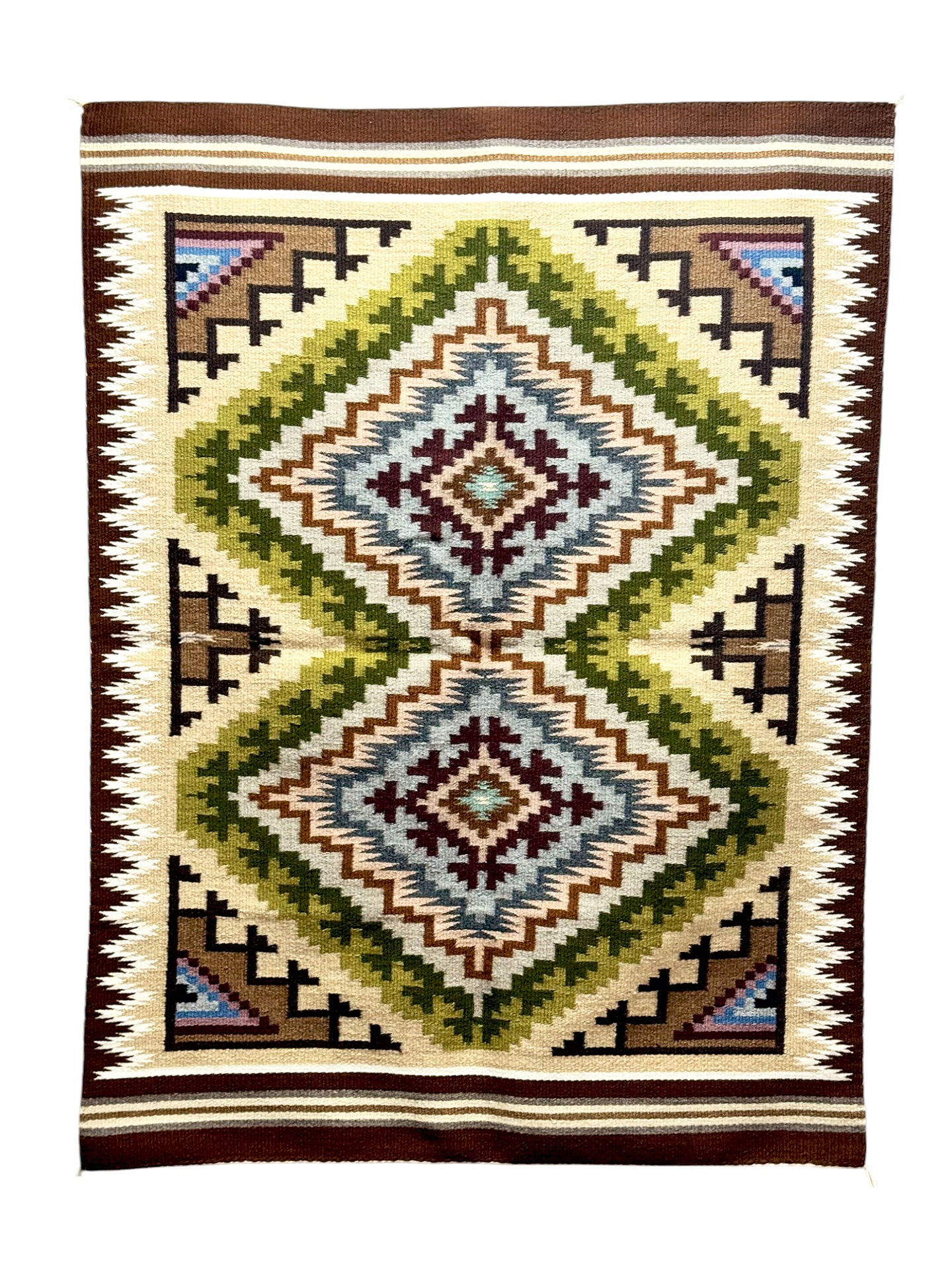 The favorite weaving for many collectors is the Two Grey Hills. Famous because of the natural sheep colors and the stiff feel of churro wool. Many Two Grey Hills will have very complex patterns, and it takes a significant amount of time to realize all of the hidden symbols. Patterned after the classic Diamond designs this is definitely a style you need in your growing collection of rugs.