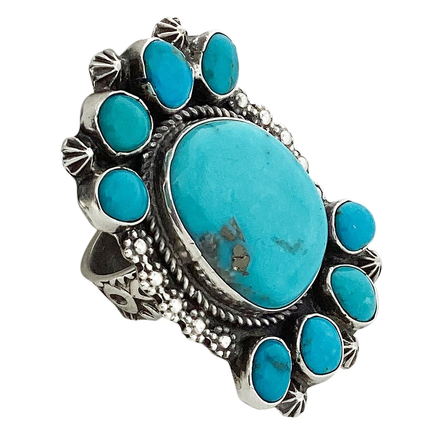 Navajo silversmith Kevin Billah made this gorgeous turquoise cluster stone ring. He uses an almost matrix free stone from the legendary Mining District outside of Kingman, Arizona. The collection of nine Kingman Turquoise stones make the unique cluster design. If you are into Navajo turquoise clusters then you are going to love this ring. Kevin dresses up the nine turquoise stones with silver drops, twisted wire, and stamped beads. He finishes it with an easy wearing stamped split ring band that will fit any finger. You are going to love this one.