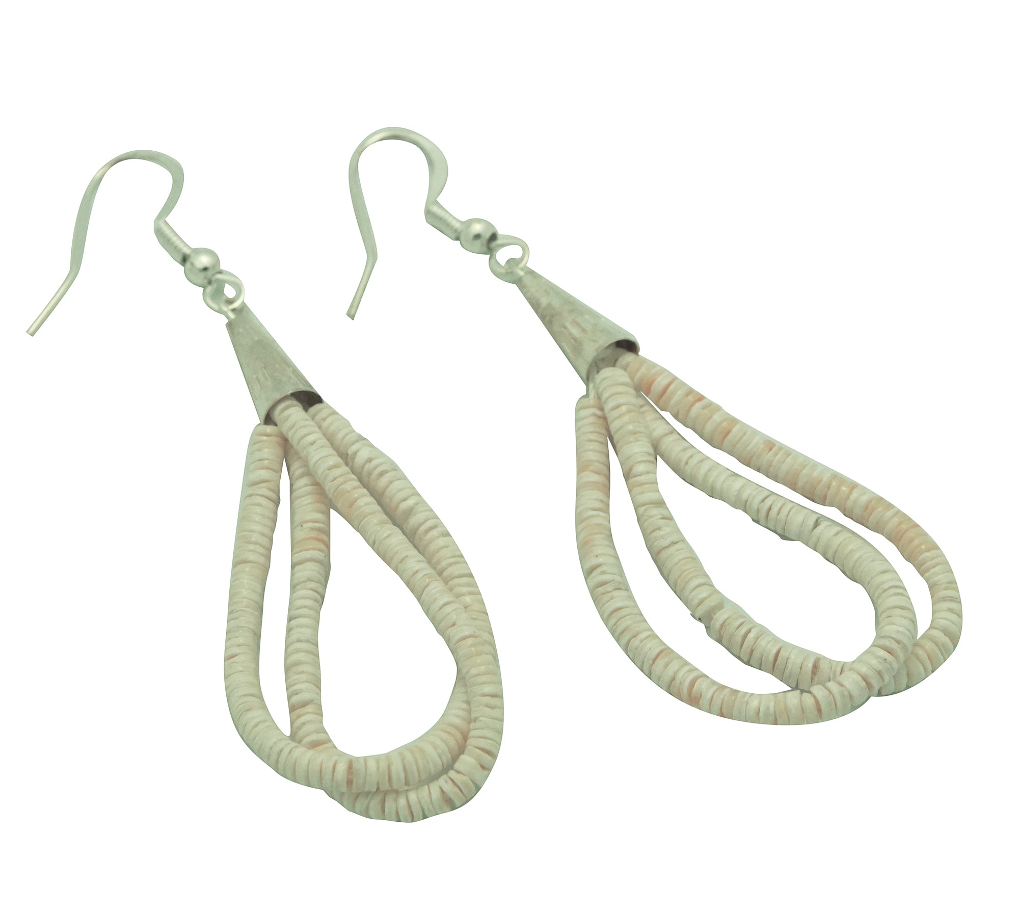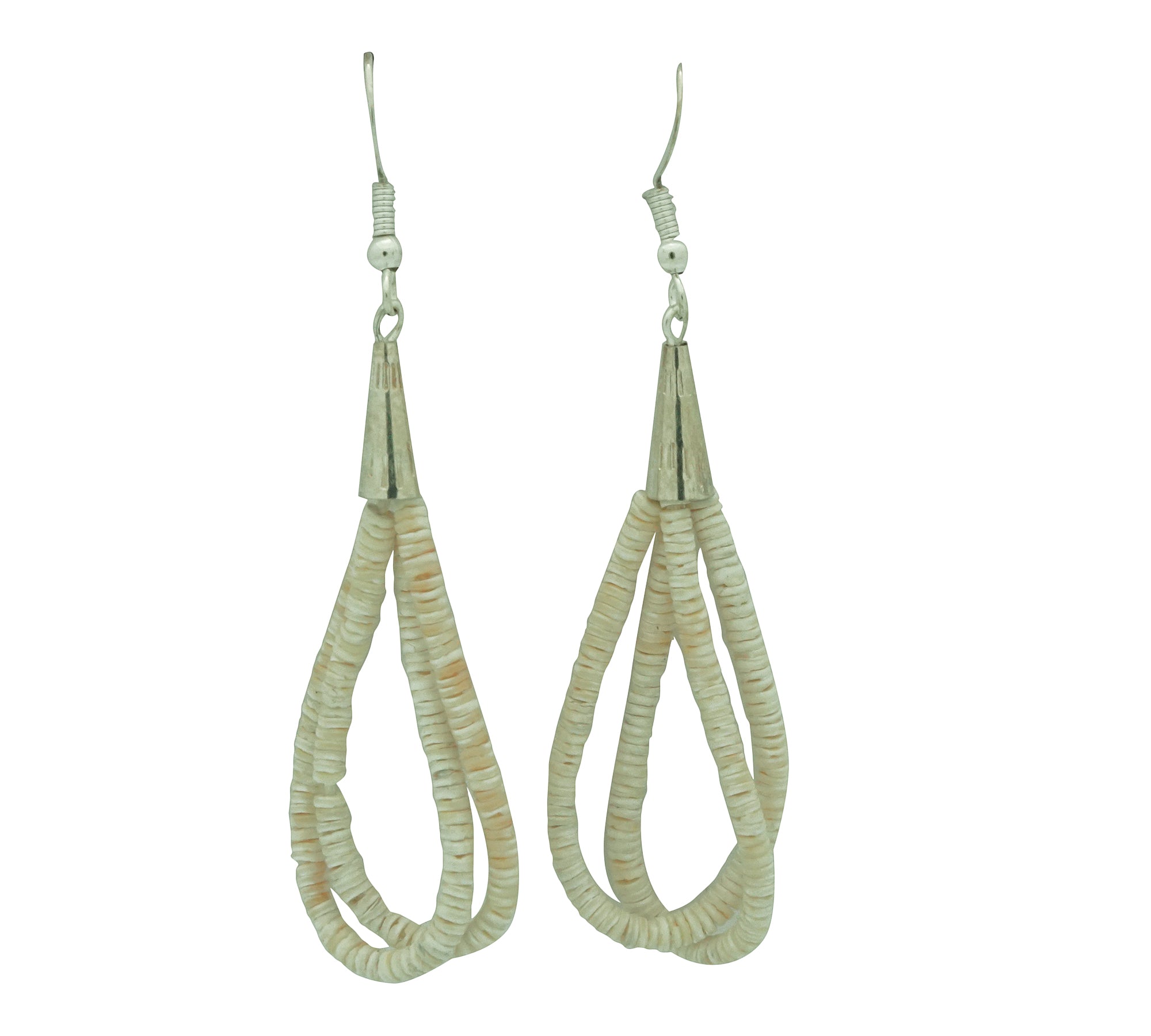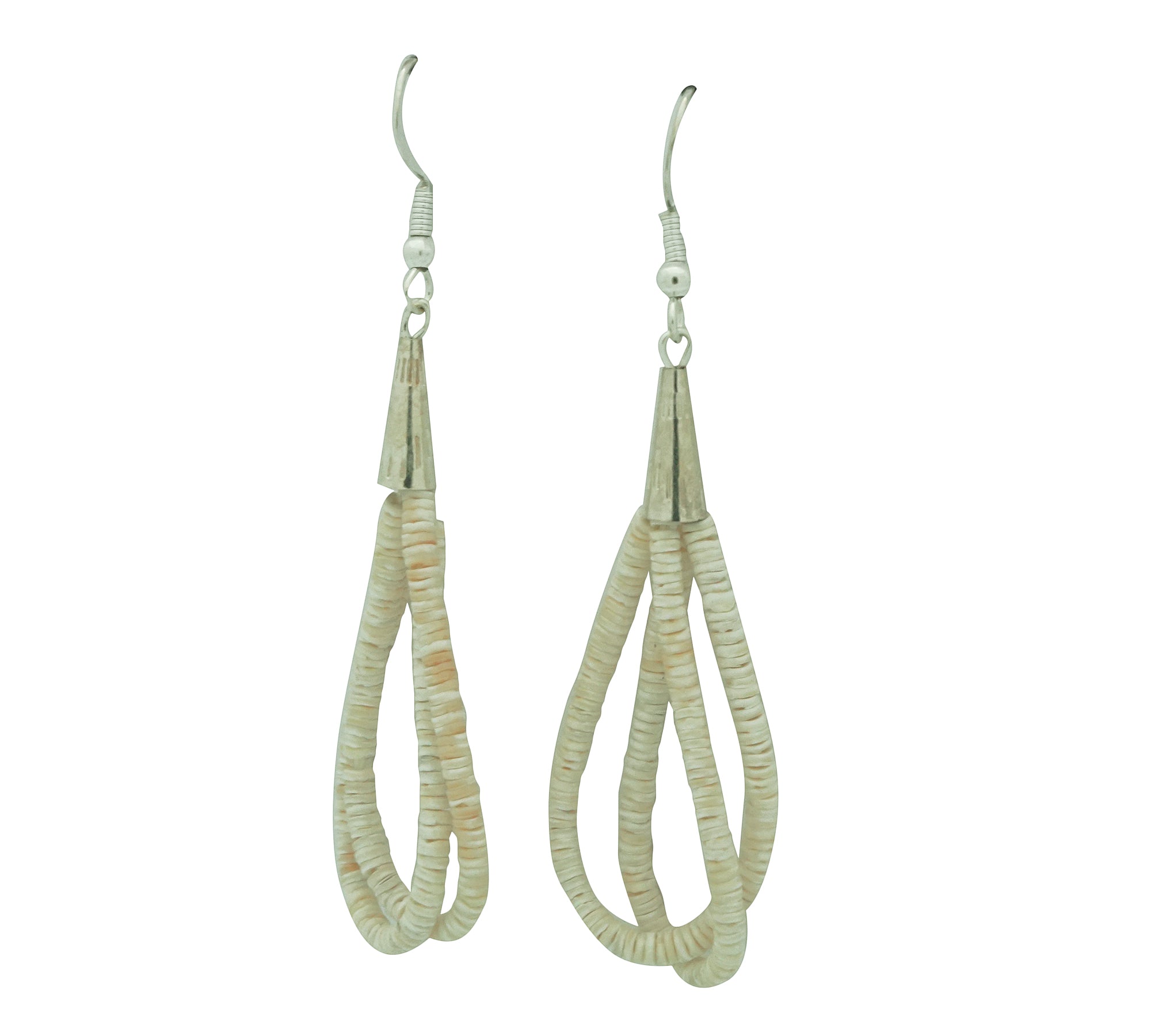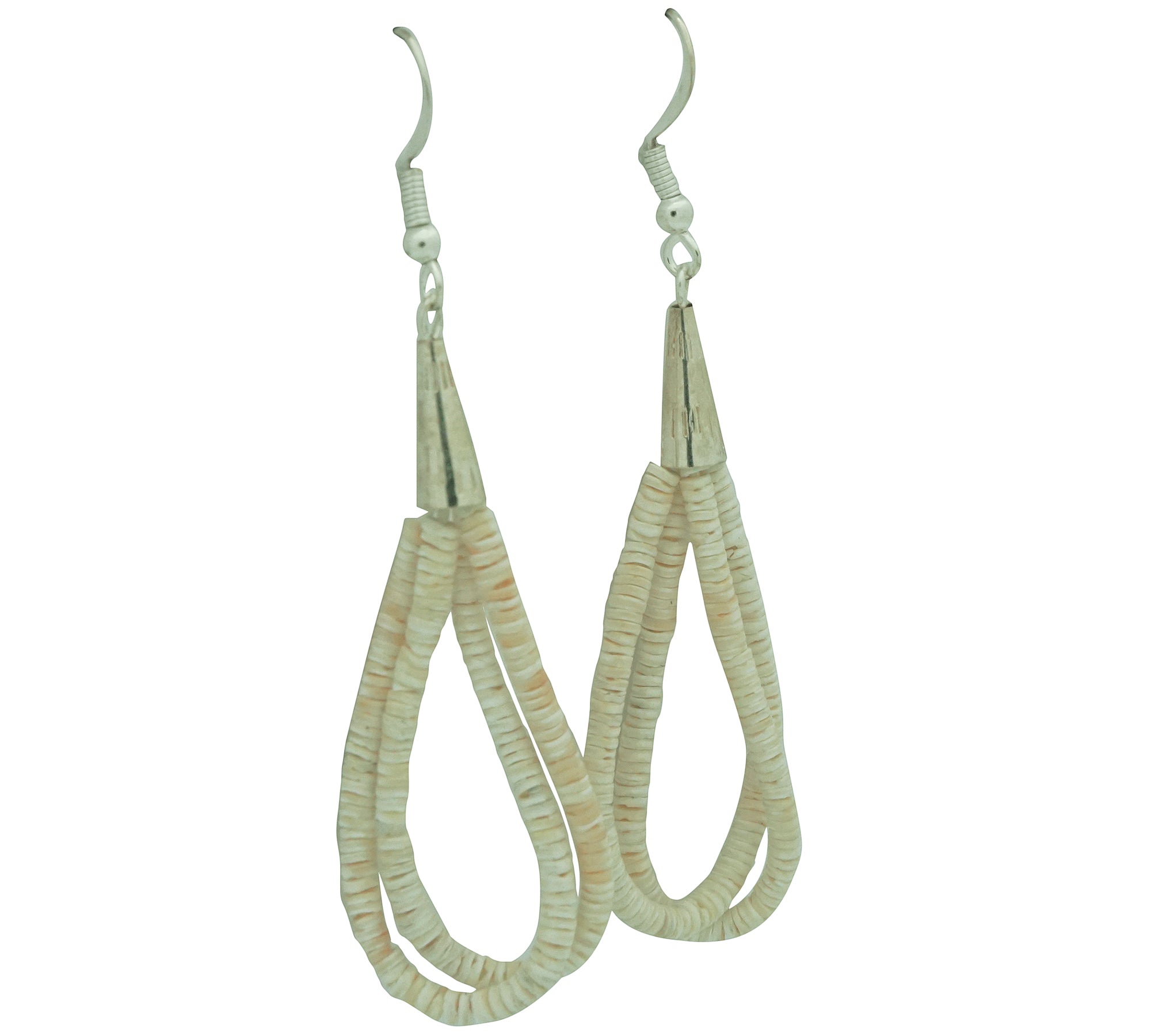 These gorgeous dangle earrings are made by Santo Domingo artist Ramona Bird. They begin with a sterling silver French hook that leads into a cone. Dangling below is signature Santo Domingo heishe. You will find the small shell heishe in neutral New Mexico inspired colors that can be worn with almost any outfit. We have a collection of these style earrings so make sure you look through the online Trading Post to get the perfect one.