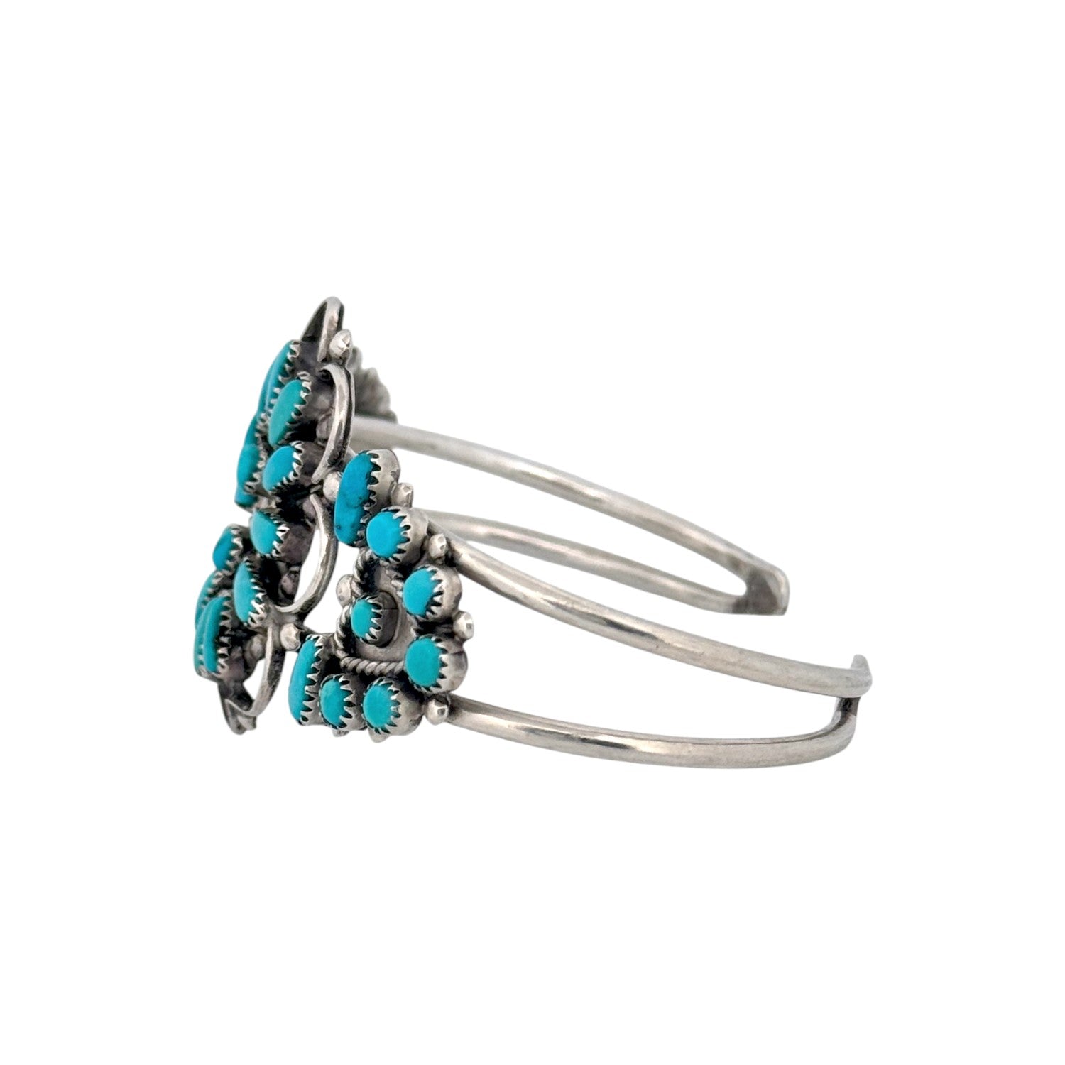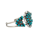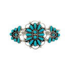 This exquisite Zuni handmade bracelet by Viola and Jacob Bobelu captures the timeless artistry of traditional Zuni cluster work. Handcrafted from sterling silver, it features brilliant Sleeping Beauty Turquoise stones arranged in a radiant floral pattern that reflects precision and balance. Each turquoise stone is hand-cut and set in delicate bezels, framed by silver beads and twisted wire for added texture and depth. The split-shank cuff enhances the design’s symmetry and provides a comfortable, elegant fit.