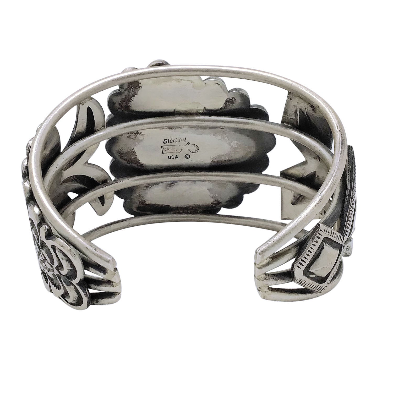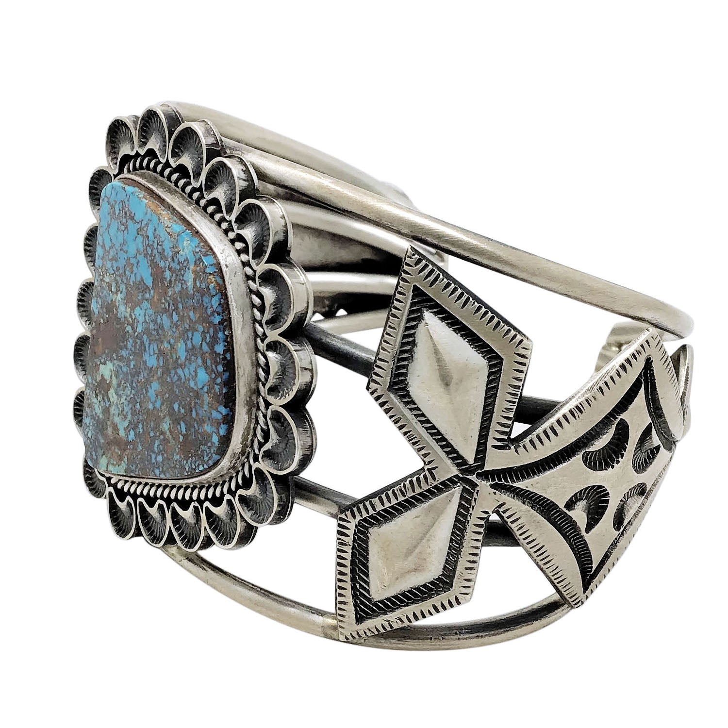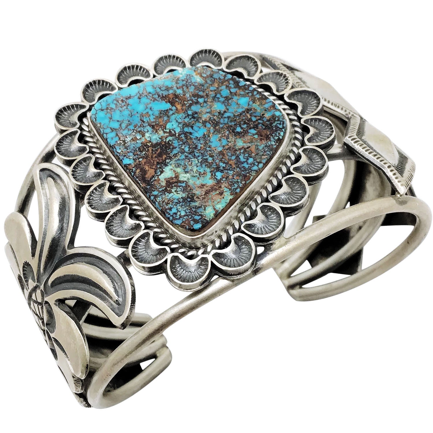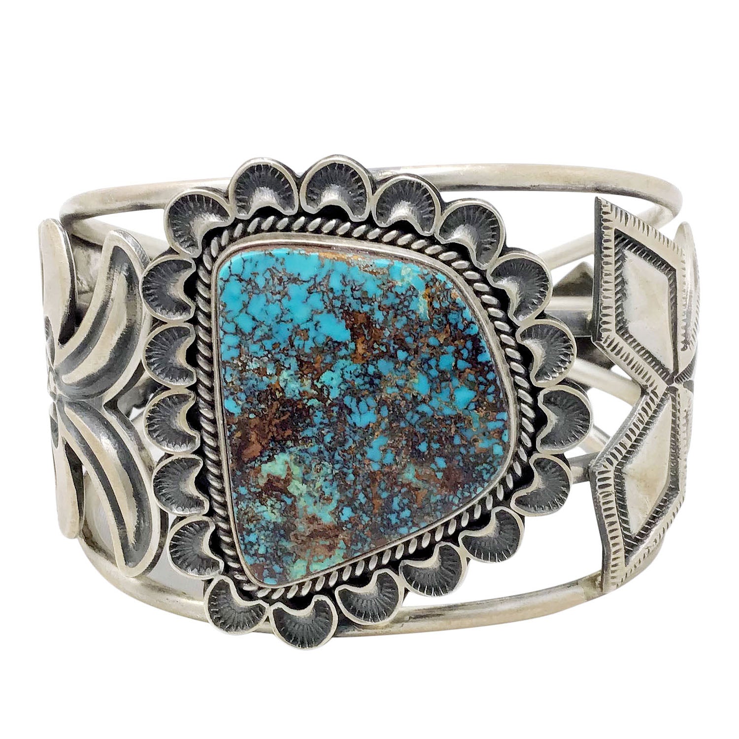 The stone on this cuff is absolutely stunning. It is a classic Nevada rock, Pilot Mountain Turquoise. This rock displays a combination of black and brown matrix that sits on magnificent blue turquoise. The stone has a free form cut which works nicely with the style of silver work. Navajo silversmith Randy Boyd has surrounded the stone with lots of silver design. You will find twist wire and stamped cutouts surrounding the rock. The cuff is an easy wearing four-wire piece that tapers nicely at each end. Randy has given the silver an antique brushed finish that compliments the rock and style perfectly. A great cuff that will show your appreciation of original handmade Navajo wearable art.