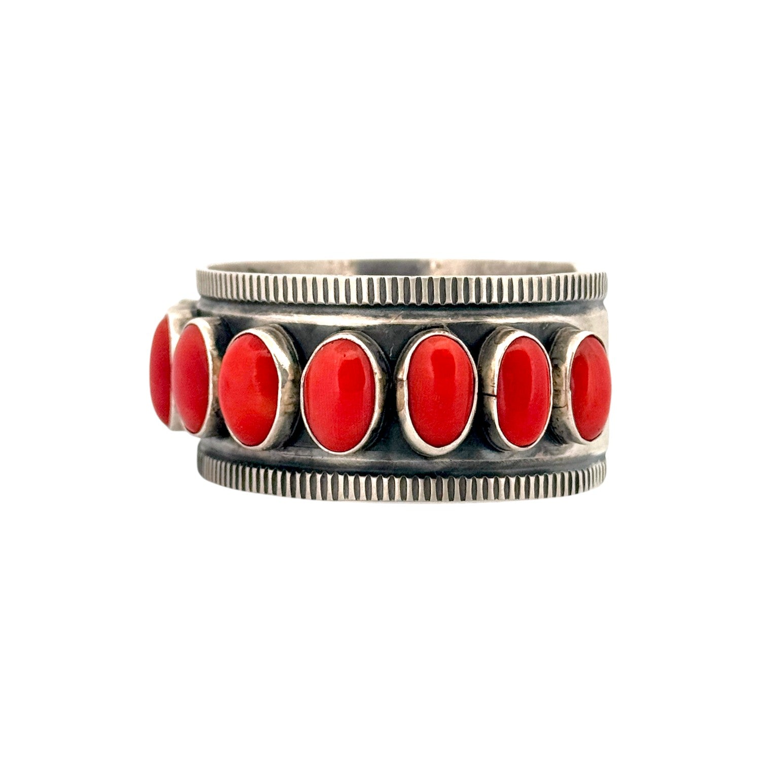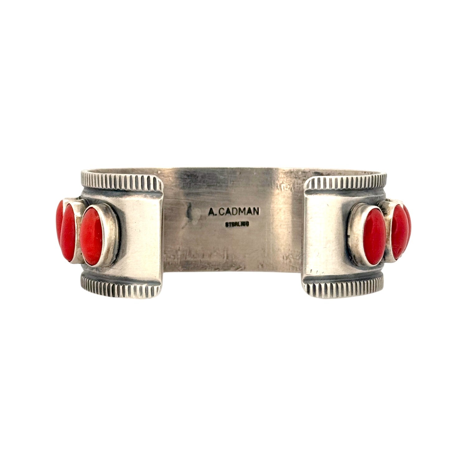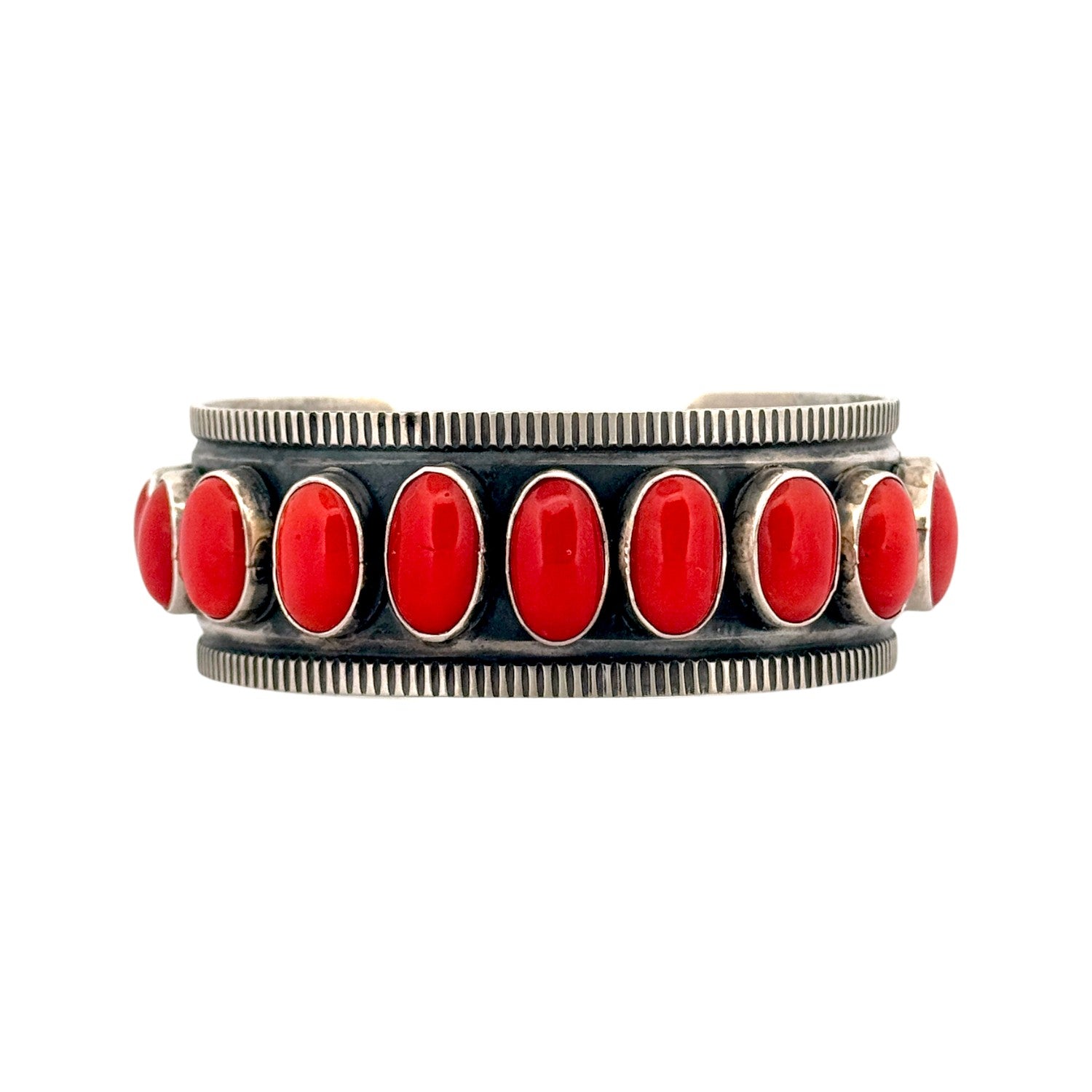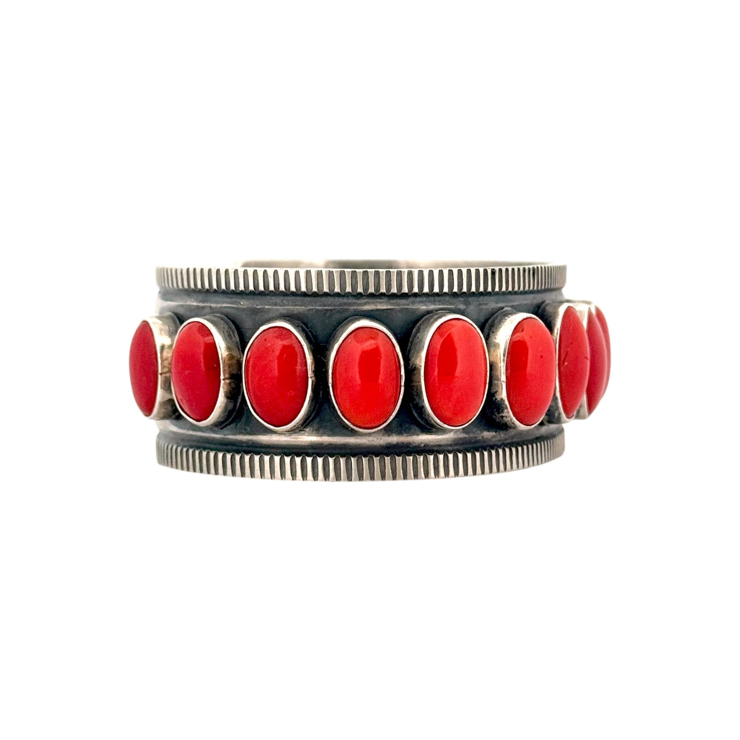 This Navajo handmade bracelet by Andy Cadman is a striking example of traditional Southwestern artistry and fine silversmithing. Crafted from sterling silver, the cuff features a row of vivid red coral cabochons, each expertly hand-set in smooth bezels. The intense coral color stands out beautifully against the dark, oxidized background, creating a bold and timeless contrast. Fine stamp work and precisely filed edges frame the stones, adding texture and balance to the design. The bracelet’s solid construction and substantial weight reflect A. Cadman’s signature craftsmanship; strong, detailed, and elegant. Each stone is carefully matched for color and shape, showcasing the artist’s meticulous eye for harmony. This piece perfectly embodies the spirit of Navajo tradition, combining natural beauty with enduring craftsmanship.