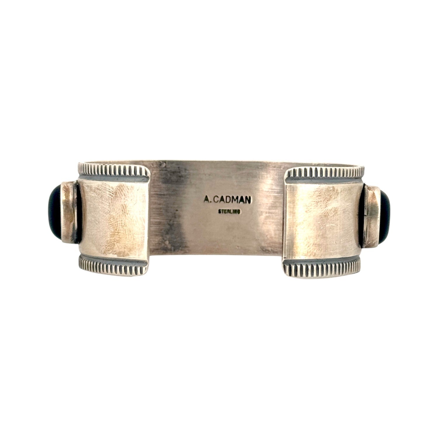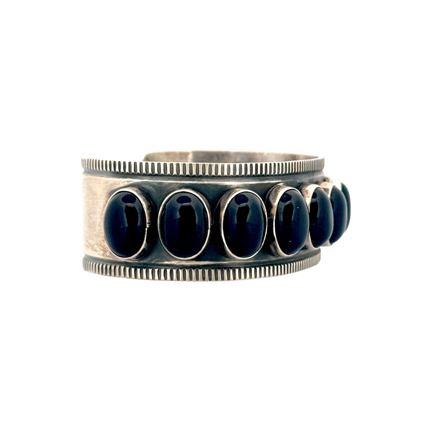 This Navajo handmade bracelet by Andy Cadman exemplifies classic Southwestern elegance and expert silversmithing. Crafted from sterling silver, the cuff features a striking row of polished black onyx cabochons, each securely set in a hand-formed bezel. The deep, glossy stones contrast beautifully with the oxidized silver background, highlighting the rich texture and depth of the design. Intricate stamp work and fine filed edges frame the stones, showcasing the artist’s meticulous attention to detail and craftsmanship. The bracelet’s substantial weight and balanced design make it both bold and refined—perfect for everyday wear or special occasions. A. Cadman’s work is celebrated for its strength and traditional Navajo style, and this piece is a fine example of that enduring artistry.