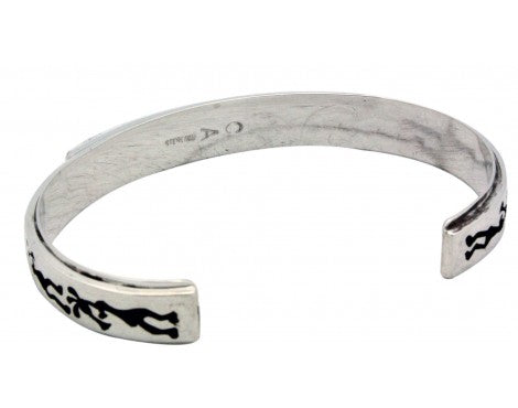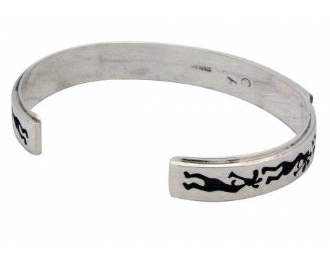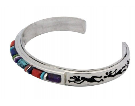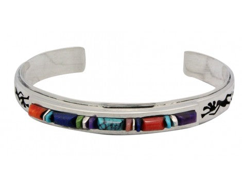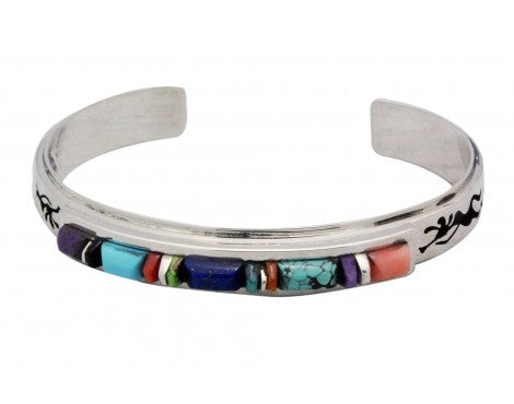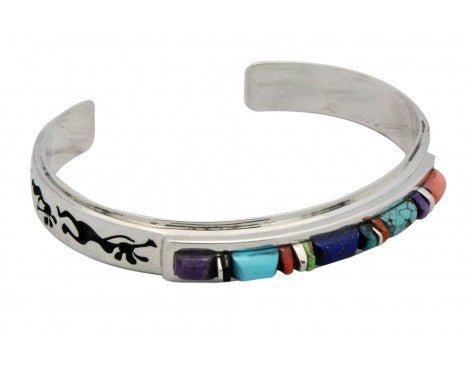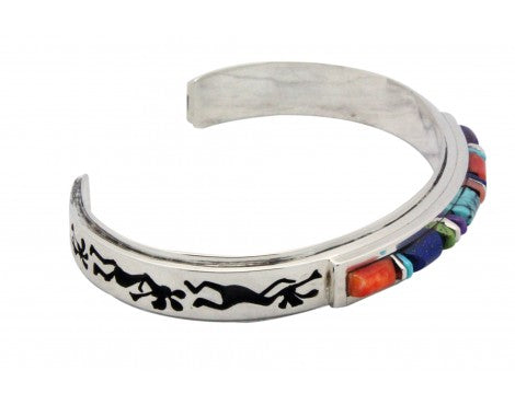 Steve Harper is the owner of Stone weaver. He has assembled a team of artisans that have mastered their craft to offer a line of handmade jewelry that combines a unique style with excellent craftsmanship. This beautiful bracelet by Navajo artist Cecil Ashley is a nice balance of stone and silver work. The center row of cobble inlaid stone showcases rich colored Mediterranean Croal, purple sugilite, Acoma Jet, blue lapis and turquoise. You will find the stones surrounded on each side by flute playing Kokopelli's. The narrow design is going to wear comfortably, and the solid silver will last for generations. Enjoy adding this easy to wear beauty to your collection of Native American art.
