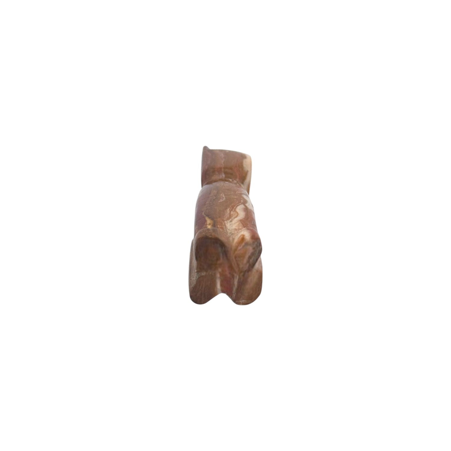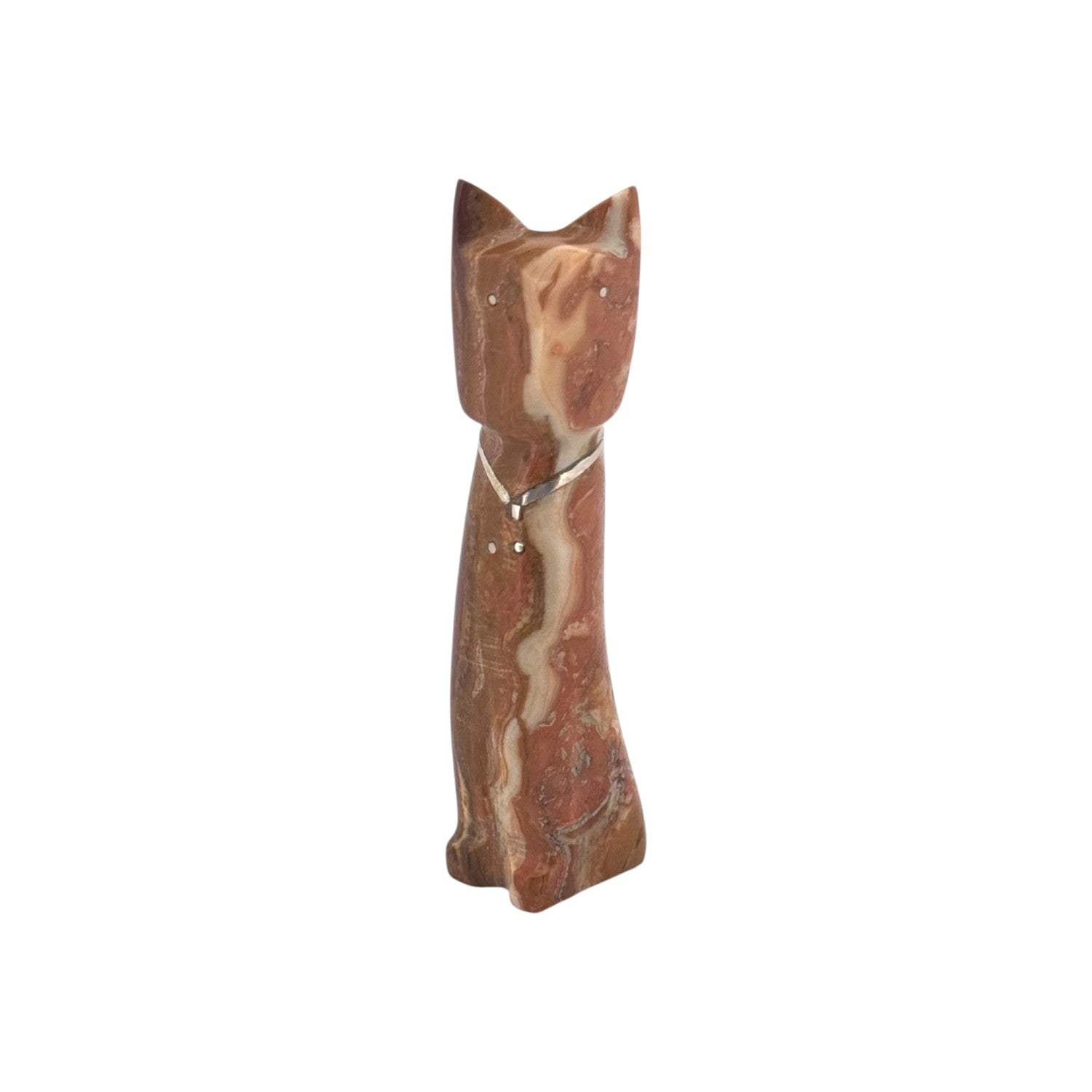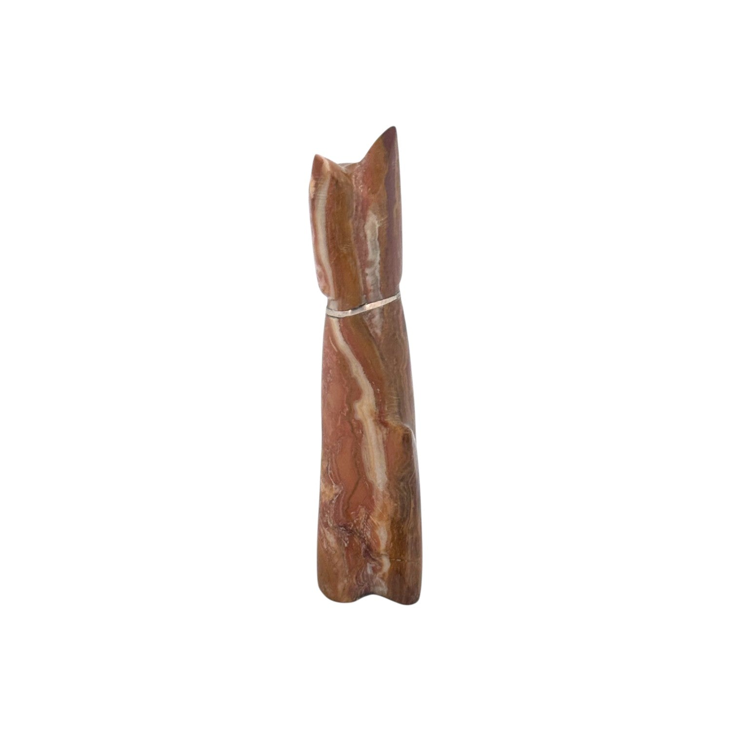 This sleek Zuni cat fetish by Kenny Chavez is hand-carved from rich picture jasper, a stone celebrated for its earthy tones and natural scenic patterns. The minimalist, elongated form of the cat captures its poised elegance and mysterious nature, while the pointed ears and upright posture suggest alertness and quiet strength. Subtle inlay details add a refined touch, highlighting the eyes and delicate collar that adorns its neck. In Zuni tradition, the cat is often seen as a symbol of independence, curiosity, and protection. The warm, striated hues of the picture jasper flow naturally through the carving, creating a one-of-a-kind pattern that makes each piece truly unique. Perfect for collectors and animal lovers alike, this fetish embodies both artistic sophistication and spiritual meaning.
