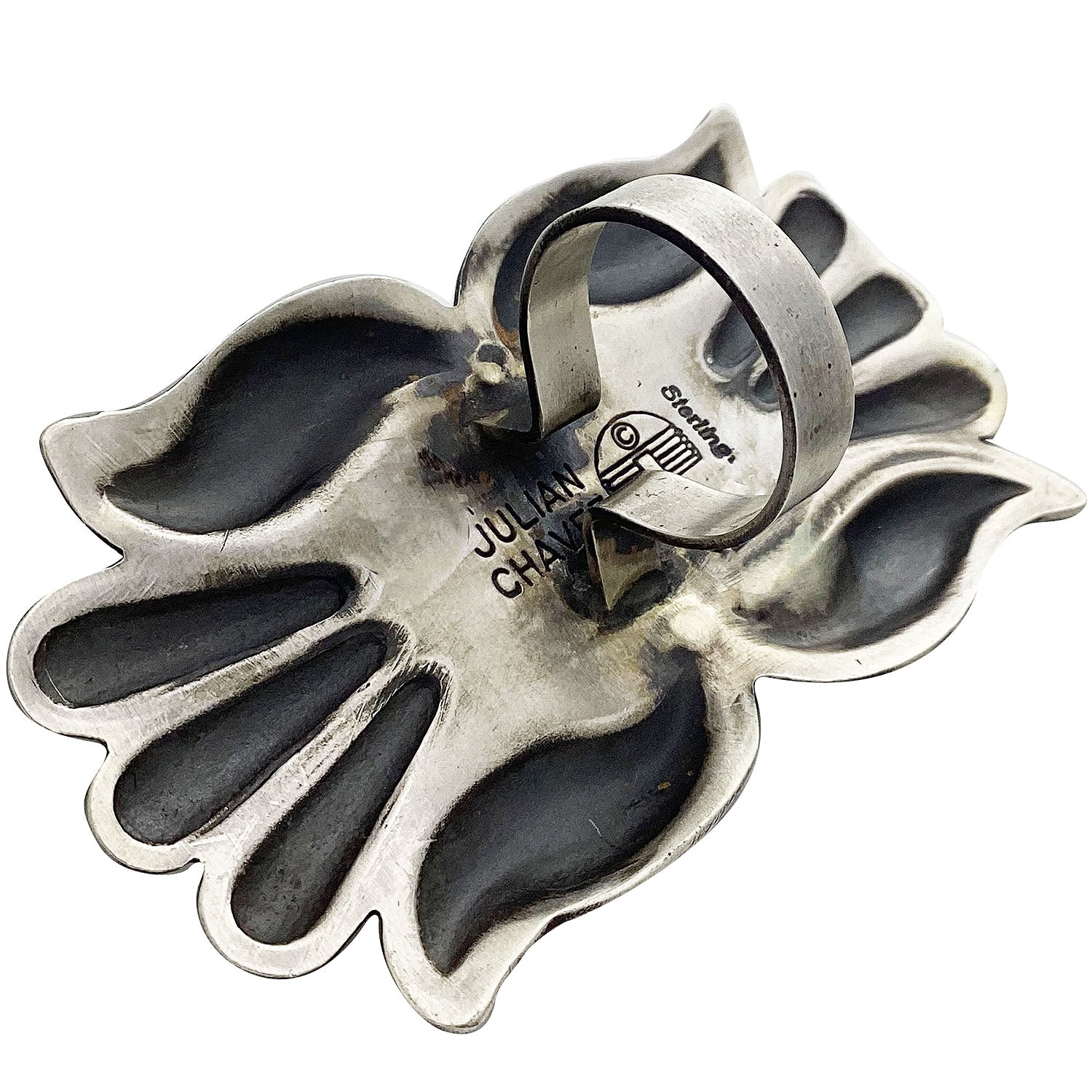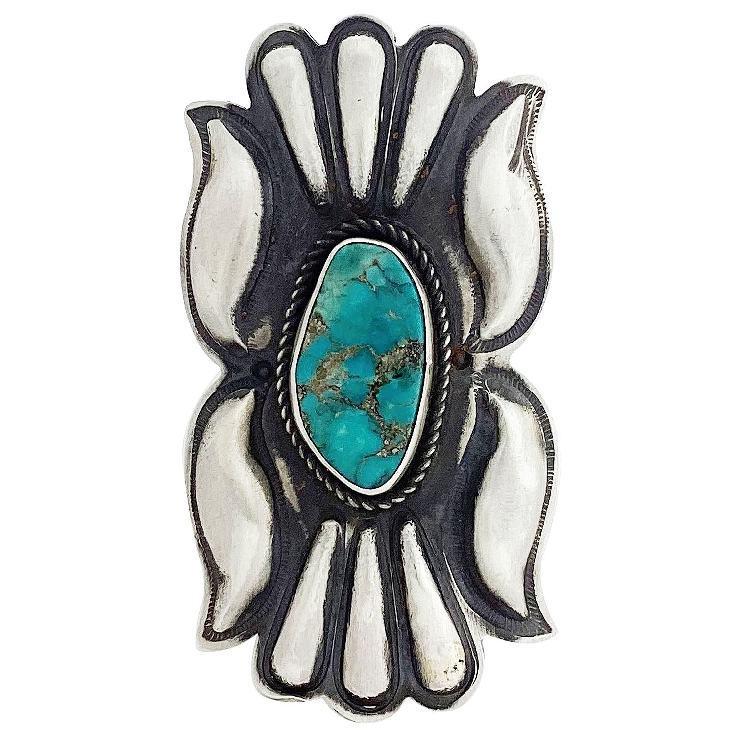 Sometimes you just need that piece of jewelry that you can wear daily. When your style is big stones and silver you naturally become a Navajo jewelry enthusiast. This stunning Arizona cut of Kingman Turquoise will draw you in. Navajo silversmith Julian Chavez has taken the stone and made a perfect setting. He has surrounded the rock with a thick bezel that radiates the deep blue of the turquoise. Along with the traditional Navajo stamp work and rustic brushed finish this is going to become your favorite. Don't worry about this one fitting because it has a comfortable adjustable band.