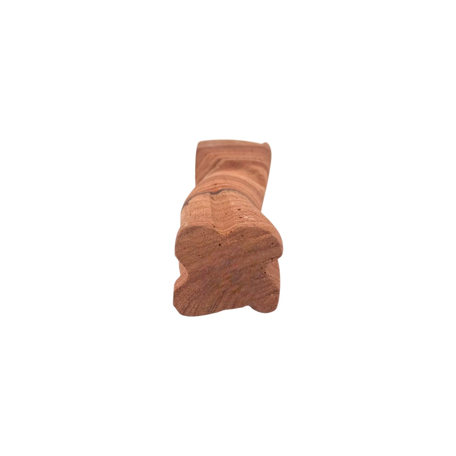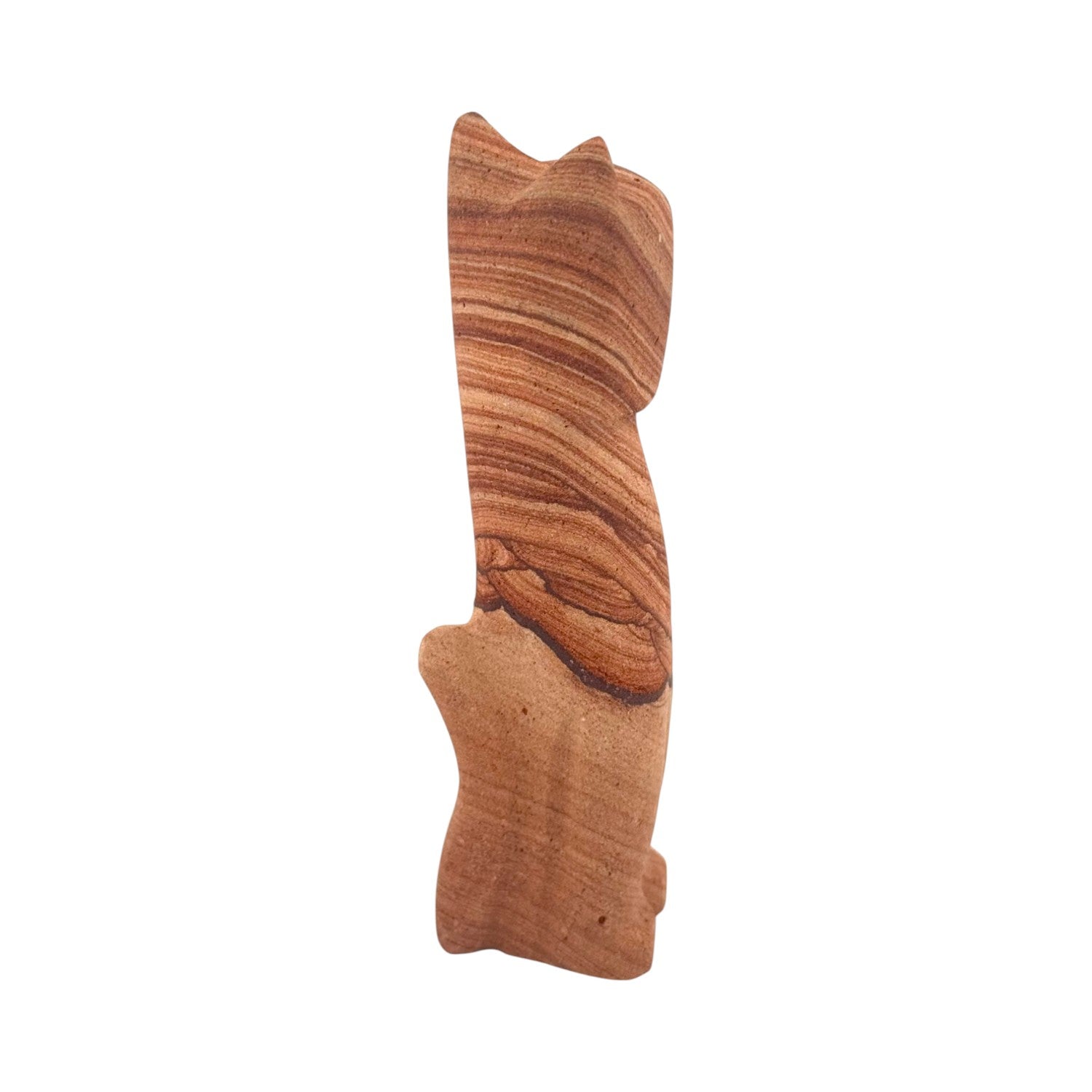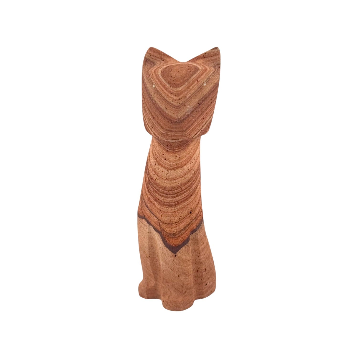 This charming Zuni hand-carved cat fetish by artisan Kenny Chavez is sculpted from richly patterned Banded Jasper. The natural striations of the stone flow seamlessly through the piece, creating warm earthy tones and graceful lines that highlight the feline’s sleek, upright posture. Symbolizing independence, intuition, and guardianship, the cat is a powerful and protective spirit animal in Zuni tradition. Chavez’s minimalist yet elegant carving style allows the stone’s inherent beauty to shine, giving the fetish both a modern appeal and deep cultural resonance. The smooth polish enhances the tactile quality, making it as pleasing to hold as it is to display. Ideal for collectors and admirers of Native American artistry, this piece captures the quiet strength and mysterious nature of the cat.