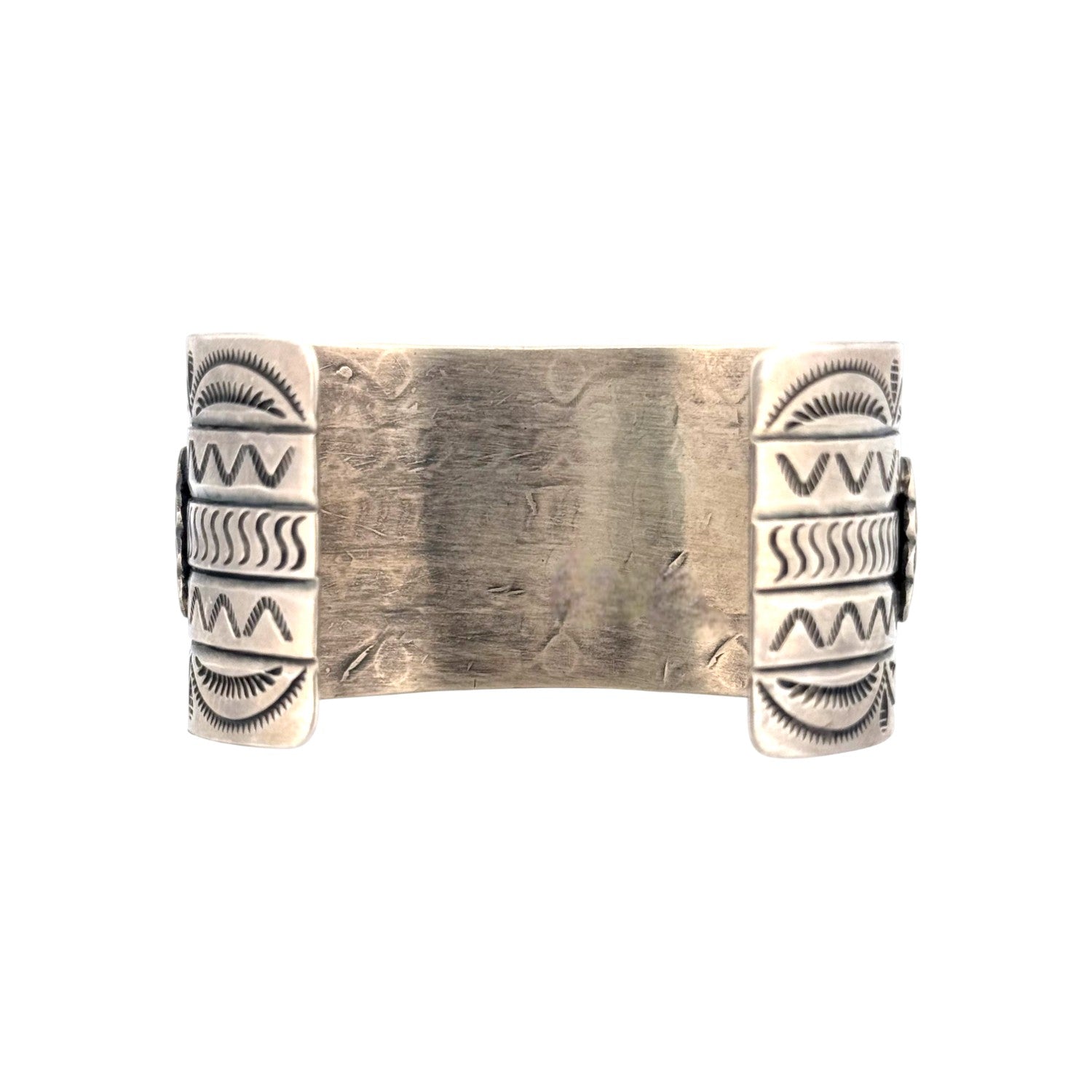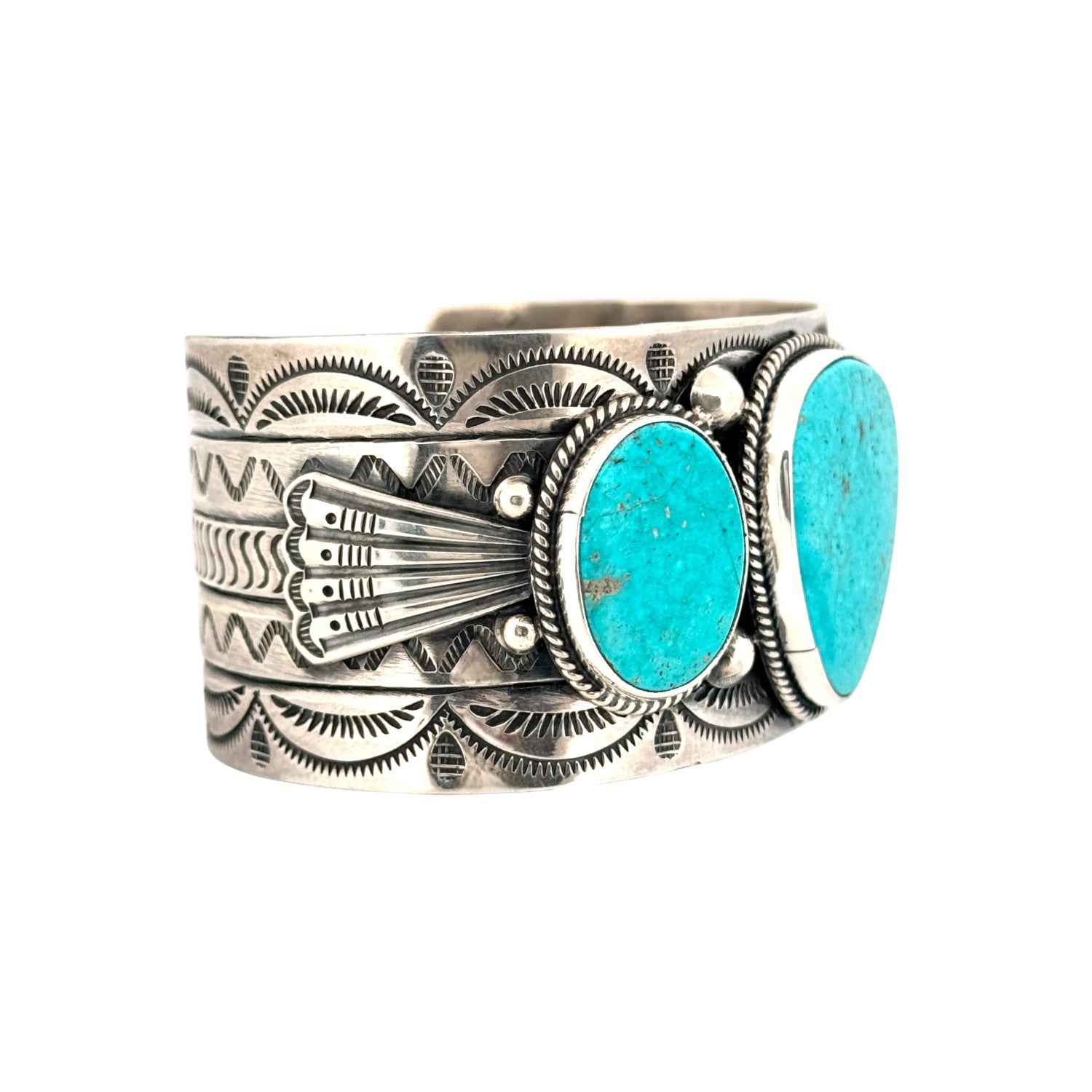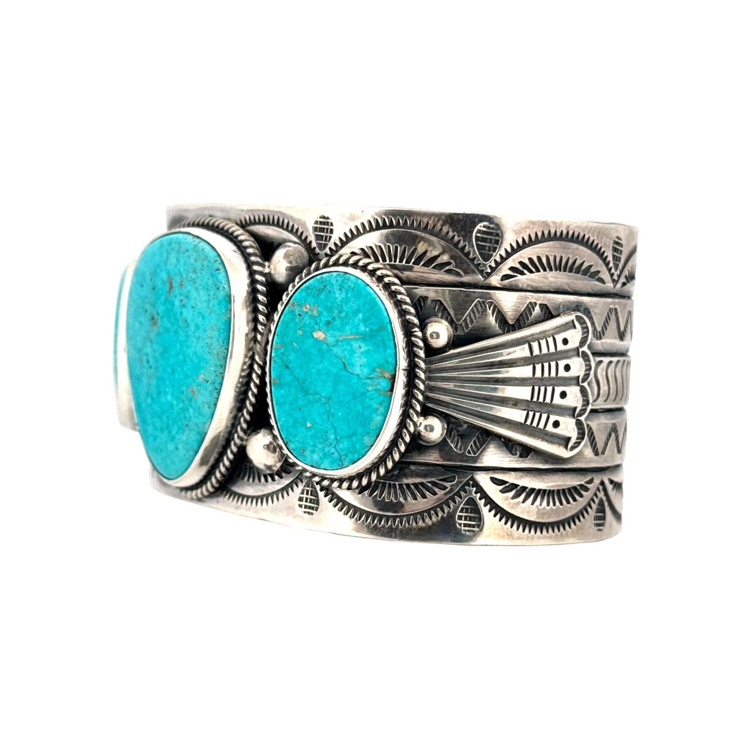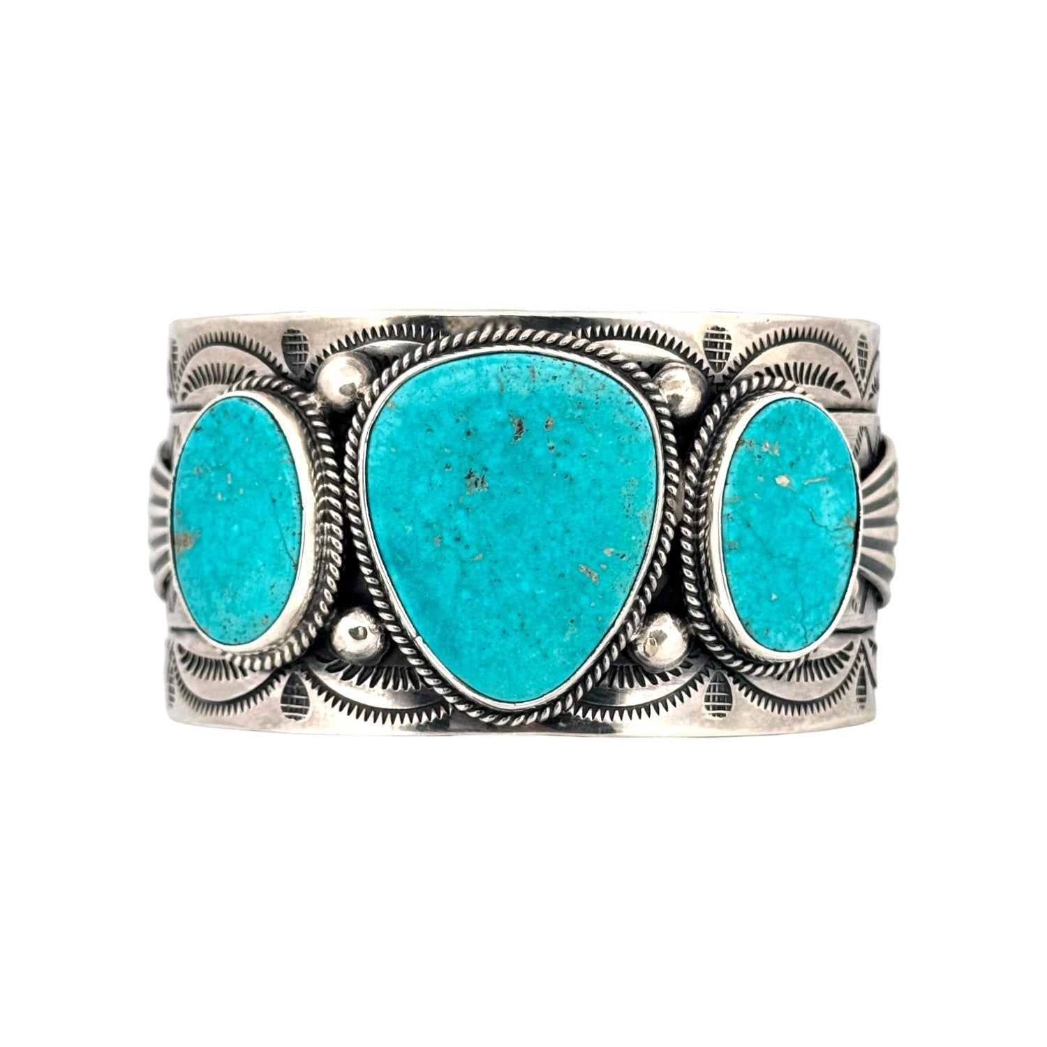 This Navajo bracelet by Lorraine Chee is a bold and elegant showcase of Fox Turquoise set in sterling silver. The wide cuff features three large turquoise cabochons, with a prominent center stone flanked by two smaller ovals, each displaying the signature green-blue tones and subtle matrix of Fox Turquoise. The stones are framed with twisted rope detailing and accented by silver drops, creating depth and dimension. Surrounding the turquoise, finely hand-stamped designs add texture and highlight the traditional artistry of Navajo silversmithing. The cuff’s weight and width give it a strong presence on the wrist, while the symmetry of the layout keeps the design balanced and refined. Lorraine Chee’s craftsmanship blends classic Navajo motifs with timeless beauty, making this bracelet both collectible and wearable.