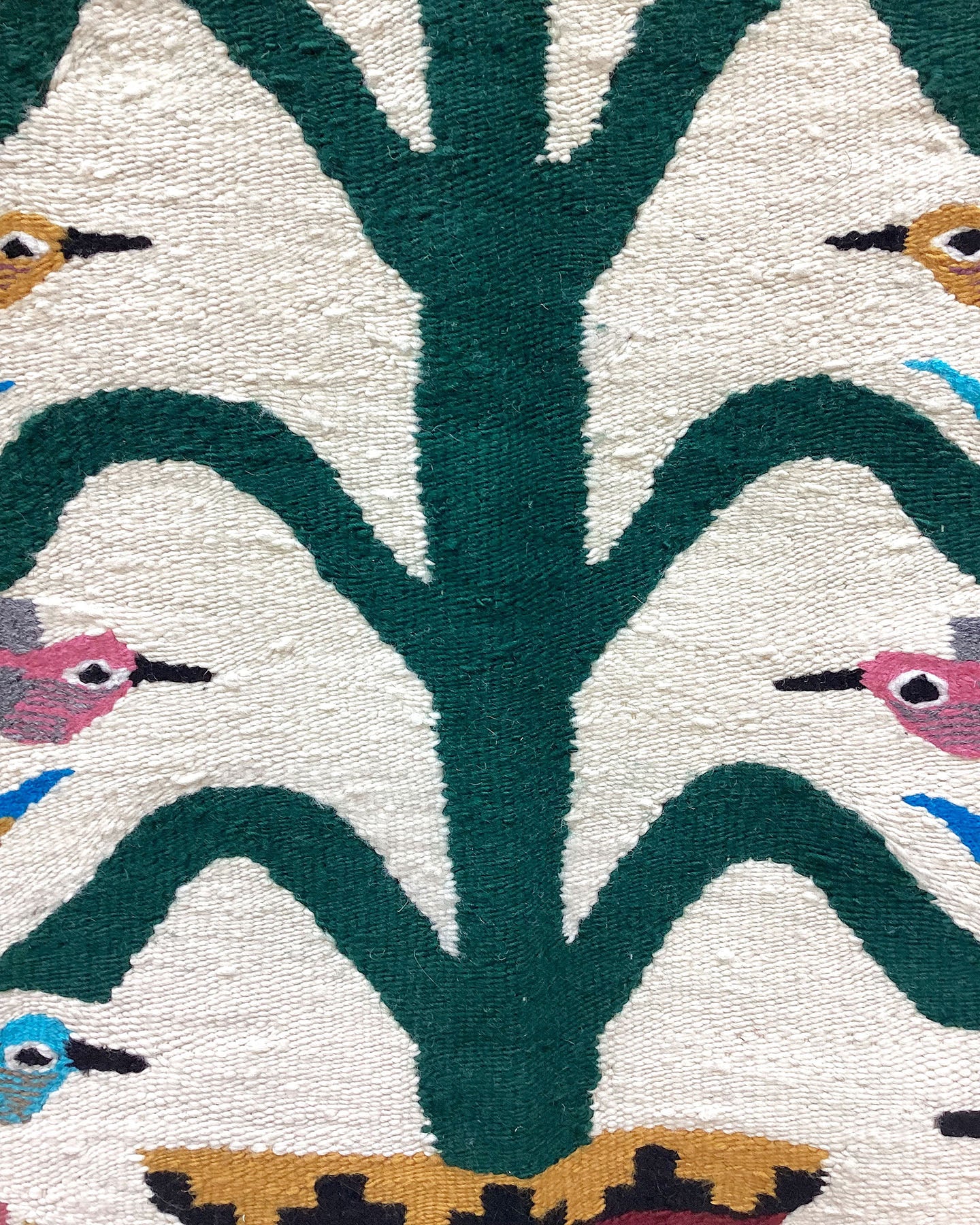From the beginning of recorded history man has revered trees as sacred symbols of creation, fertility, resurrection and immortality. With roots firmly planted in the earth, sturdy trunks and branches reaching to the sky, trees were believed to connect the three realms of existence: underworld, terrestrial and celestial. Since the days of Mesopotamia trees such as the palm, ash, beech, oak and pine have been viewed as ladders leading from the unconscious to enlightenment, sheltering canopies for all of creation, shamanic routes to knowledge and pillars between heaven and earth. The Tree of Life Navajo Rug, or Cosmic Tree, is associated with the sacred feminine, with springs, vegetation and life giving.