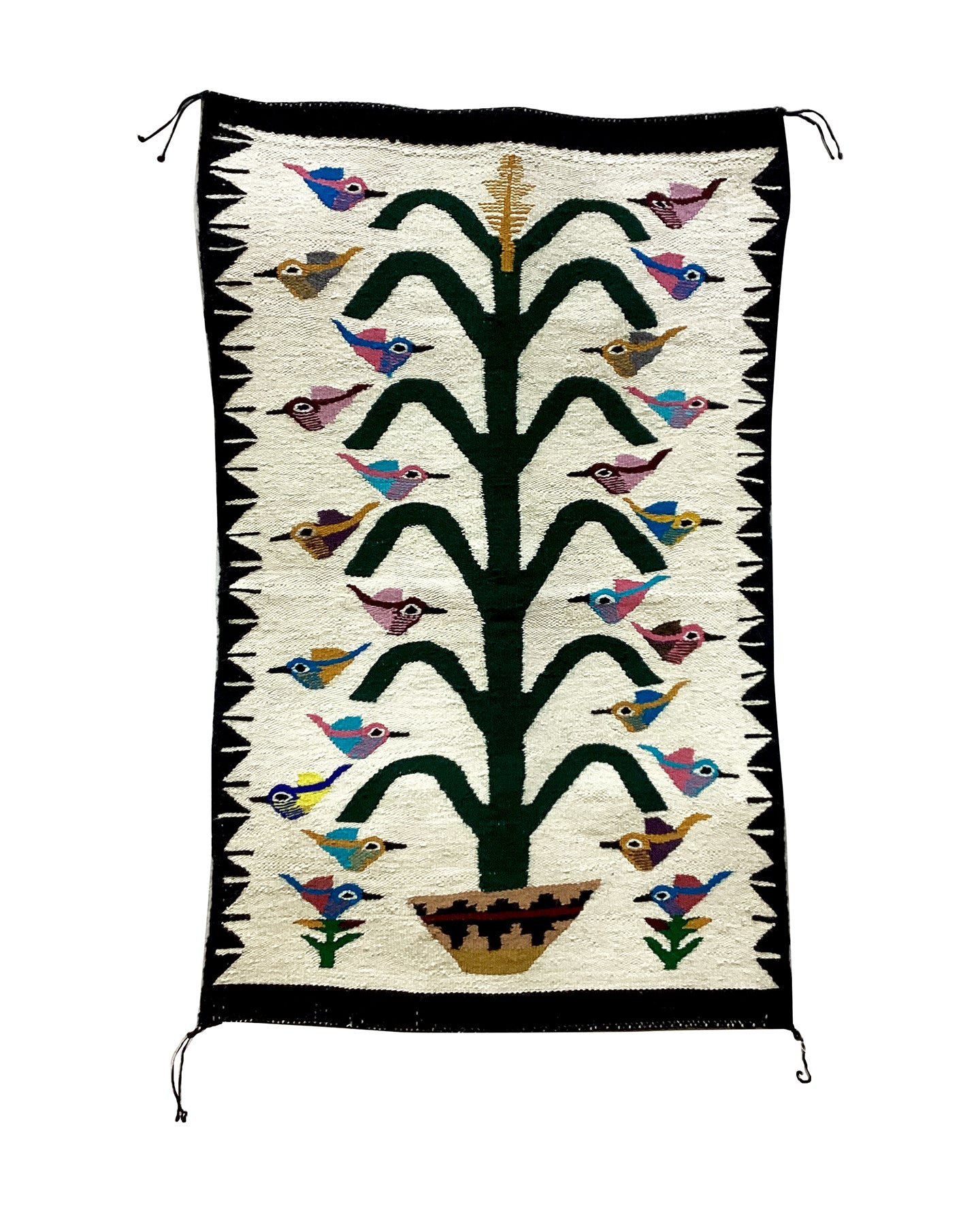 From the beginning of recorded history man has revered trees as sacred symbols of creation, fertility, resurrection and immortality. With roots firmly planted in the earth, sturdy trunks and branches reaching to the sky, trees were believed to connect the three realms of existence: underworld, terrestrial and celestial. Since the days of Mesopotamia trees such as the palm, ash, beech, oak and pine have been viewed as ladders leading from the unconscious to enlightenment, sheltering canopies for all of creation, shamanic routes to knowledge and pillars between heaven and earth. The Tree of Life Navajo Rug, or Cosmic Tree, is associated with the sacred feminine, with springs, vegetation and life giving.