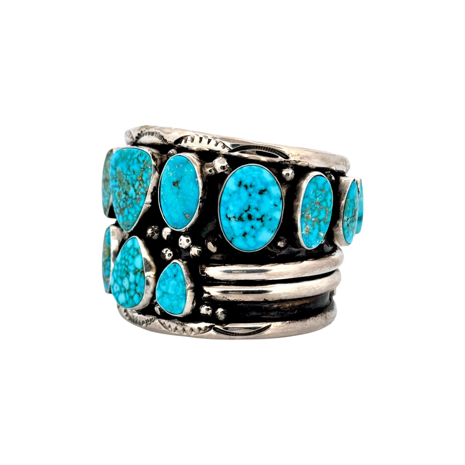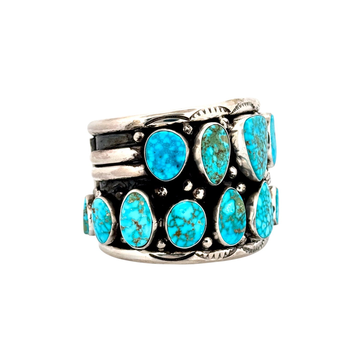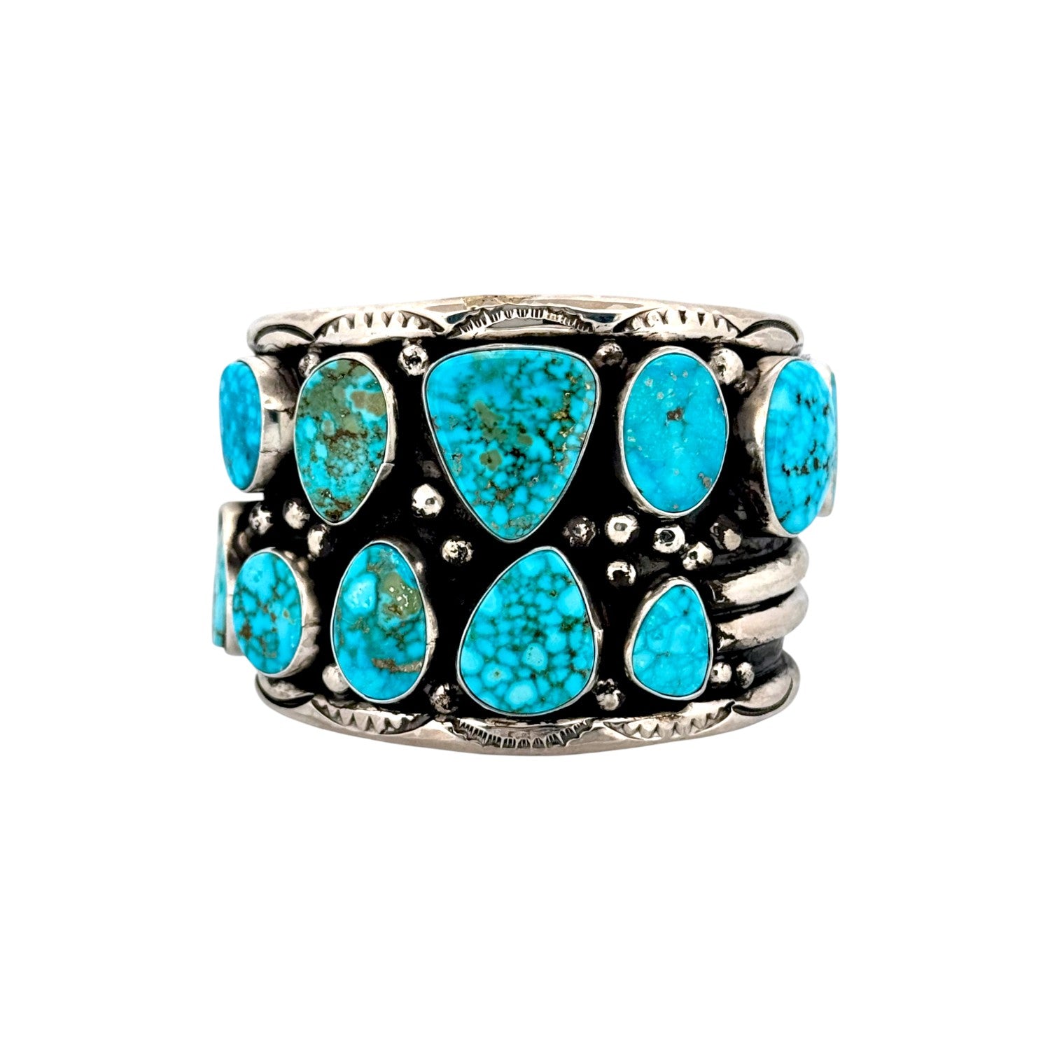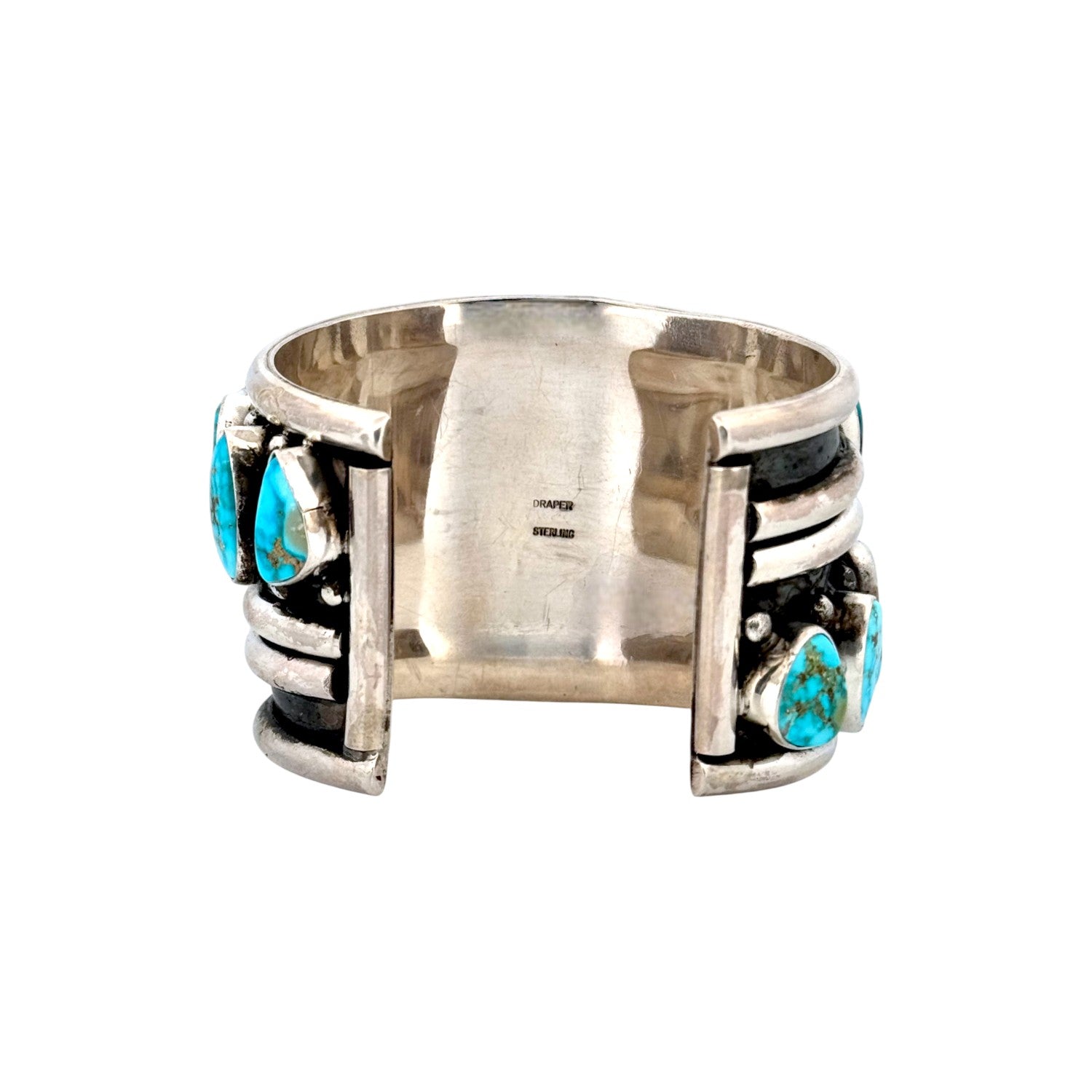This sterling silver bracelet by Joelias Draper is a powerful showcase of Navajo handmade artistry. The wide cuff is set with multiple hand-cut stones of Water web Kingman Turquoise, each displaying brilliant blue hues with intricate dark matrix patterns. The stones are arranged in a bold cluster design, framed by sterling silver raindrop accents and stamped edges that add depth and texture. The contrast between the polished turquoise and oxidized silver background highlights the natural beauty of the stones. Strong and substantial, this bracelet carries a commanding presence while honoring traditional Navajo silversmithing techniques. Joelias Draper’s craftsmanship reflects both cultural heritage and artistic vision, blending natural materials with masterful silverwork.