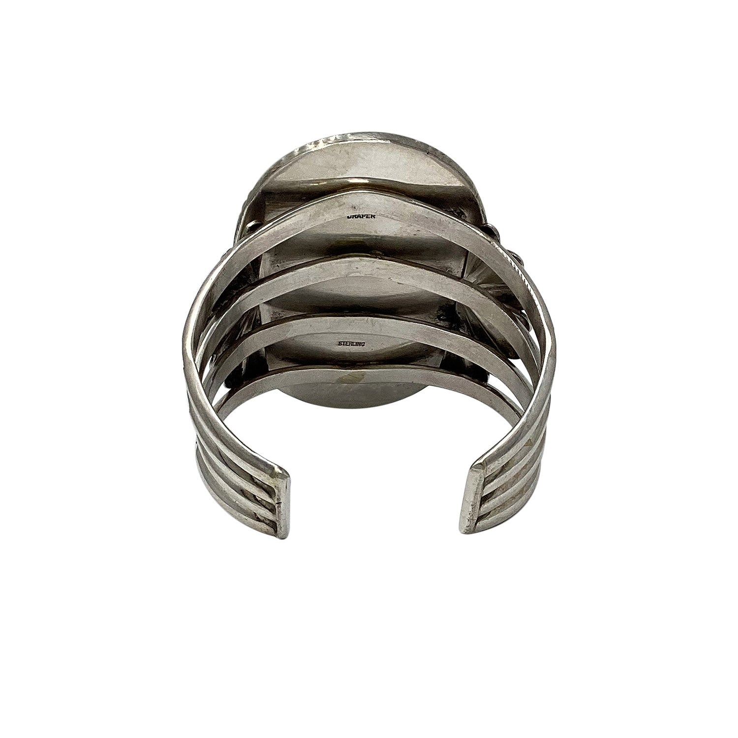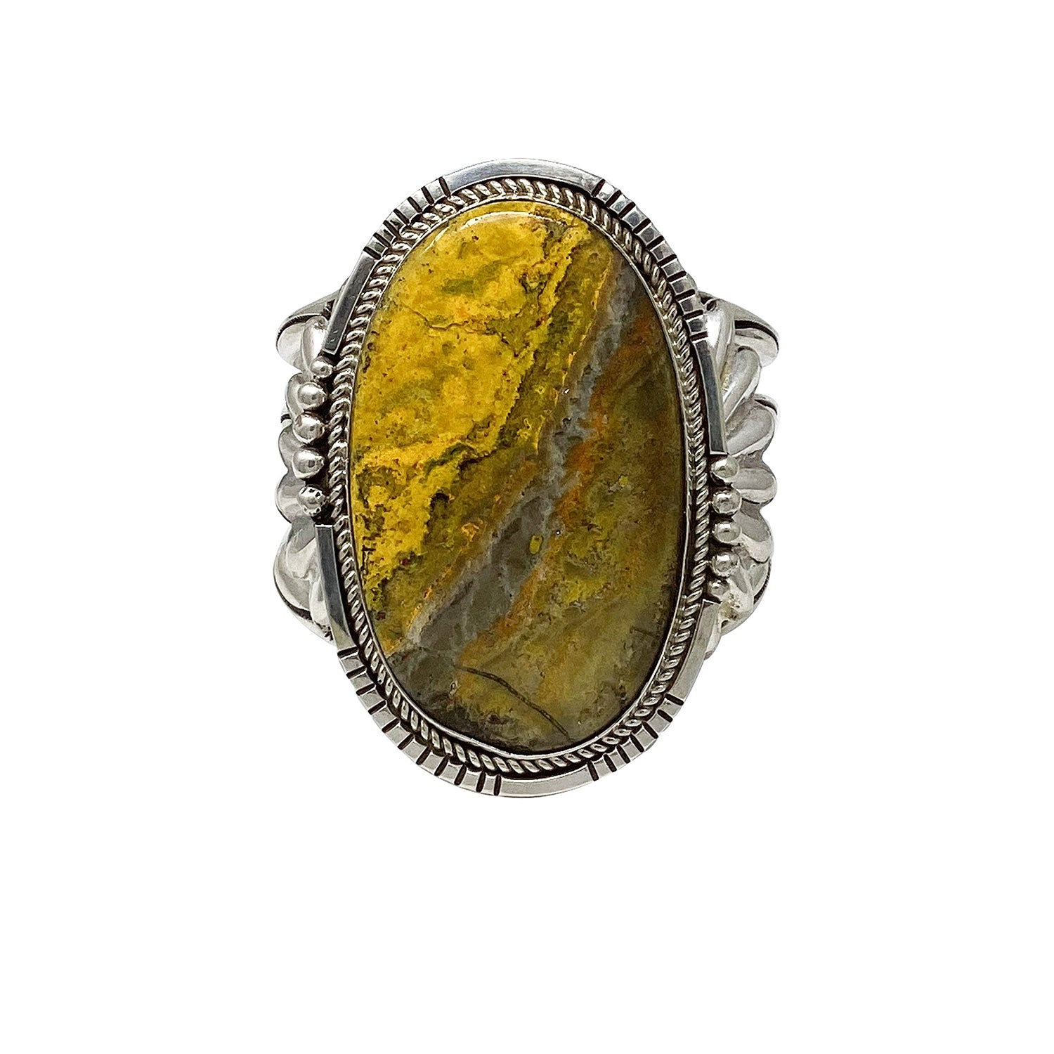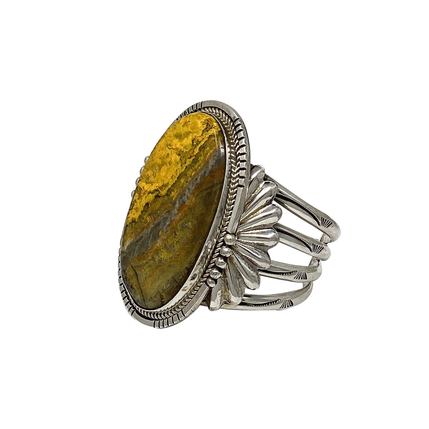 Navajo artist Joelias Draper makes the Trading Post a wide variety of beautiful silver and stone pieces. This wide bracelet is an absolute stunning piece that begins with a fabulous stone. The bright colored piece of Bumble Bee Jasper is filled with that signature yellow, gray and black color. Joelias dresses up the stone in a modern style silver setting that is filled with stamp work. The bracelet is a big piece and is going to be worn beautifully. Check out other Joelias creations in the online Trading Post.