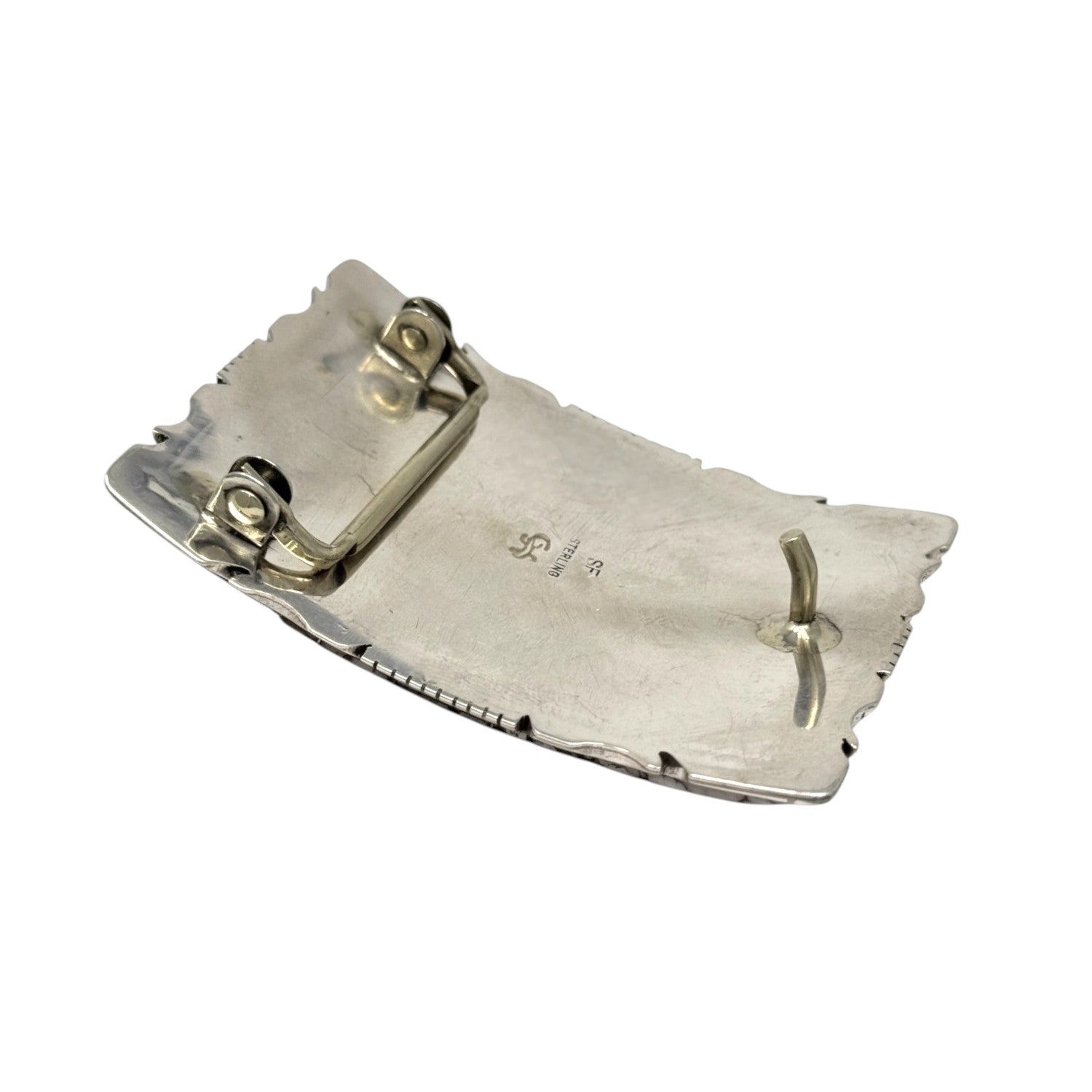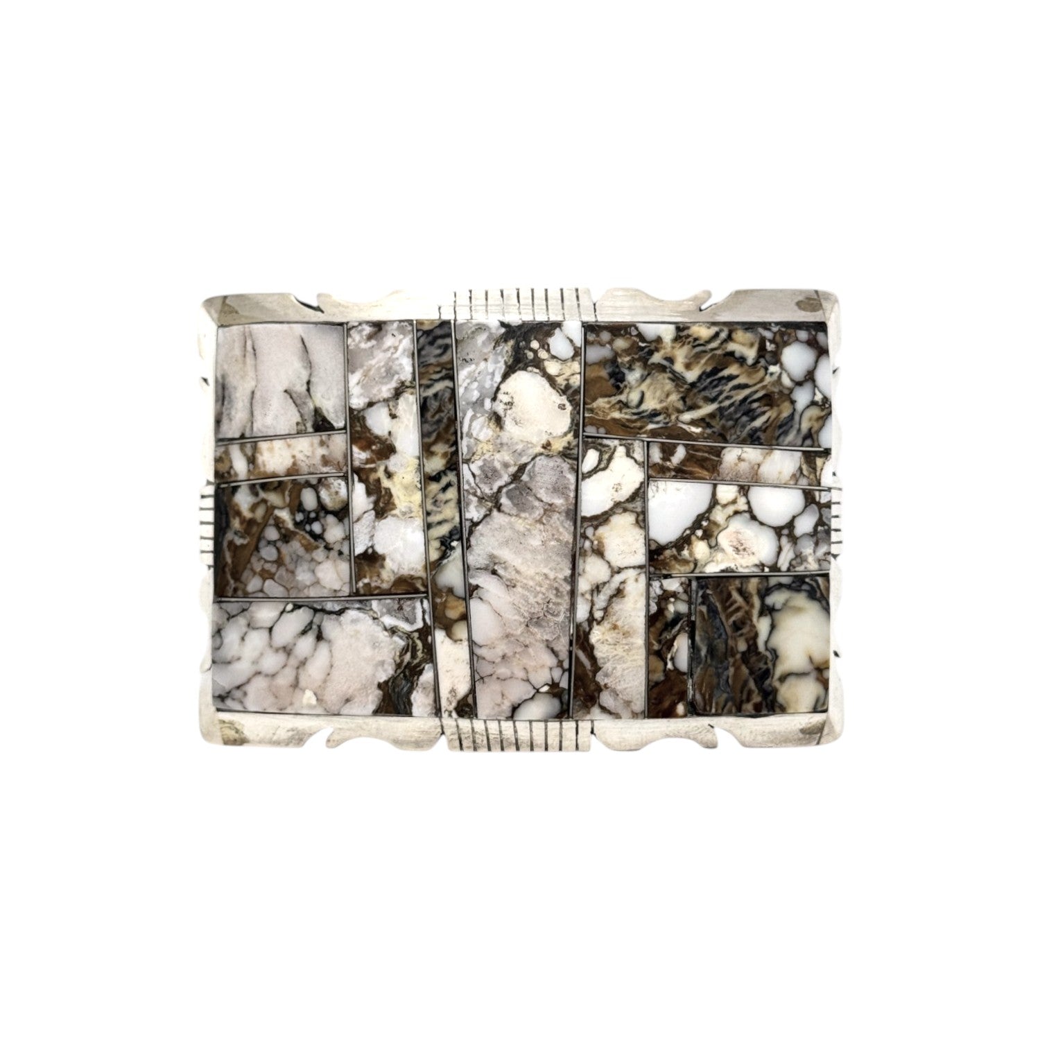 Handcrafted by Navajo artisan Steve Francisco, this sterling silver buckle showcases the distinctive beauty of Wild Horse Turquoise in a bold, contemporary inlay design. The stone’s natural blend of white, brown, and chocolate tones is meticulously cut and fitted into a geometric mosaic, creating a striking visual rhythm across the piece. Each segment is perfectly set within polished silver channels, reflecting Francisco’s precision and dedication to his craft. The scalloped edges and linear silver accents add depth and structure, enhancing the buckle’s modern yet traditionally rooted aesthetic. Entirely handmade, this piece is a unique expression of Navajo artistry, where the organic beauty of the stone meets masterful silversmithing.