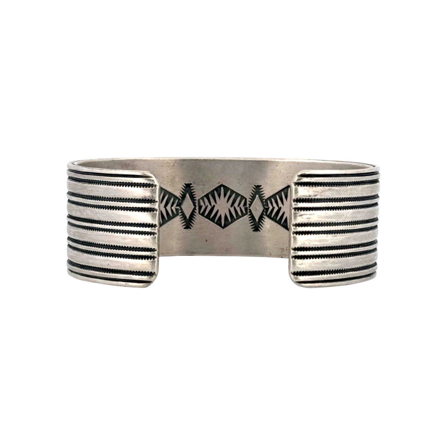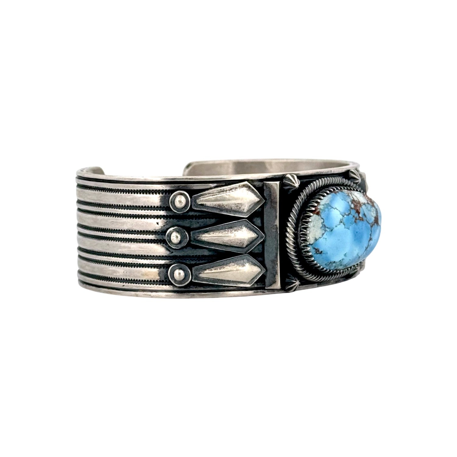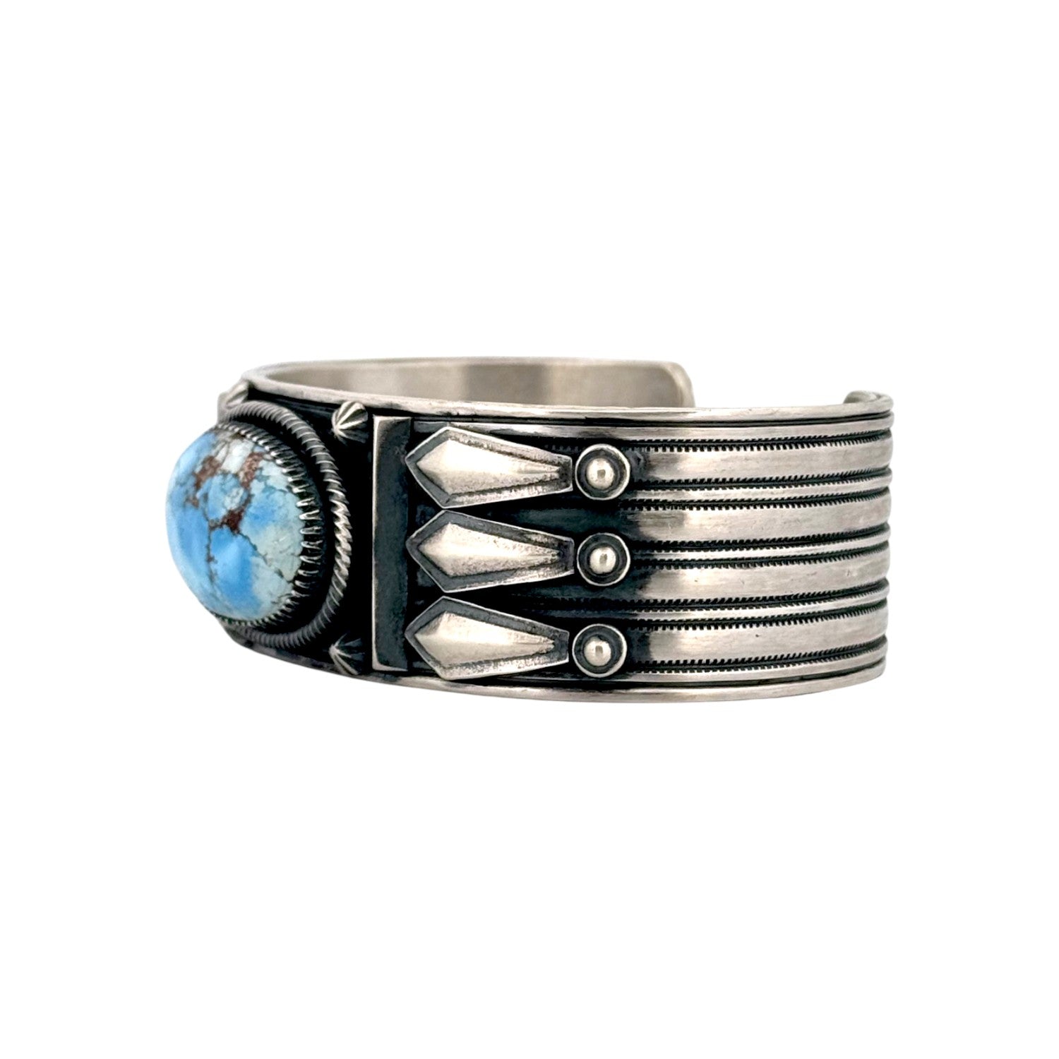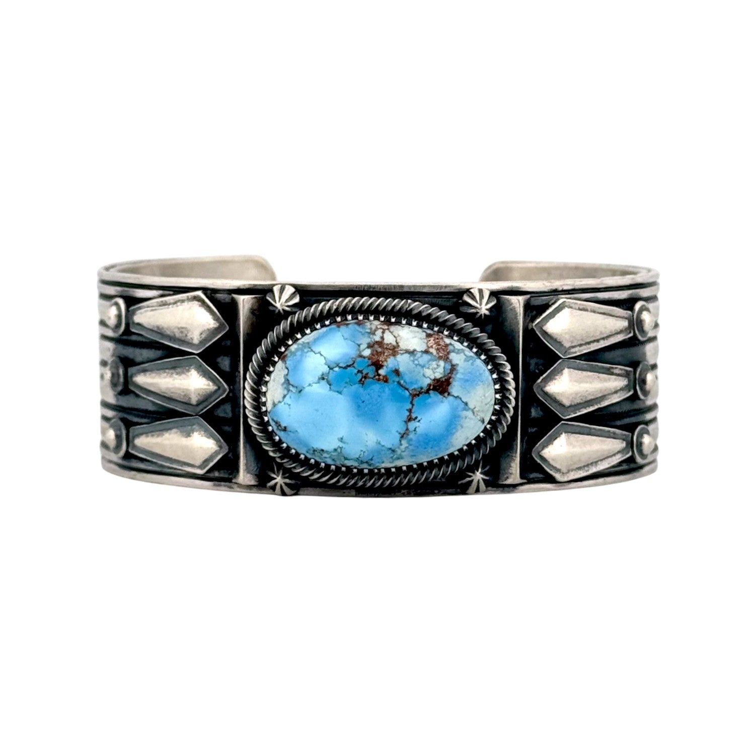 This sterling silver bracelet by Derrick Gordon is a masterful example of Navajo handmade craftsmanship. The centerpiece features a striking Golden Hills Turquoise stone, known for its soft sky-blue hues with delicate brown matrix, set in a traditional rope bezel. The wide cuff is adorned with bold hand-stamped designs, including geometric arrow motifs and star accents, symbolizing strength and guidance. Oxidized silver backgrounds bring depth and contrast, allowing the raised patterns and turquoise to stand out prominently. Substantial in both weight and presence, this bracelet is a powerful statement piece that carries the strength of traditional Navajo artistry. Derrick Gordon expert silversmithing reflects cultural heritage while embracing bold, contemporary design.