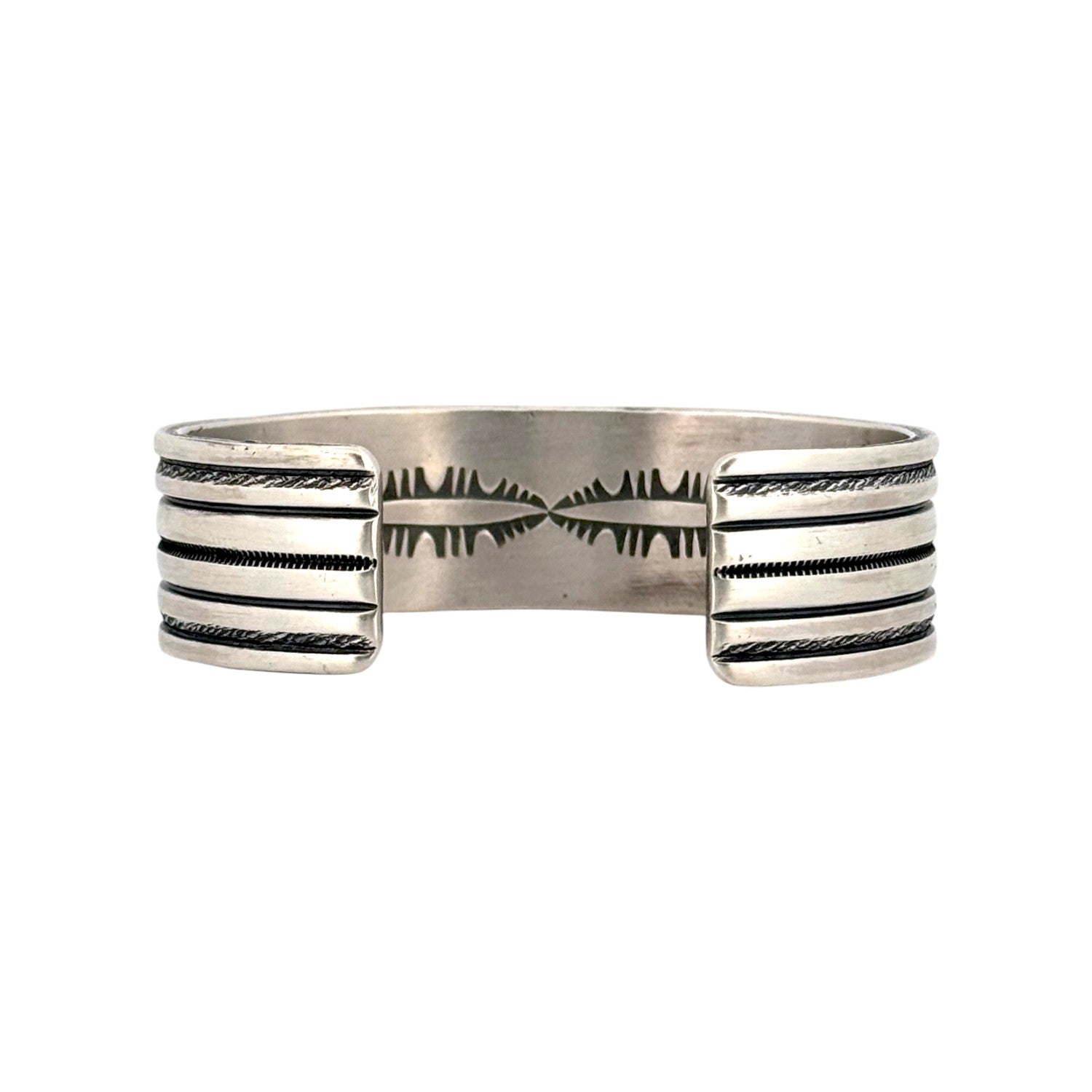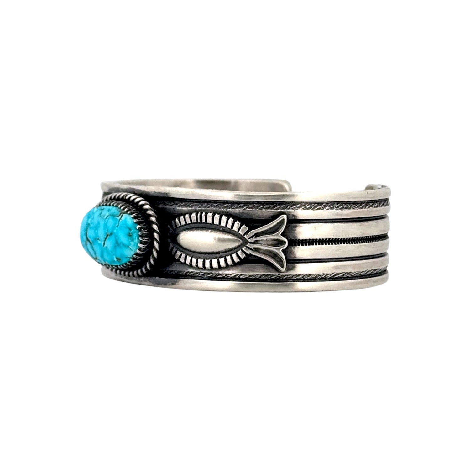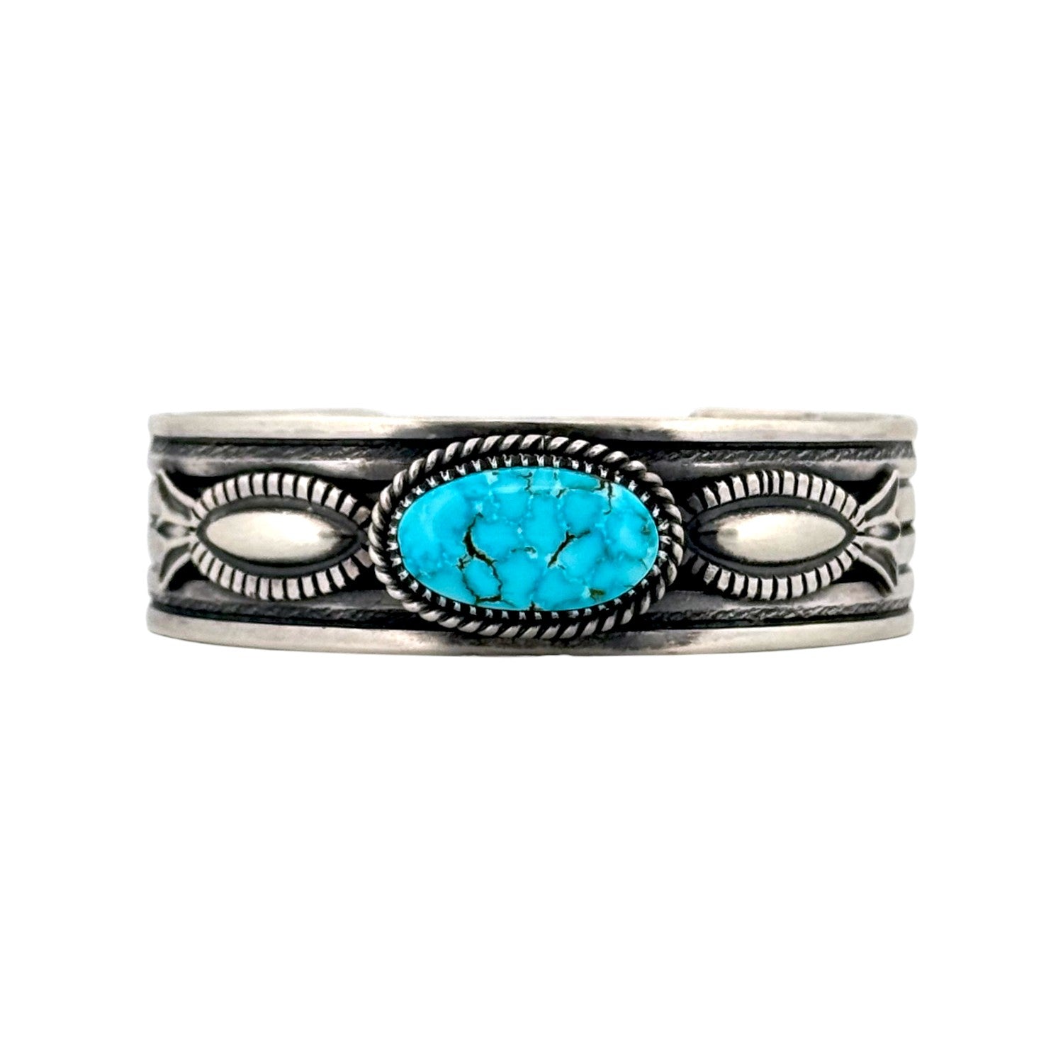 This exquisite bracelet by Navajo silversmith Derrick Gordon showcases the timeless beauty of Water web Kingman Turquoise set in sterling silver. The striking blue stone, veined with its characteristic dark matrix, sits at the center in a finely detailed, hand-twisted bezel. Surrounding the Turquoise are bold silver stamp work and raised oval accents, creating a balanced and elegant design rooted in traditional Navajo artistry. The oxidized background enhances the depth and contrast of the silverwork, giving the bracelet a vintage and dimensional appeal. Carefully handcrafted, it reflects both strength and refinement, making it a versatile piece for everyday wear or special occasions. The wide cuff design offers presence and comfort, while the turquoise centerpiece adds a vibrant touch of Southwestern heritage.