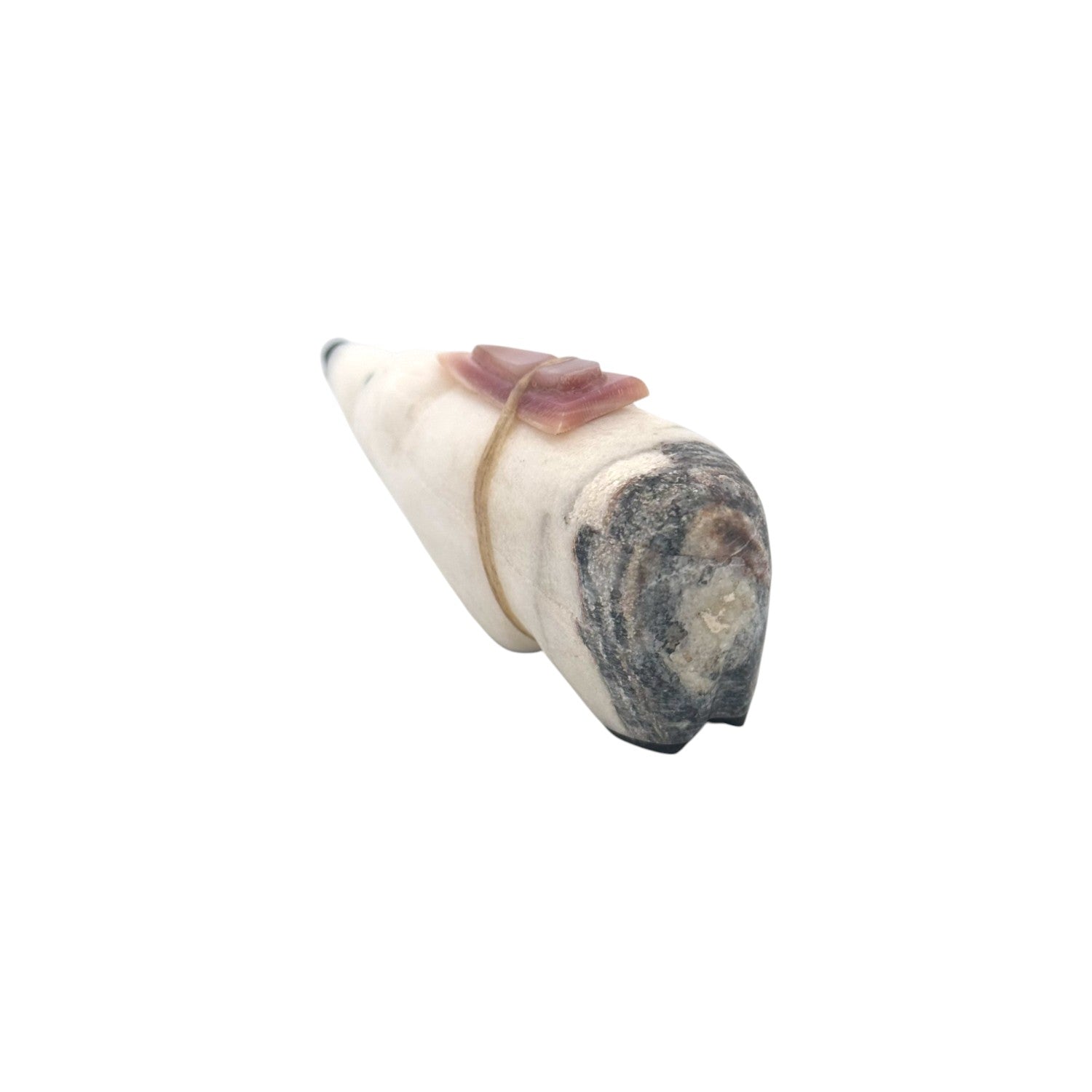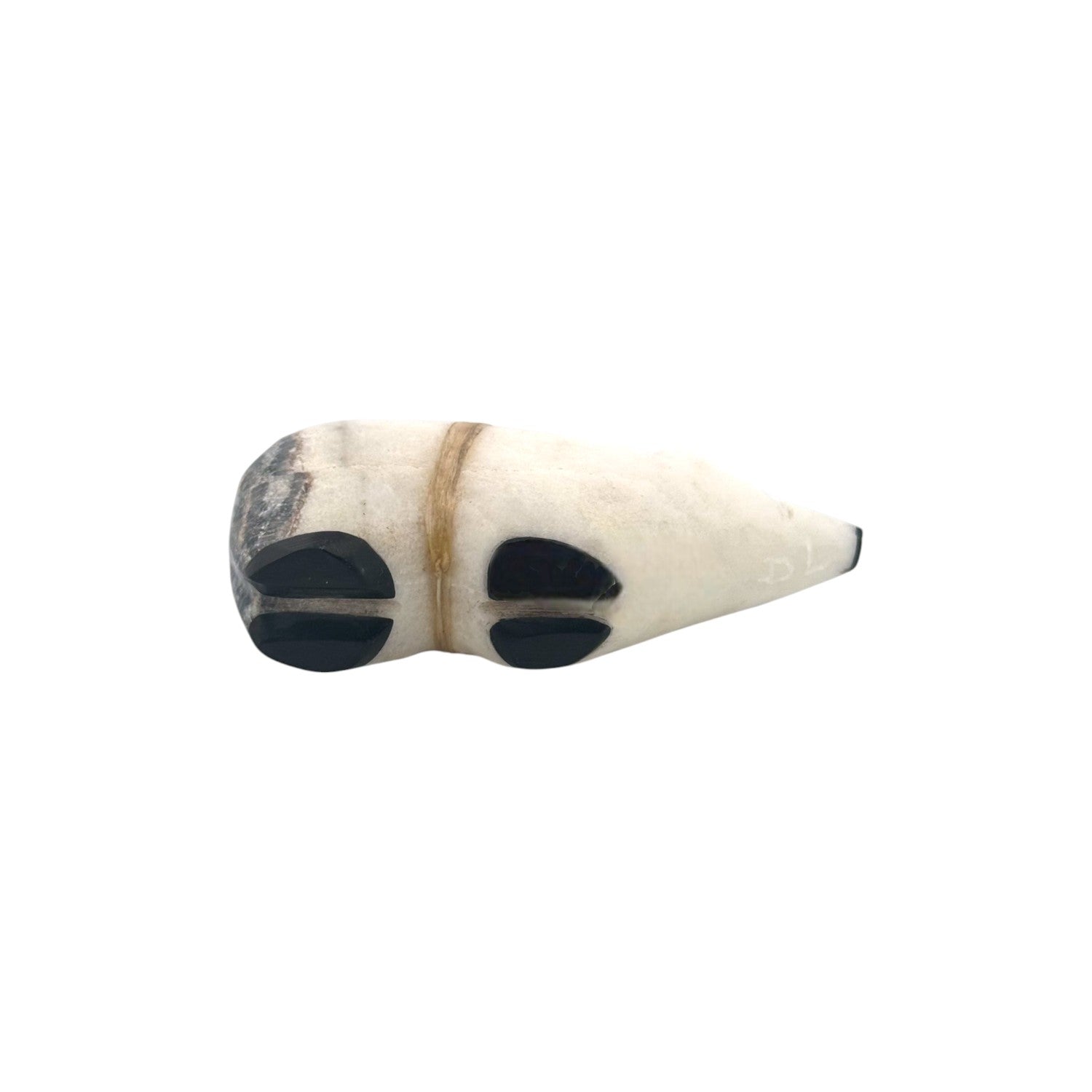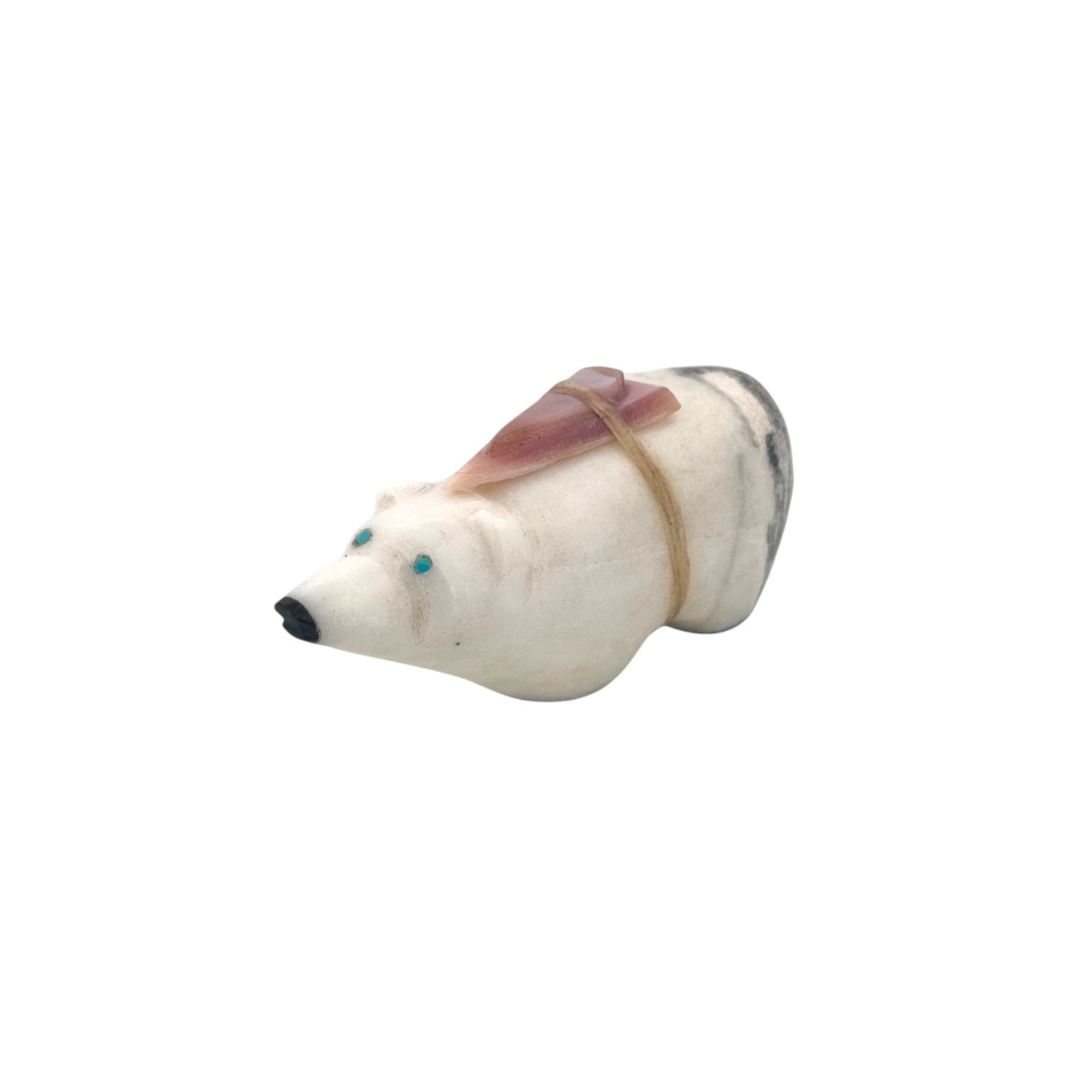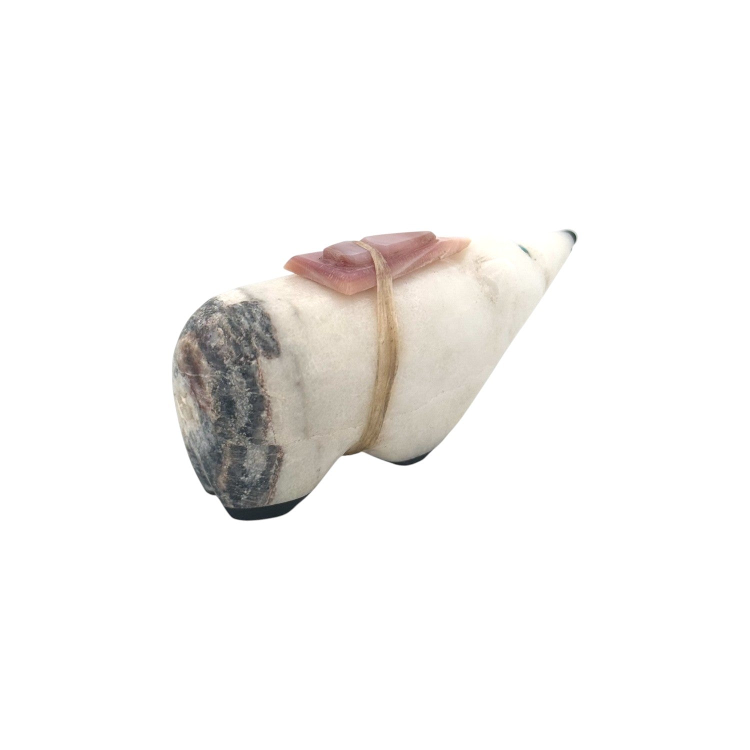 This Zuni hand-carved polar bear fetish by Waldo Davis is masterfully shaped from luminous White Marble, accented with delicate grey veining that evokes the icy landscapes of its inspiration. The polar bear, a symbol of endurance, spiritual strength, and survival, is depicted in a sleek, streamlined form with a calm yet determined expression. Turquoise inlay eyes bring a vivid spark of life to the carving, while the black-painted snout adds striking definition. Resting across its back is a traditional offering bundle of shell, secured with sinew; a gesture of honor to the spirit of the animal. The smooth polish highlights the natural beauty of the marble, creating a tactile elegance that invites closer appreciation. In Zuni tradition, bears are regarded as powerful protectors and healers, with the polar bear embodying wisdom and adaptability in harsh environments.